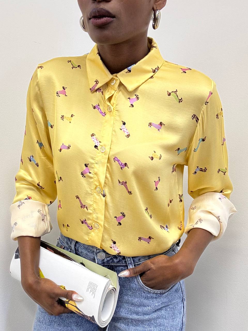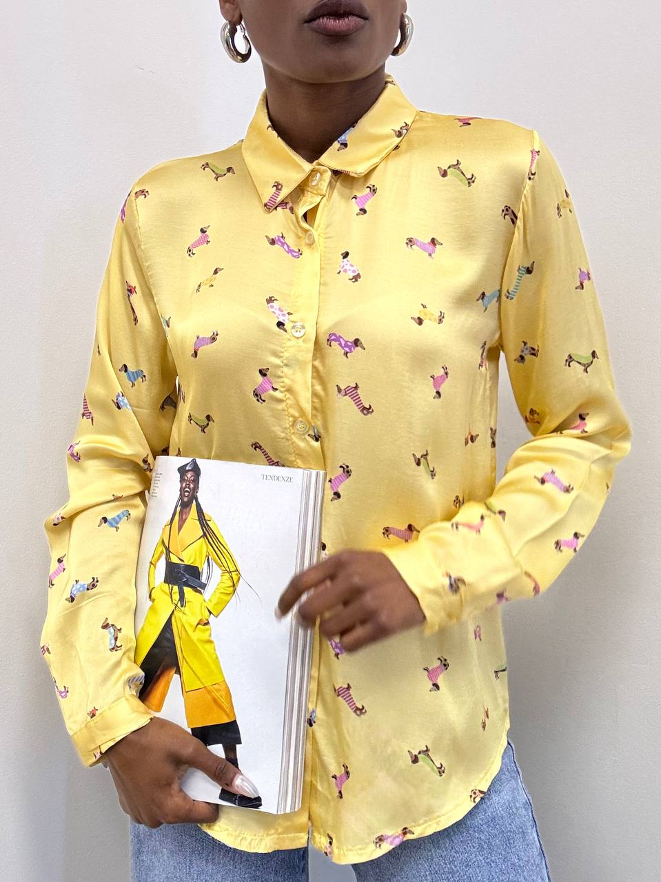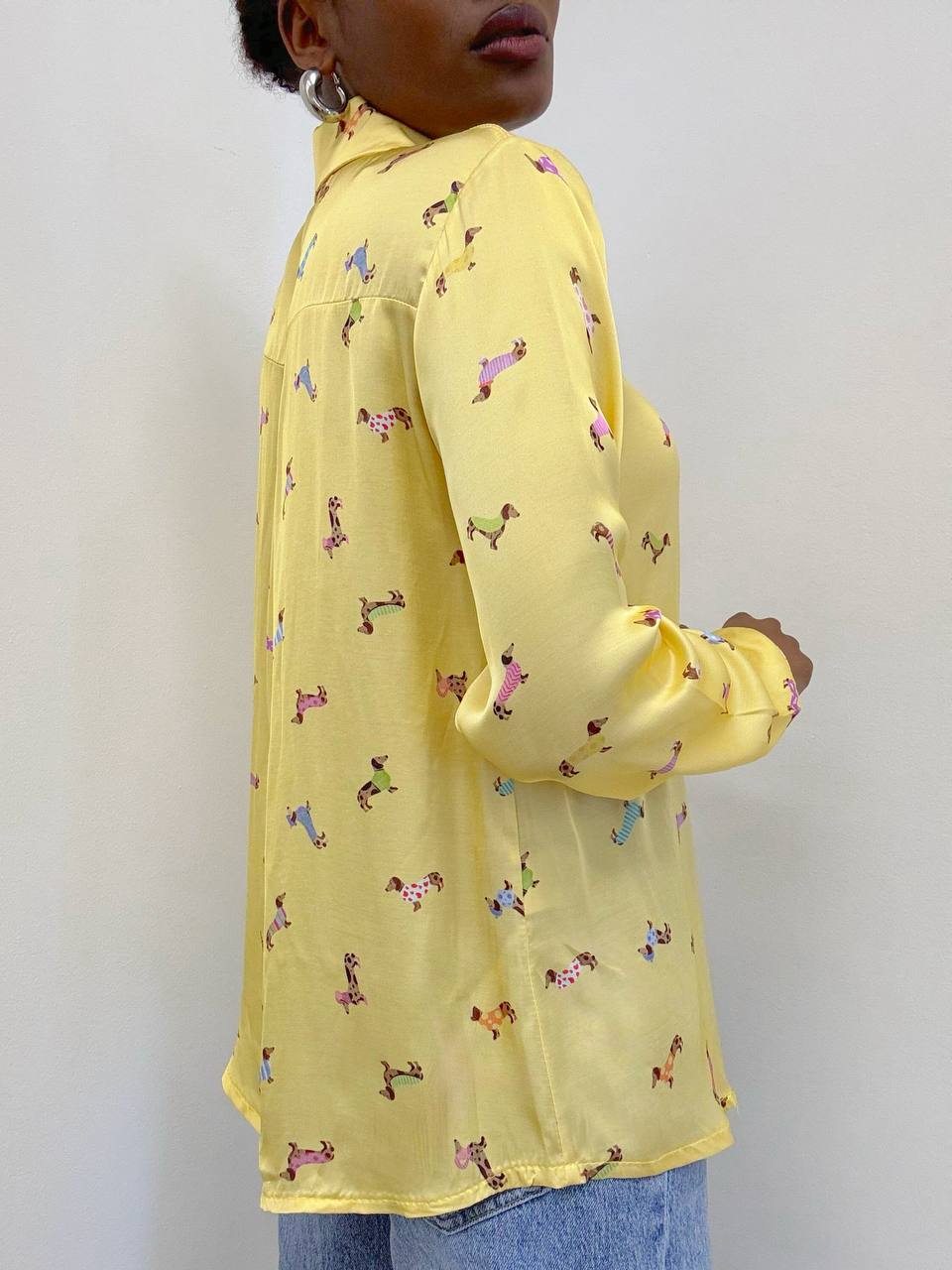 Su tutta la lunghezza del capo si sviluppa una stampa all-over di bassotti stilizzati: piccoli, allungati e dinamici, si rincorrono in diverse pose creando un motivo vivace ma armonioso. I dettagli dei cagnolini possono variare tra linee sottili e colori contrastanti oppure tonalità più delicate tono su tono, per un effetto sofisticato ma originale.