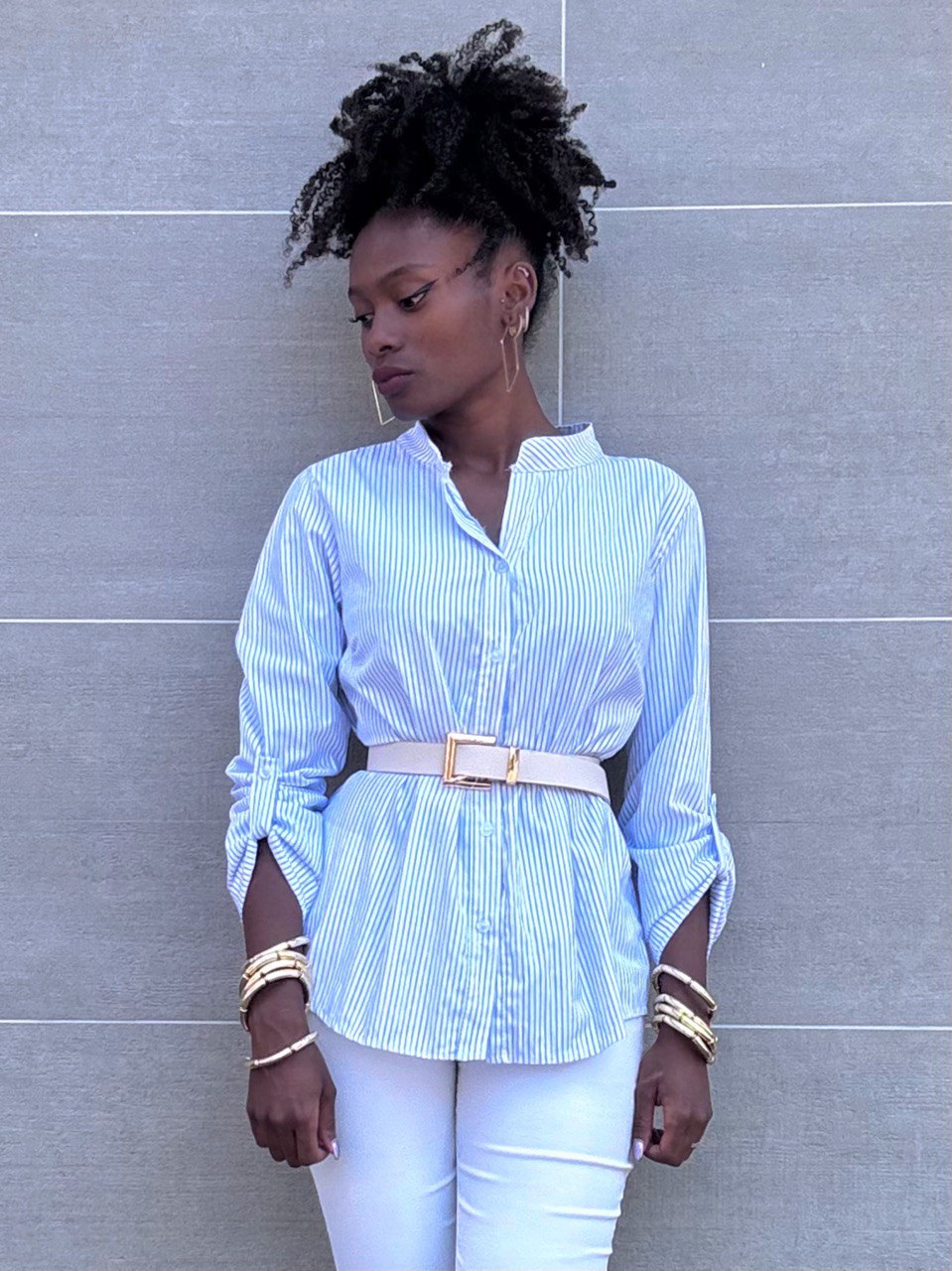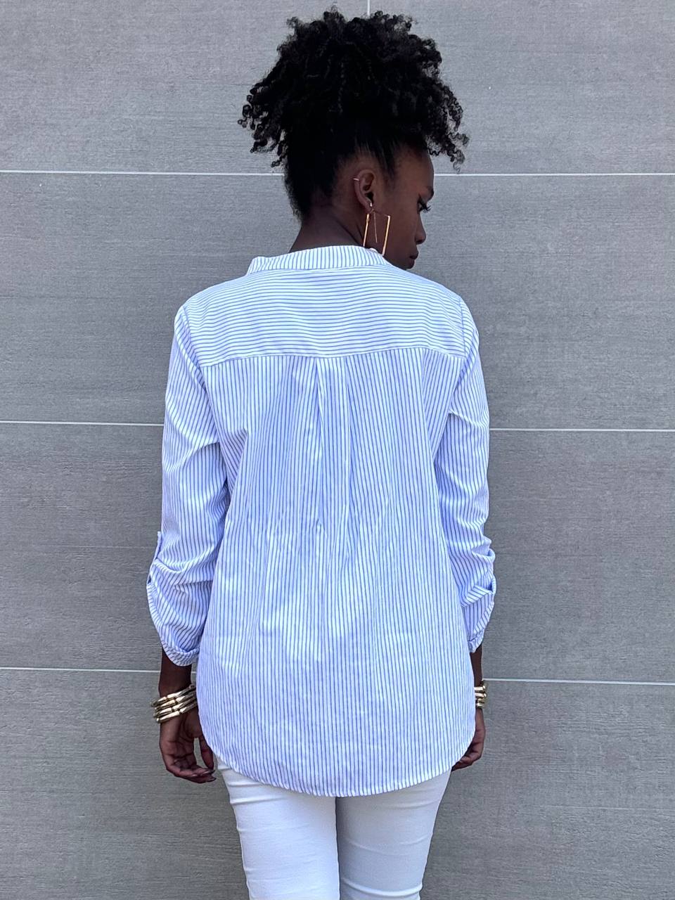 Camicia bastonetto con collo alla coreana con manica a tre quarti.
