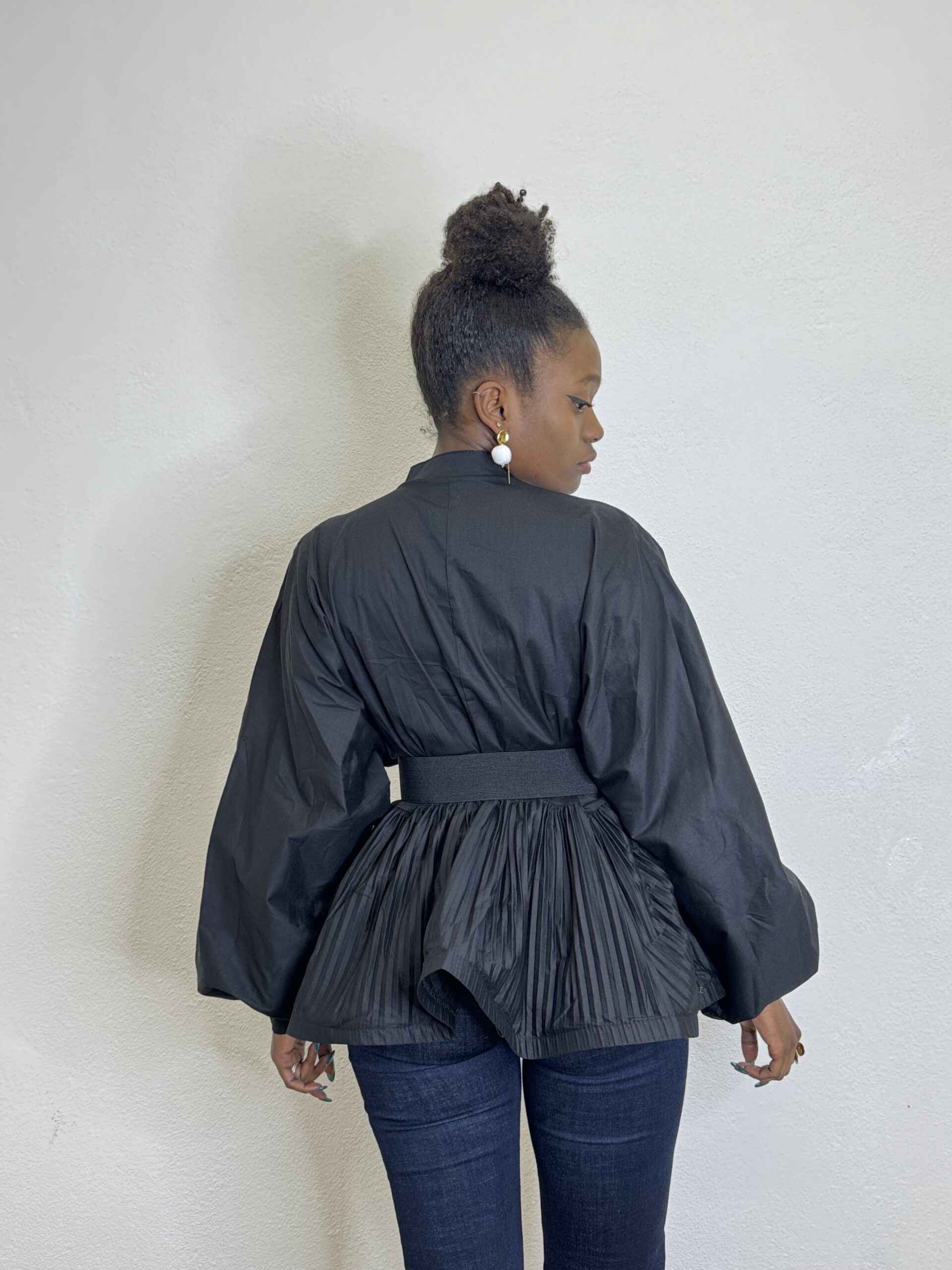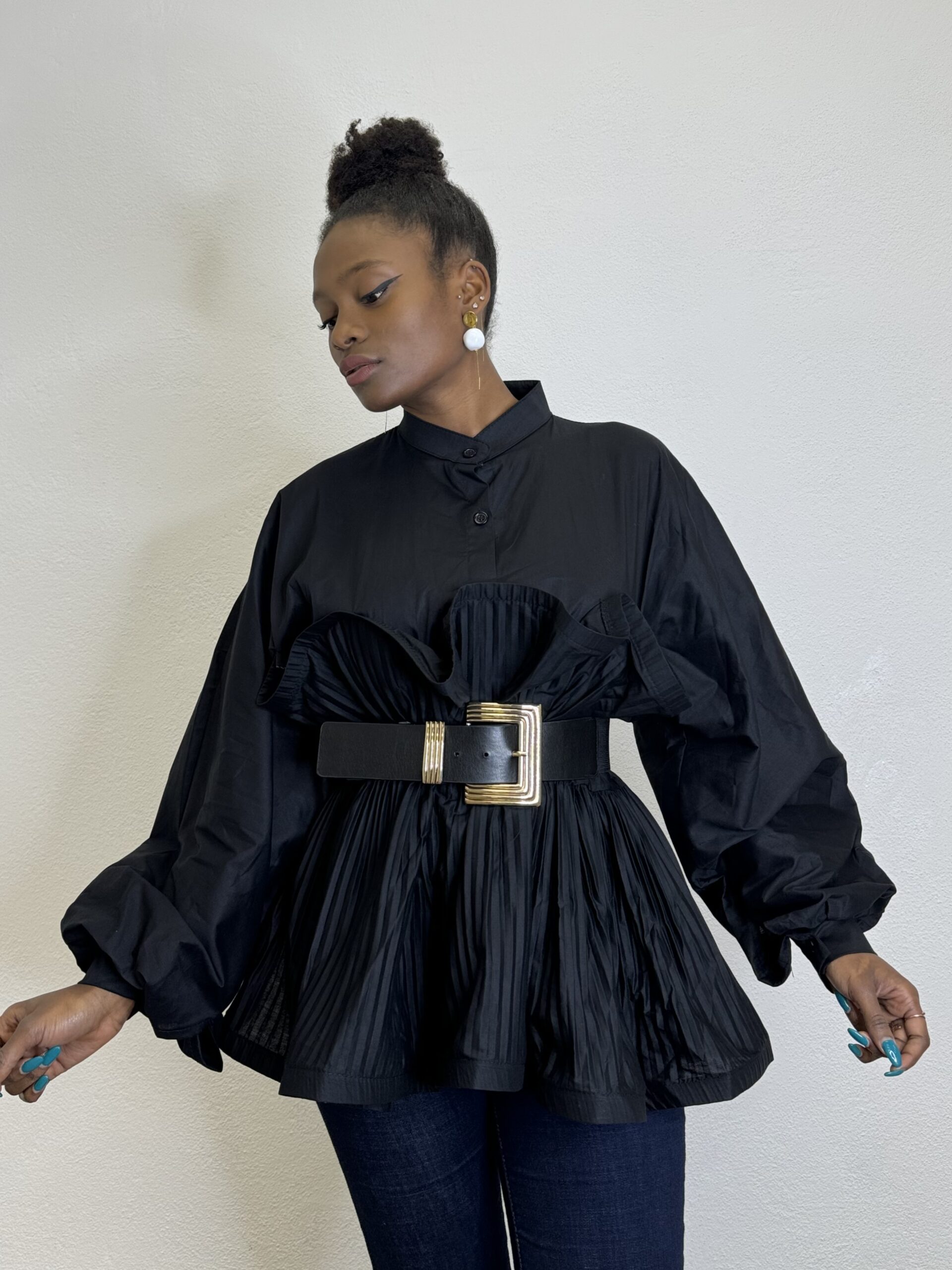 Camicia con collo alla coreana a campana a tinta unita. Cinturino incorporato sul punto vita.