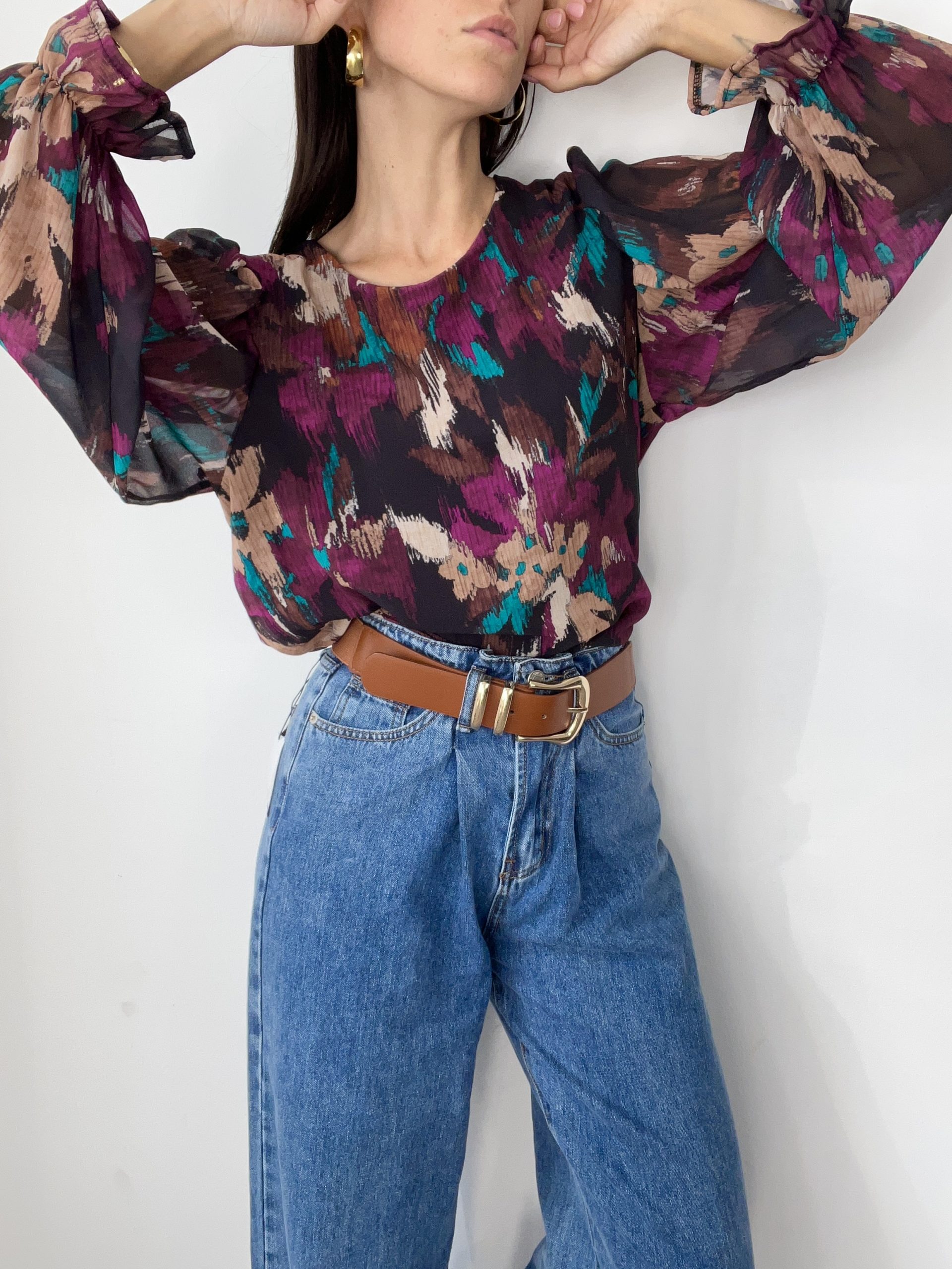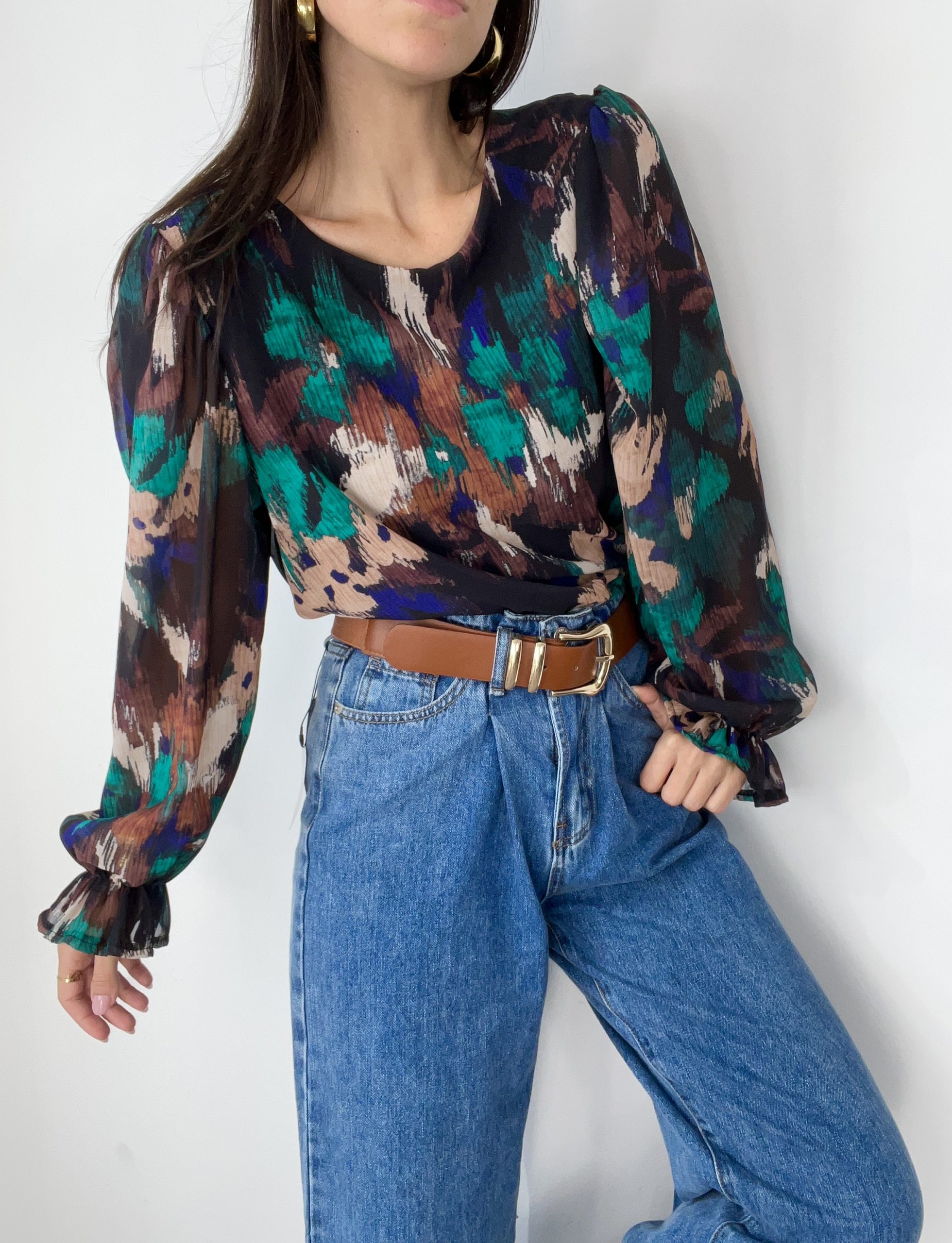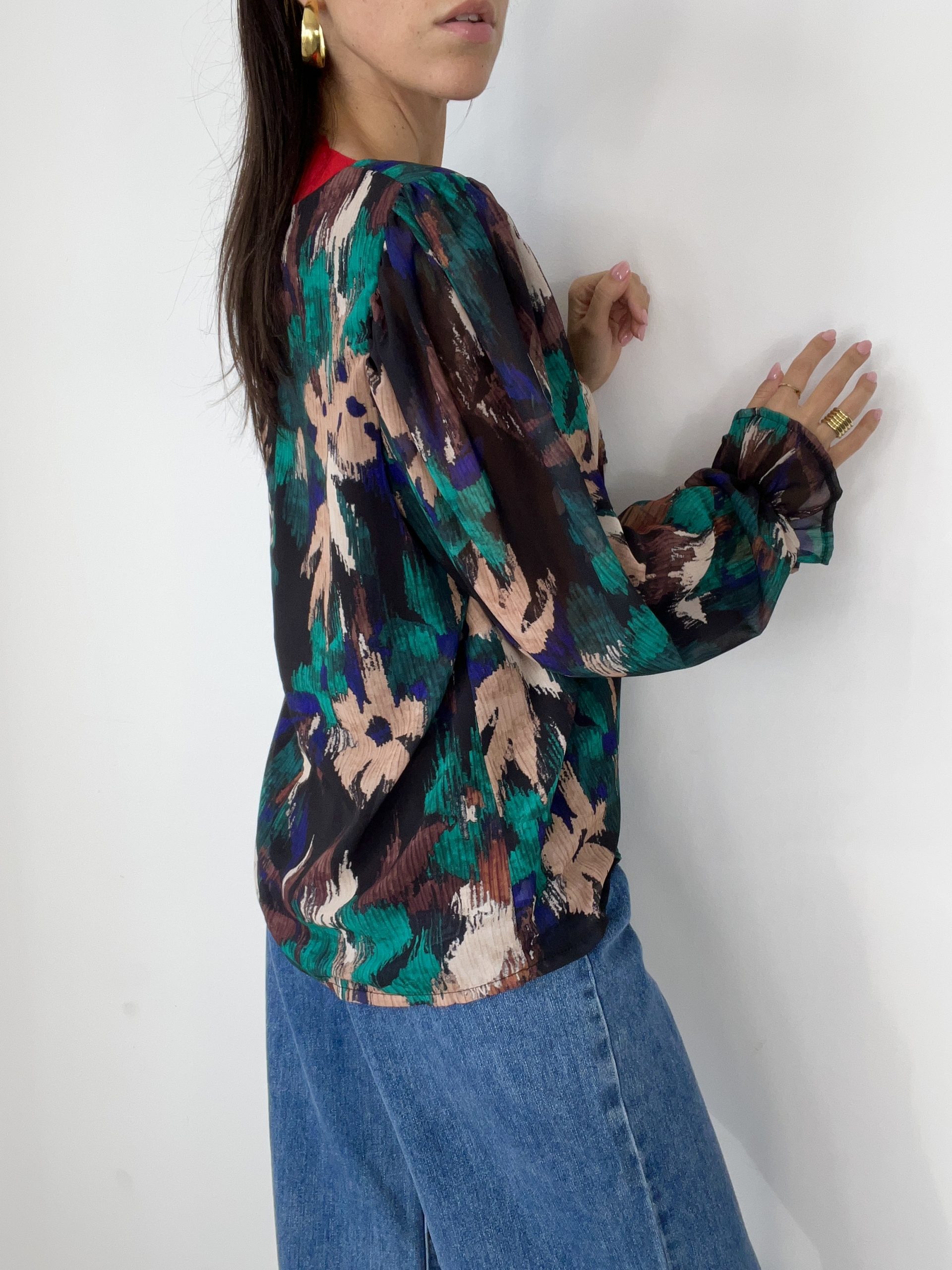 Camicia con fodera centrale in viscosa e manica a palloncino con polsino elasticizzato.
