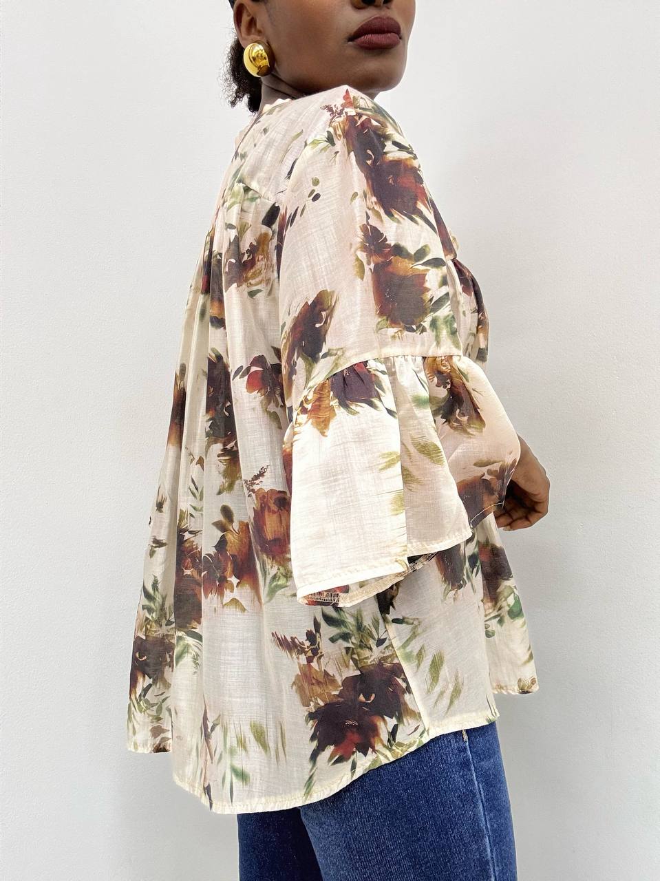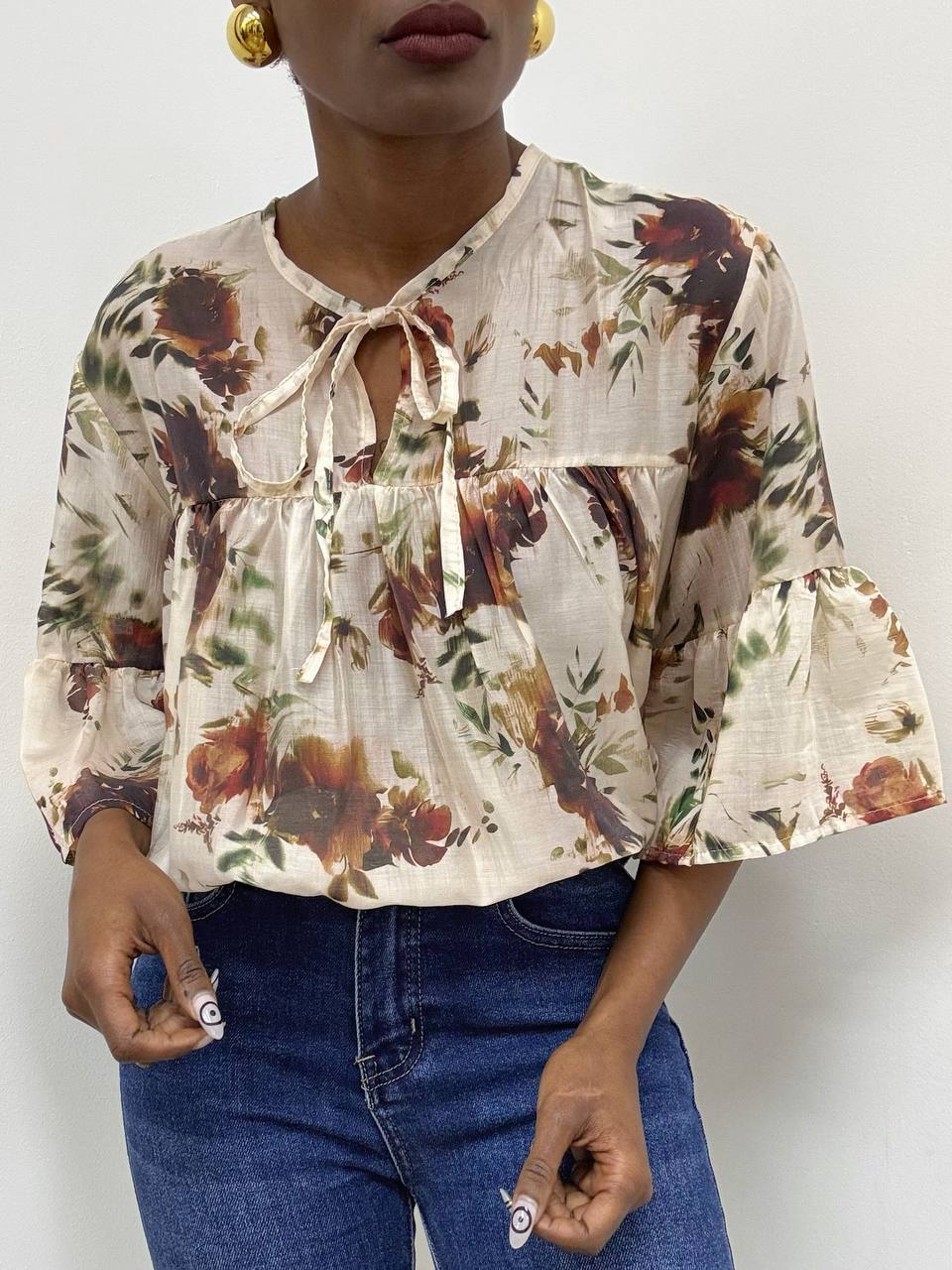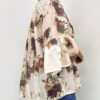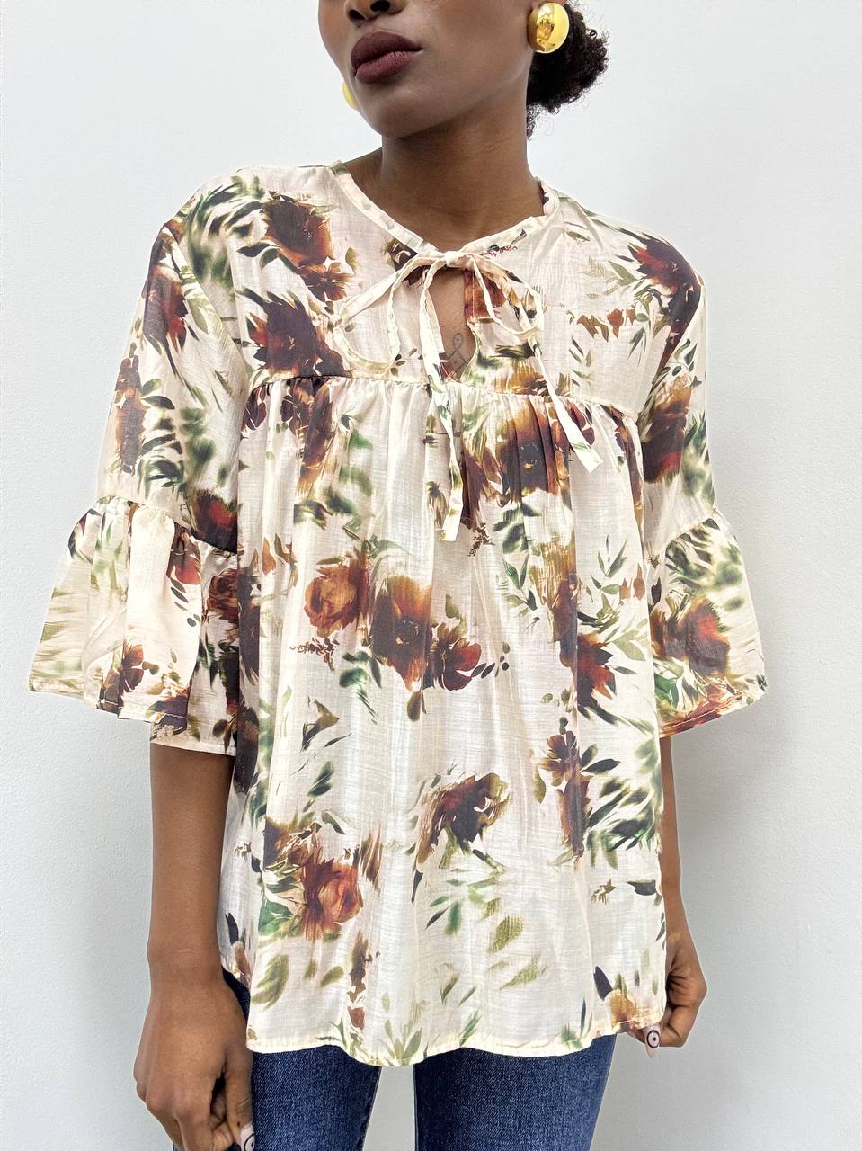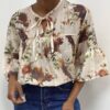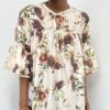 Camicia a maniche corte con scollo rotondo, impreziosita da delicati volant sulle maniche e da una romantica fantasia floreale. L’apertura centrale sul davanti è completata da un laccetto annodato che crea un elegante effetto leggermente arricciato, valorizzando la silhouette.