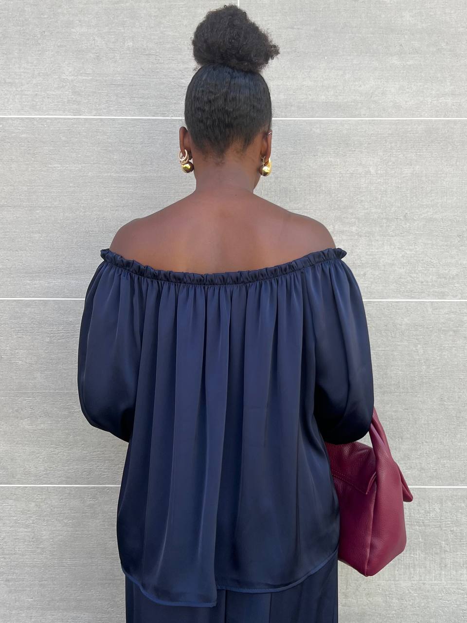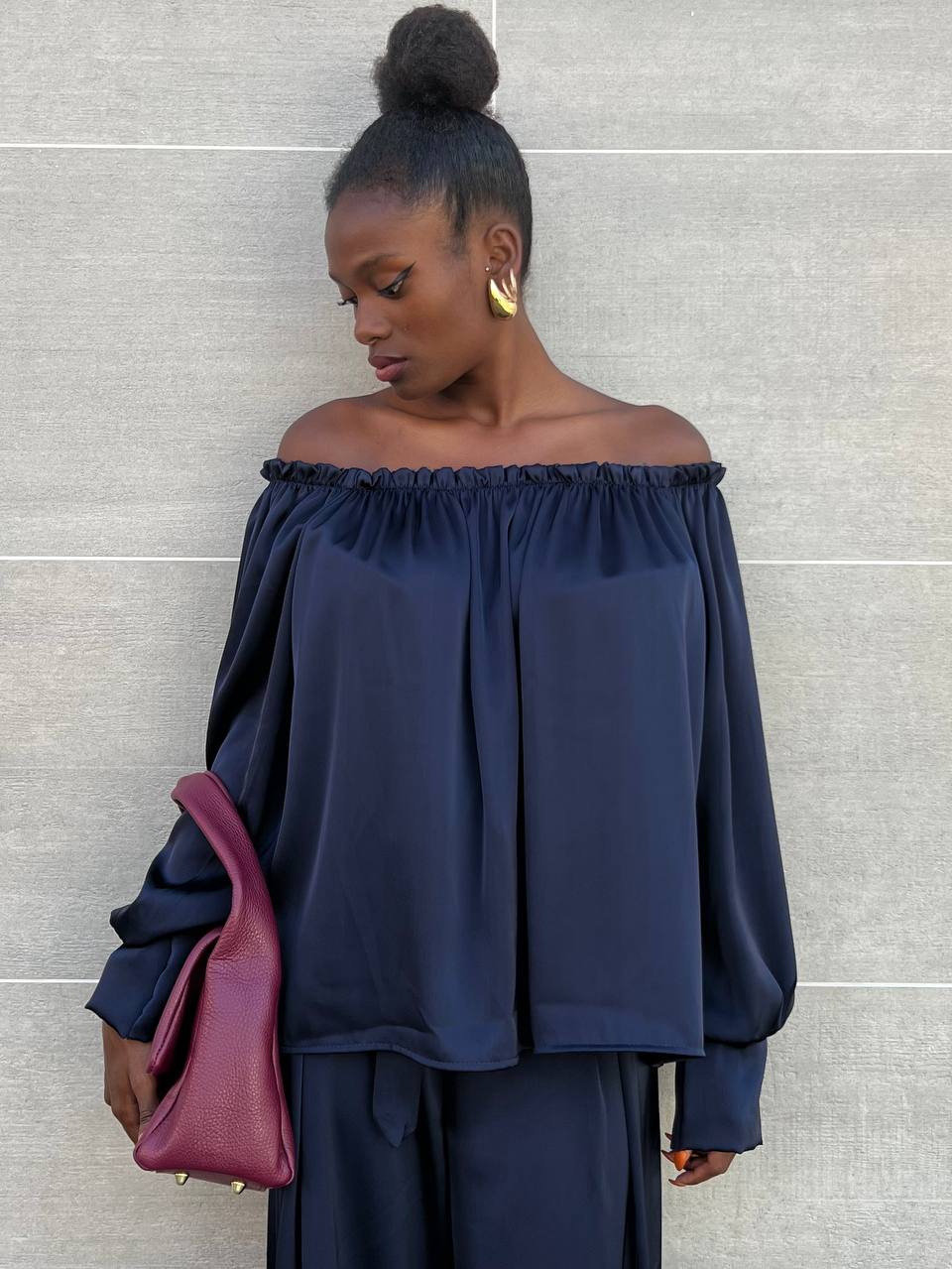 Camicia elasticizzata a tinta unita con scollo a barchetta.
