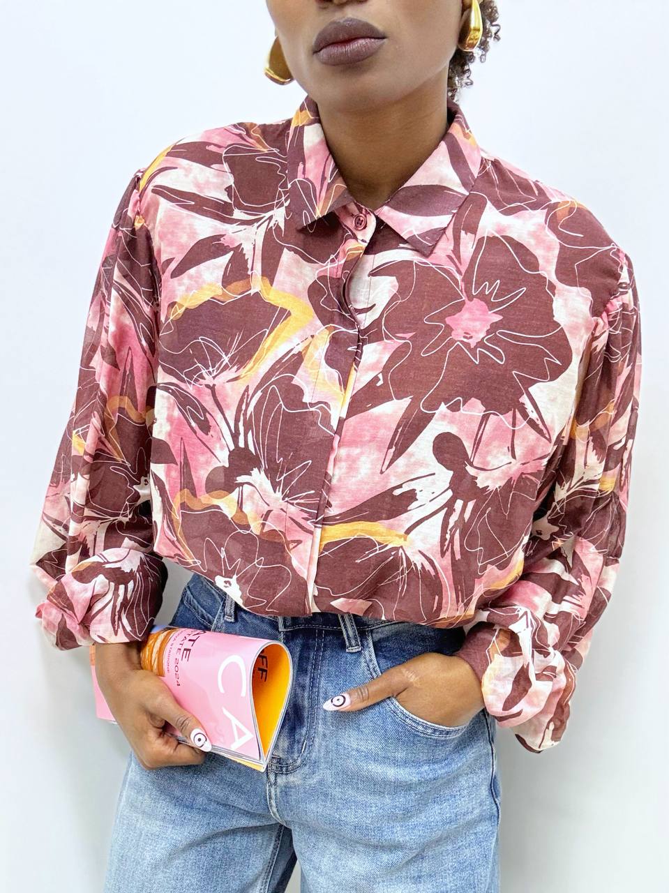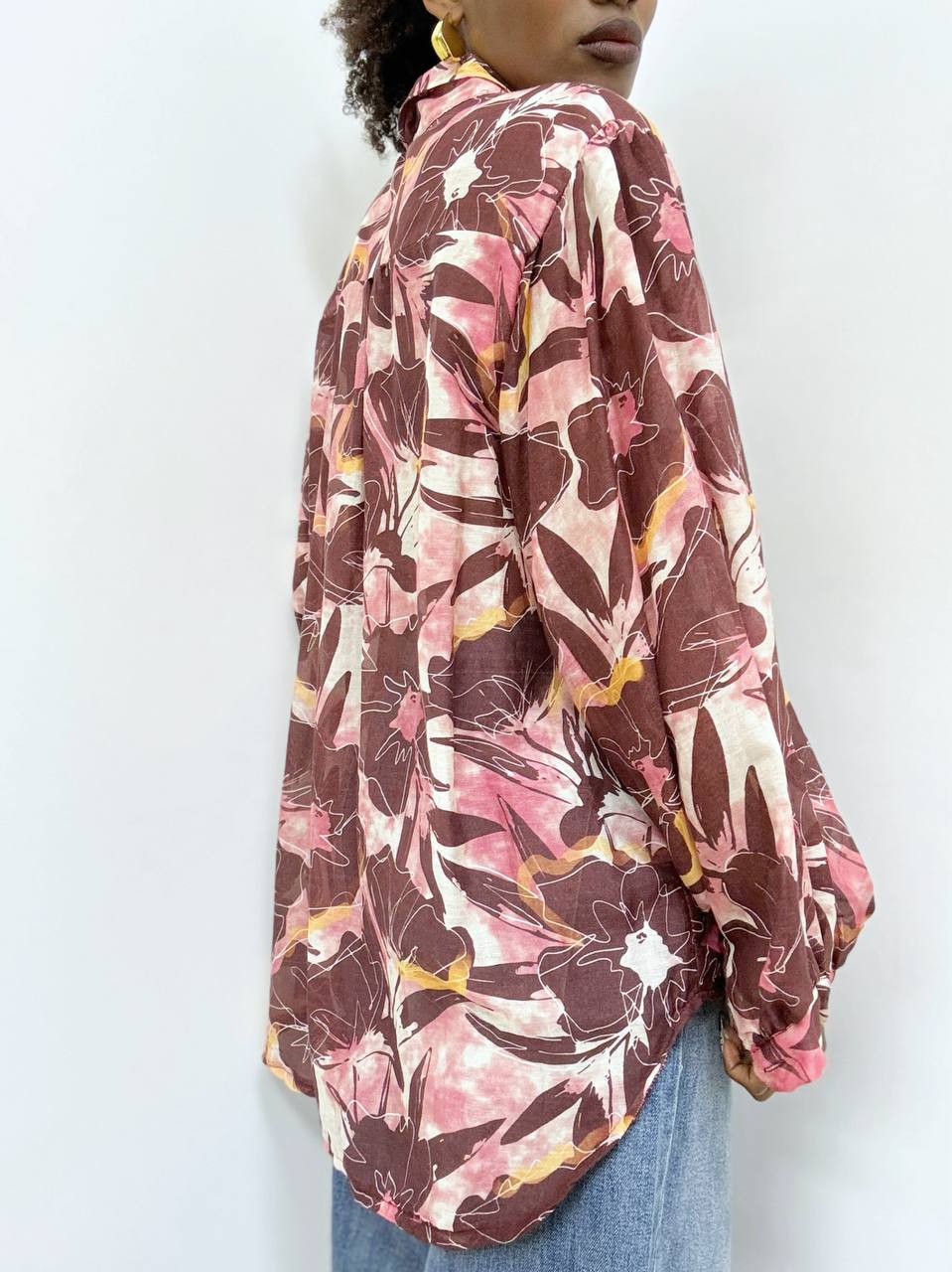 Camicia fiorata dal design fresco e femminile, realizzata in tessuto leggero e morbido sulla pelle. La stampa floreale dona un tocco romantico e vivace, perfetto per la stagione primaverile ed estiva. Il taglio presenta una linea moderna con lunghezza leggermente asimmetrica: più corta davanti per slanciare la figura e leggermente più lunga dietro per un effetto fluido ed elegante. Il fondo arrotondato valorizza il movimento, mentre la vestibilità comoda la rende ideale sia con jeans che con pantaloni più eleganti. Un capo versatile, raffinato e facile da abbinare, perfetto per creare look casual chic o più ricercati.