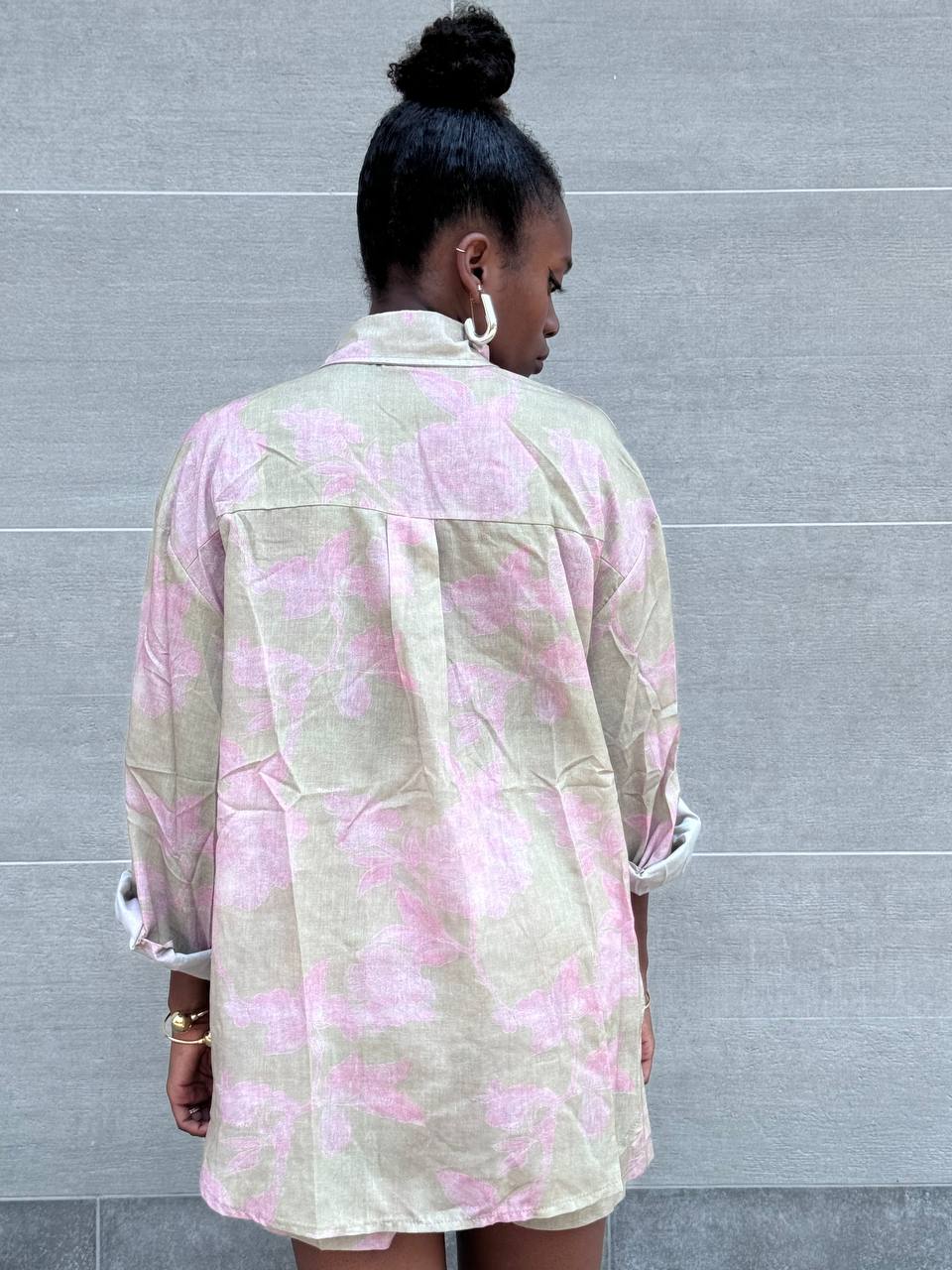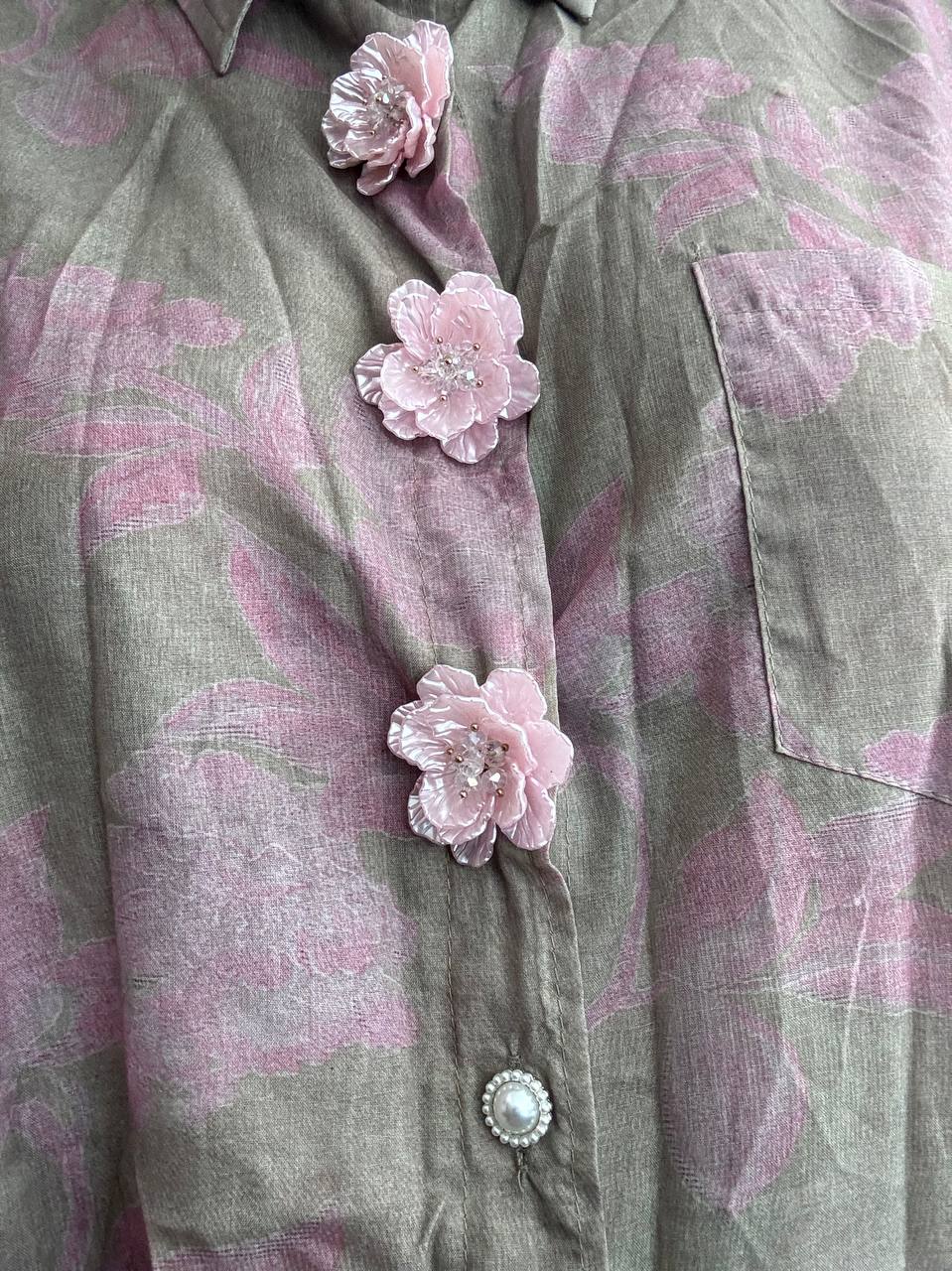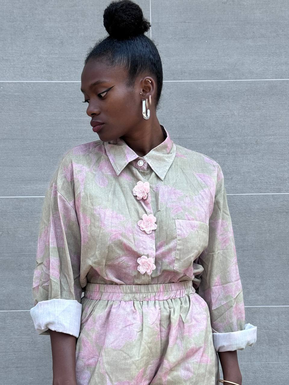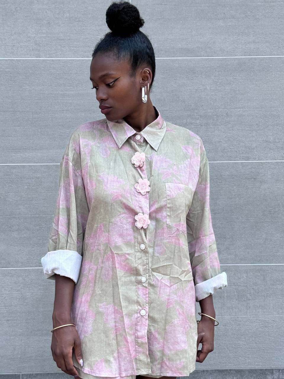 Camicia con dettaglio di chiusura a clip con bottone a fiore con stampa.