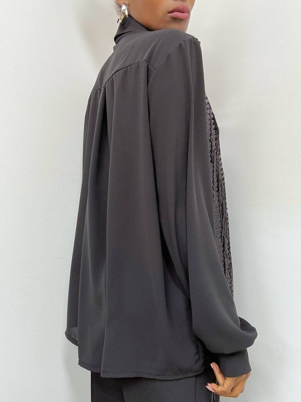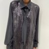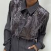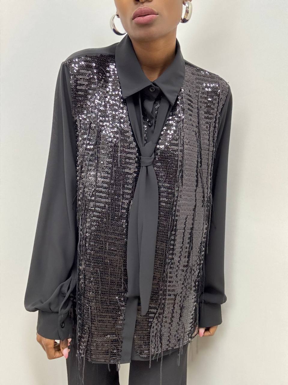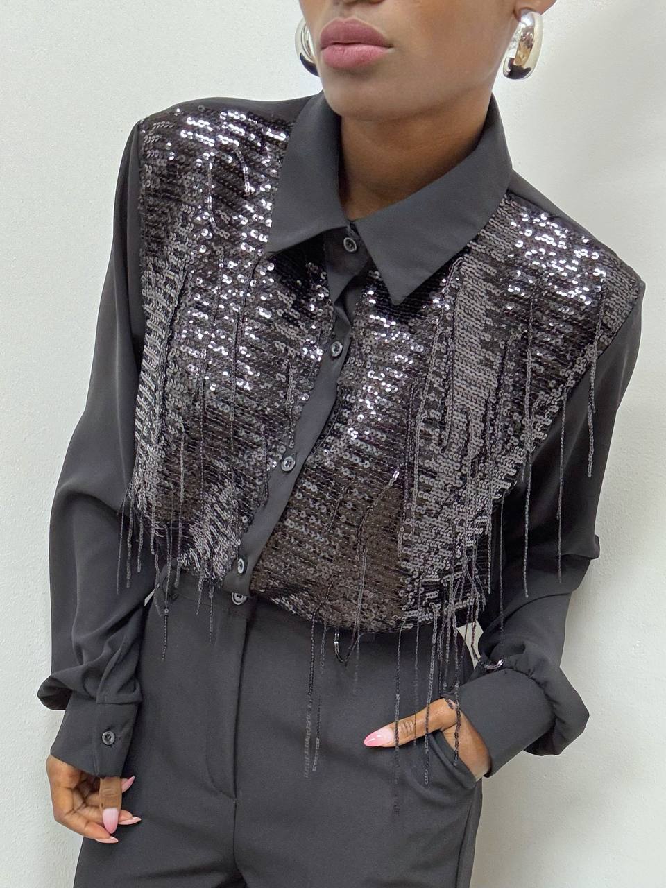 Questa camicia dallo stile deciso e ricercato presenta un colletto revers che conferisce un tocco sofisticato e contemporaneo. La parte anteriore è arricchita da una cravatta e impreziosita da paillettes nere e lucide disposte in linee verticali, che creano un effetto brillante e slanciato. A dare movimento e carattere al capo ci sono le frange applicate sul davanti, perfette per aggiungere dinamismo al look. La chiusura frontale con bottoni neri completa il design con un richiamo cromatico elegante e coordinato.