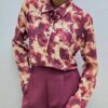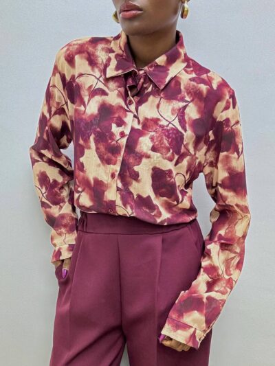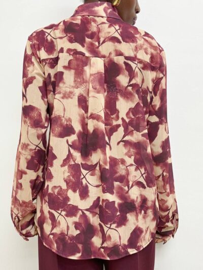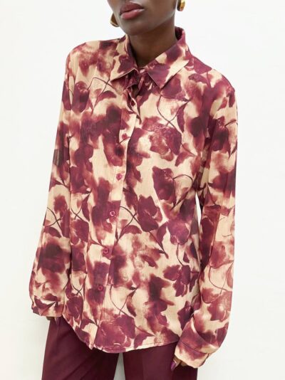 Camicia a manica lunga dal taglio classico, impreziosita da una delicata stampa floreale che si estende uniformemente su tutta la lunghezza del capo, conferendo un tocco romantico e sofisticato. L’abbottonatura frontale tono su tono si integra perfettamente con il tessuto, mantenendo una linea pulita ed elegante.