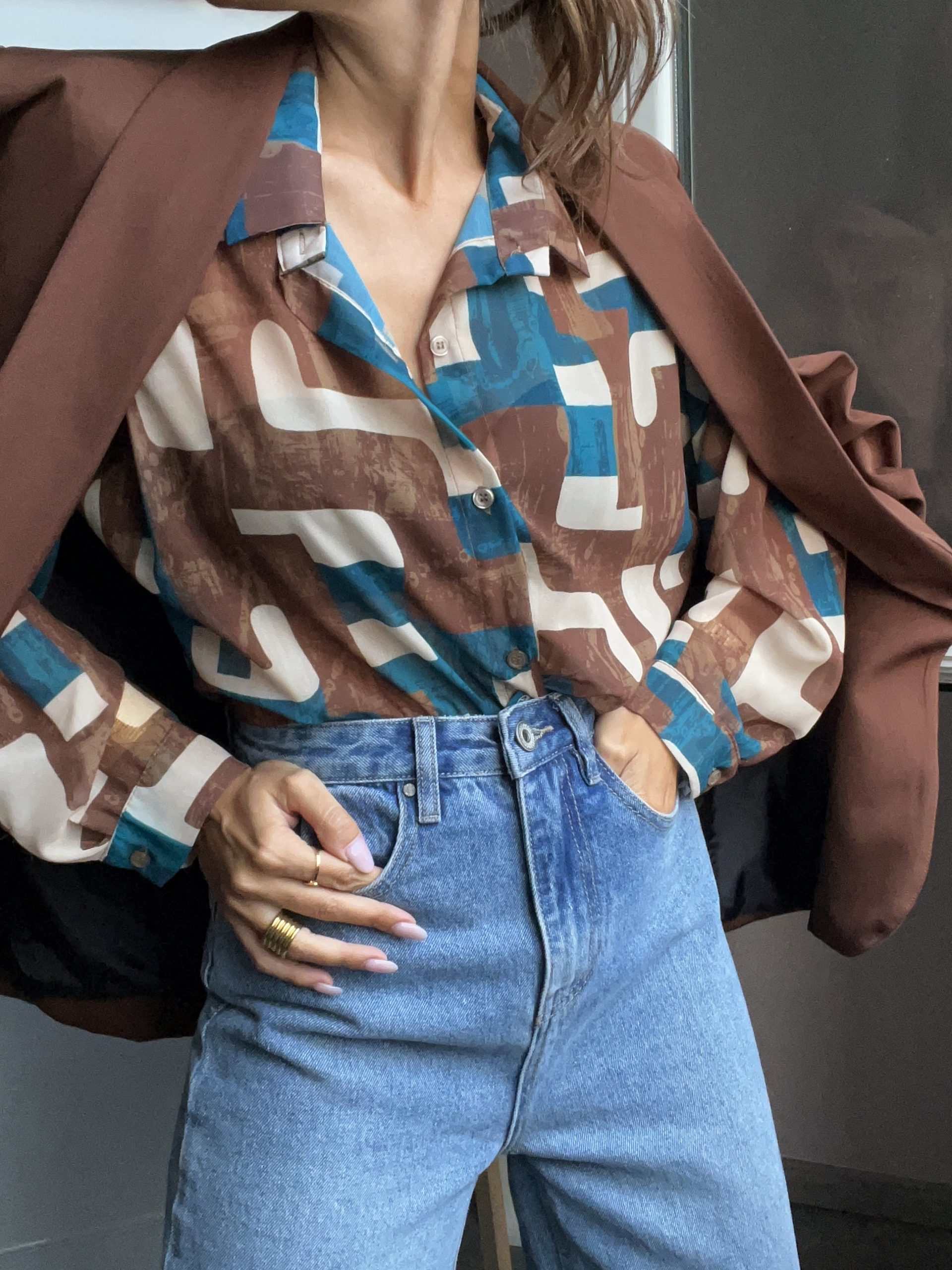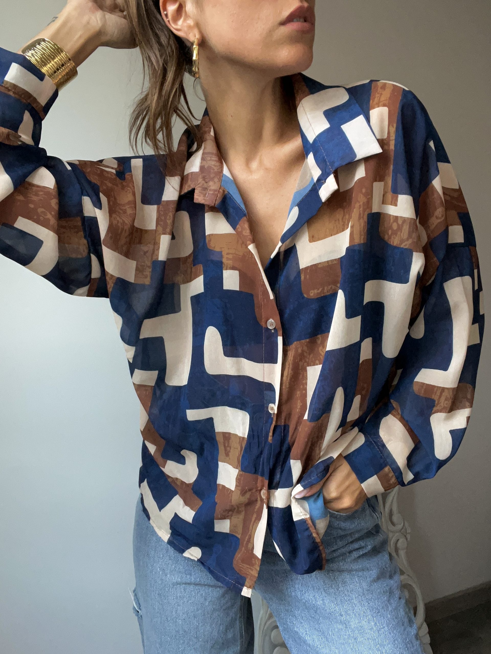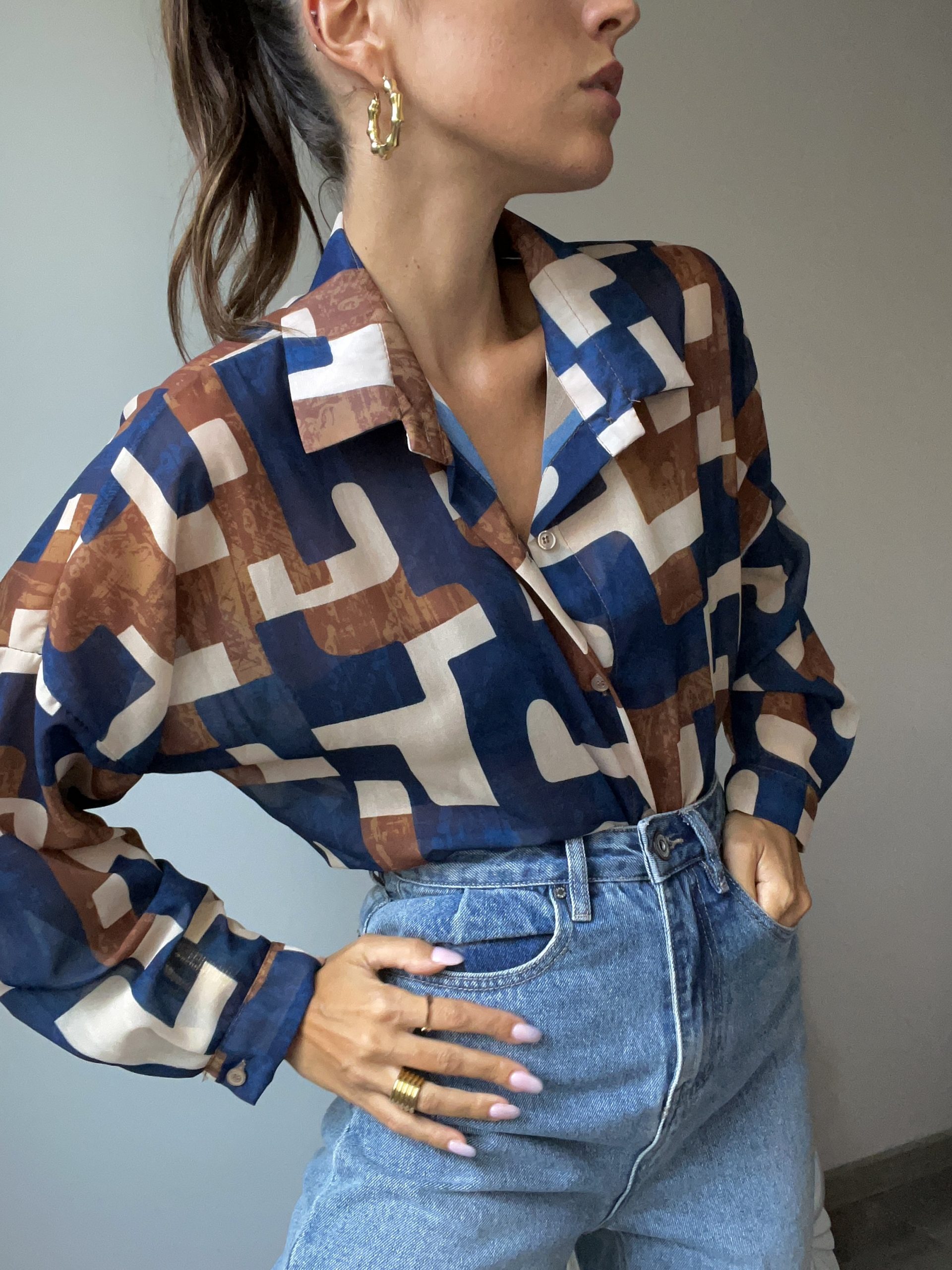 Camicia a fantasia collo revers e abbottonatura frontale, polsino con bottone di chiusura.