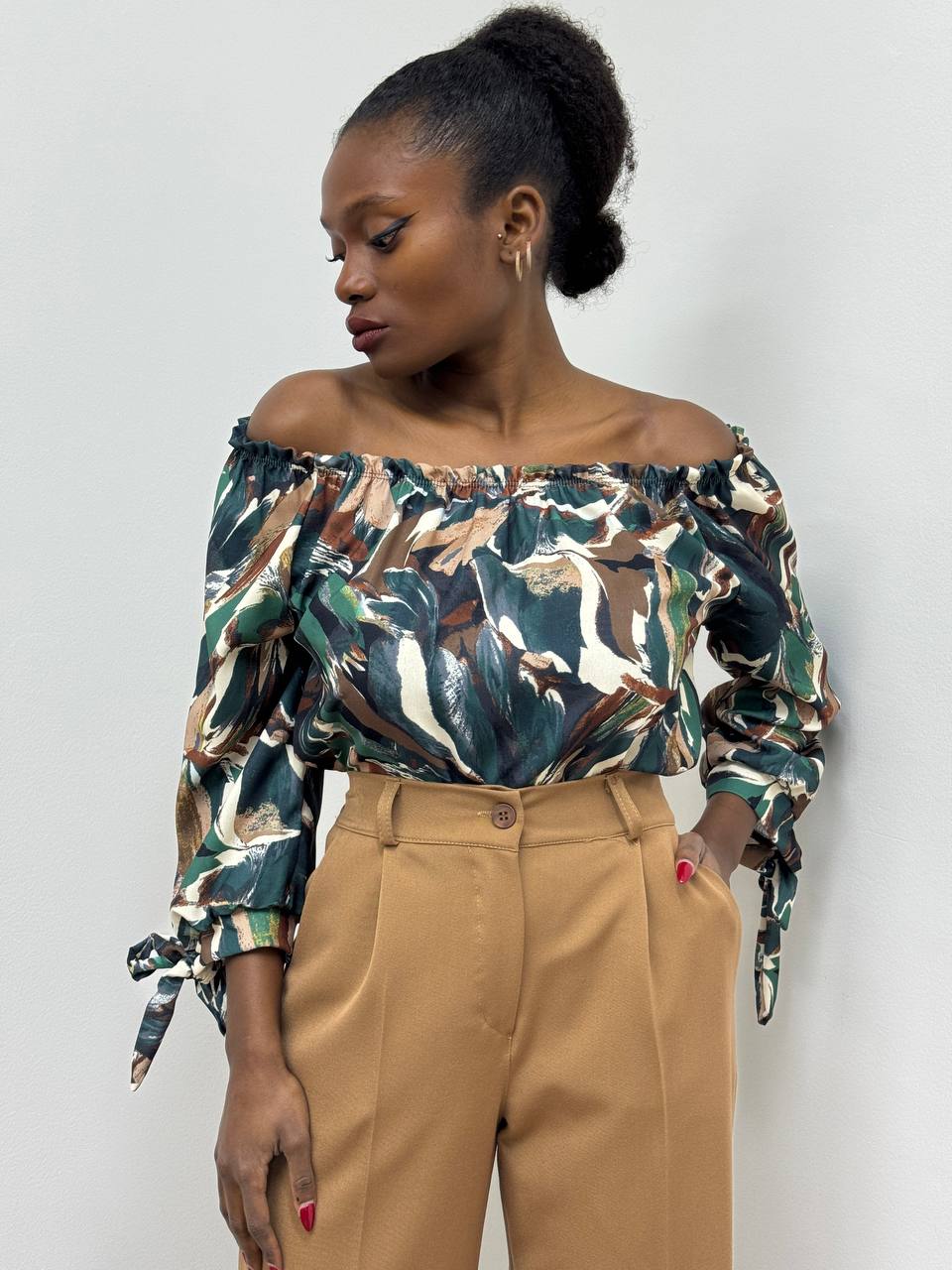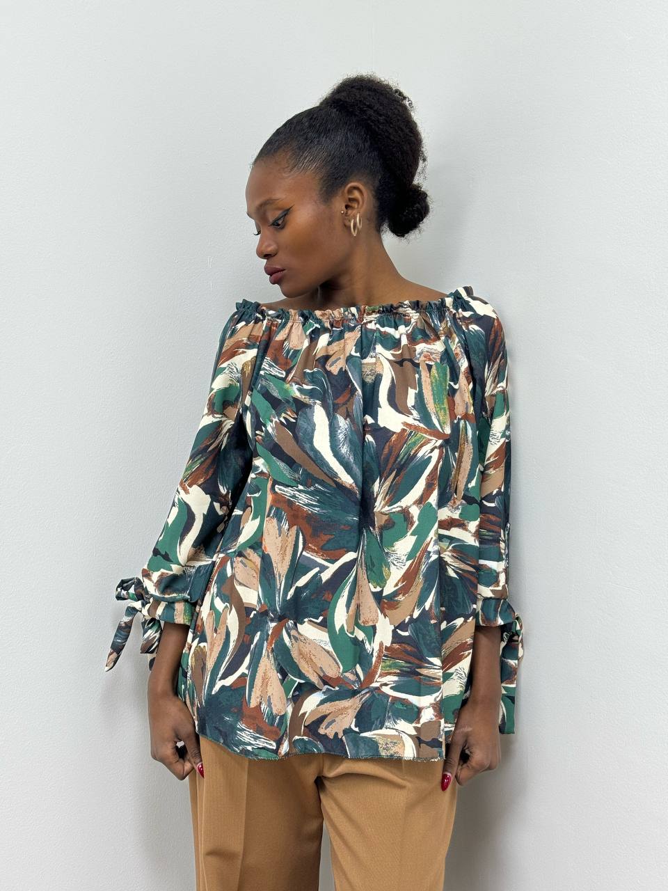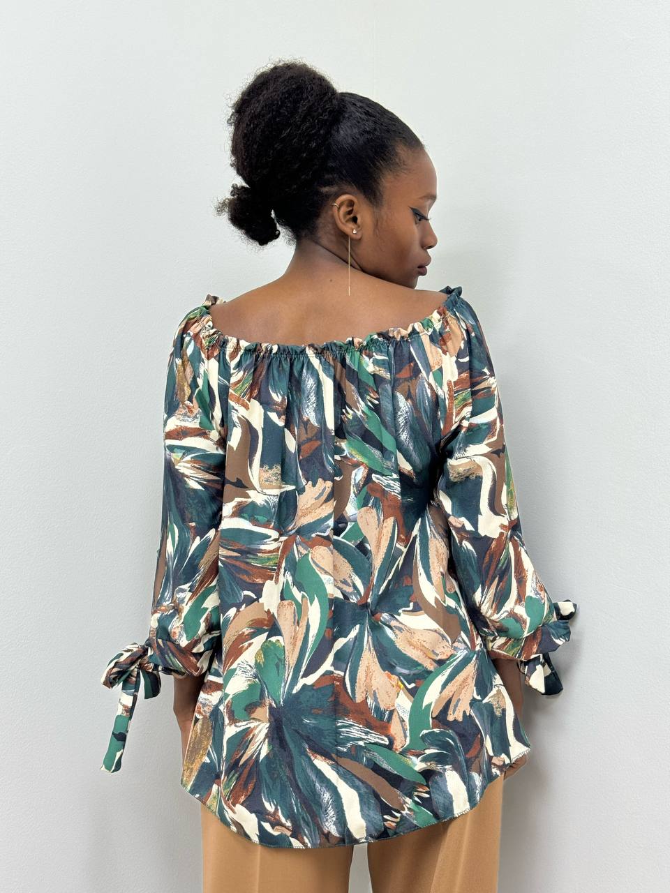 Camicia elasticizzata con stampa su tutta la lunghezza con polsini con fiocco.