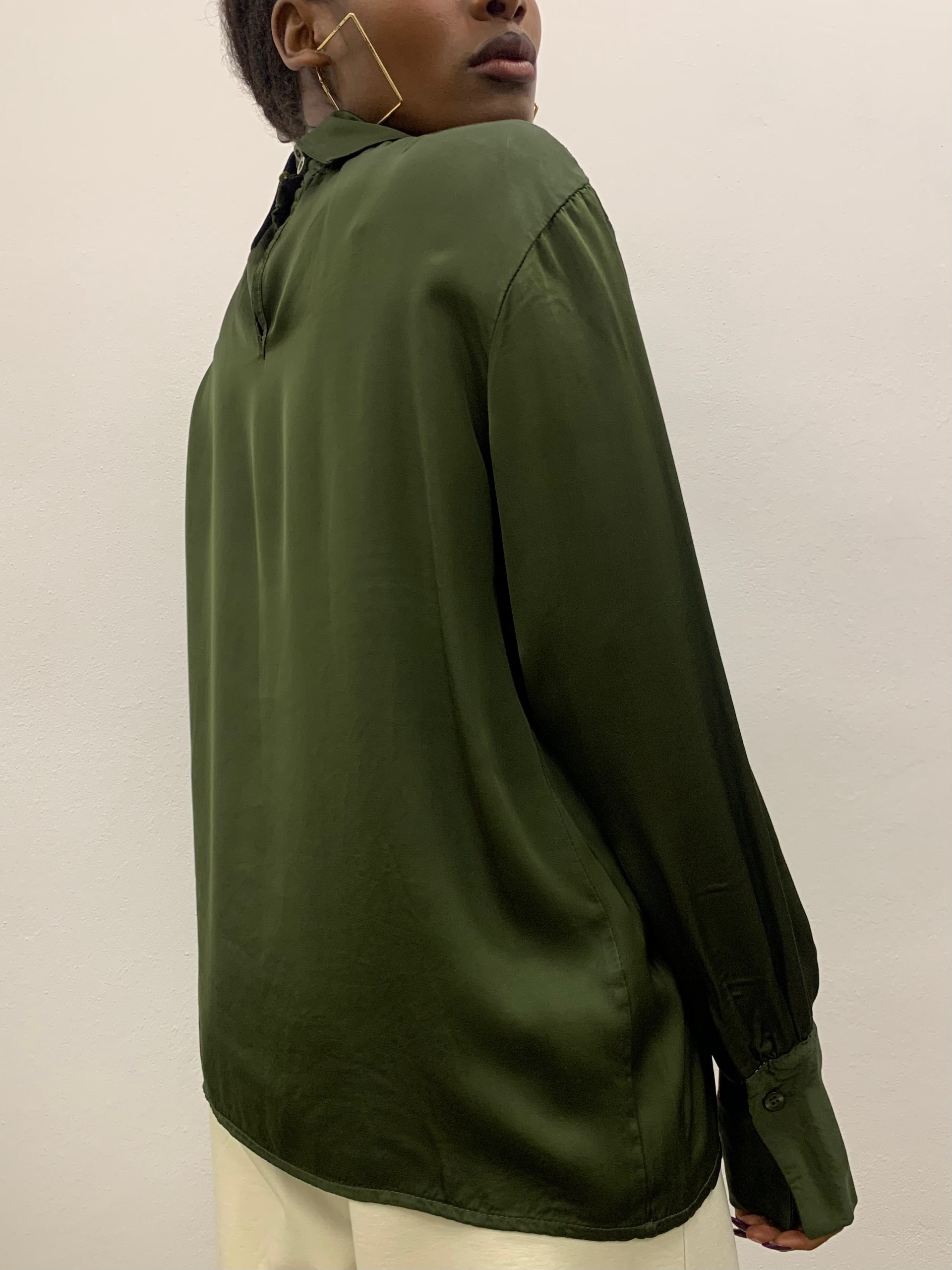A completare il dettaglio, una delicata chiusura con piccolo bottone tono su tono, discreto ma distintivo. Perfetta da indossare da sola o come base per look stratificati, questa camicia è un capo versatile, ideale per uno stile minimal ma curato.
