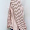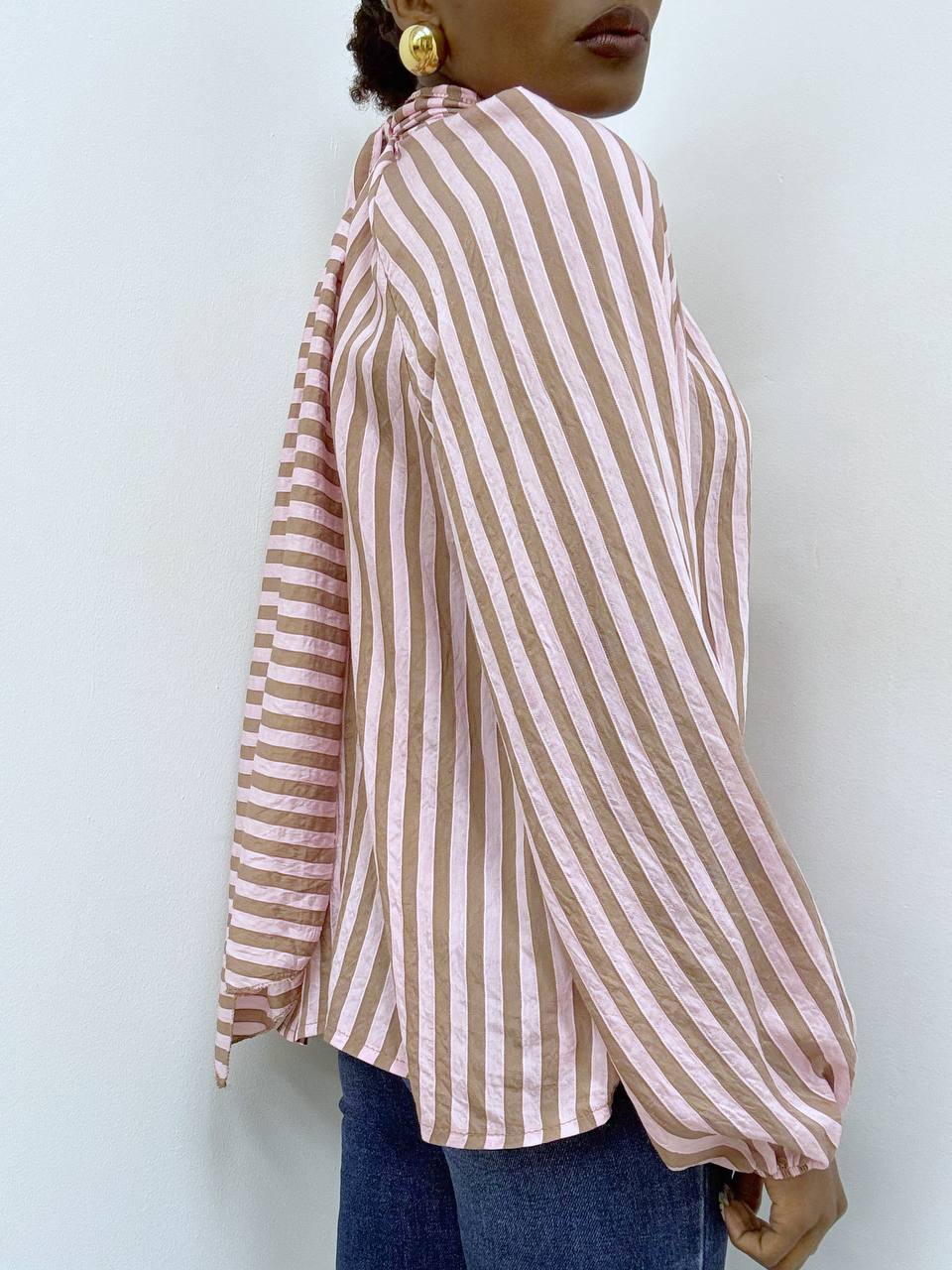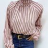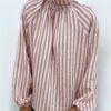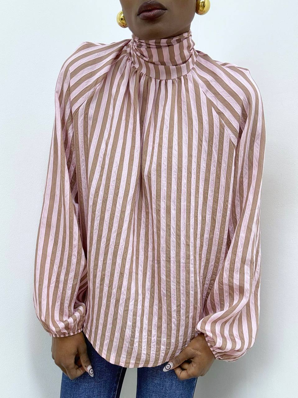 Camicietta a righe verticali, dal design raffinato e femminile. Il modello presenta un elegante dettaglio di fiocco sulla parte alta del collo, che funge da chiusura e dona un tocco romantico e sofisticato al capo. Le righe verticali slanciano la figura, rendendo la camicetta ideale sia per look formali che per abbinamenti più casual chic.