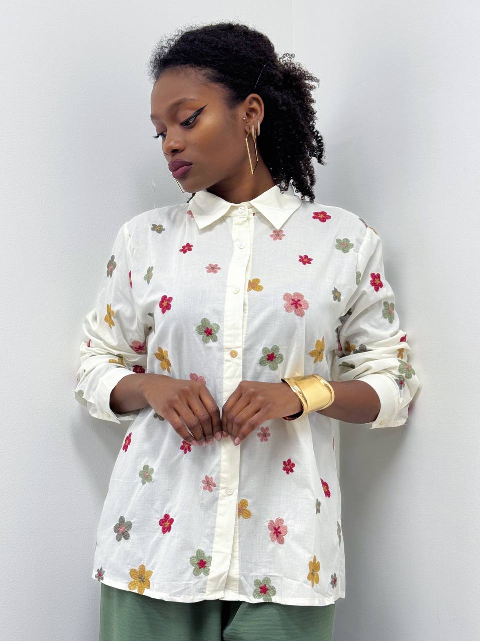Camicia con bottoni di chiusura su tutta la lunghezza con fiorellini stampati.