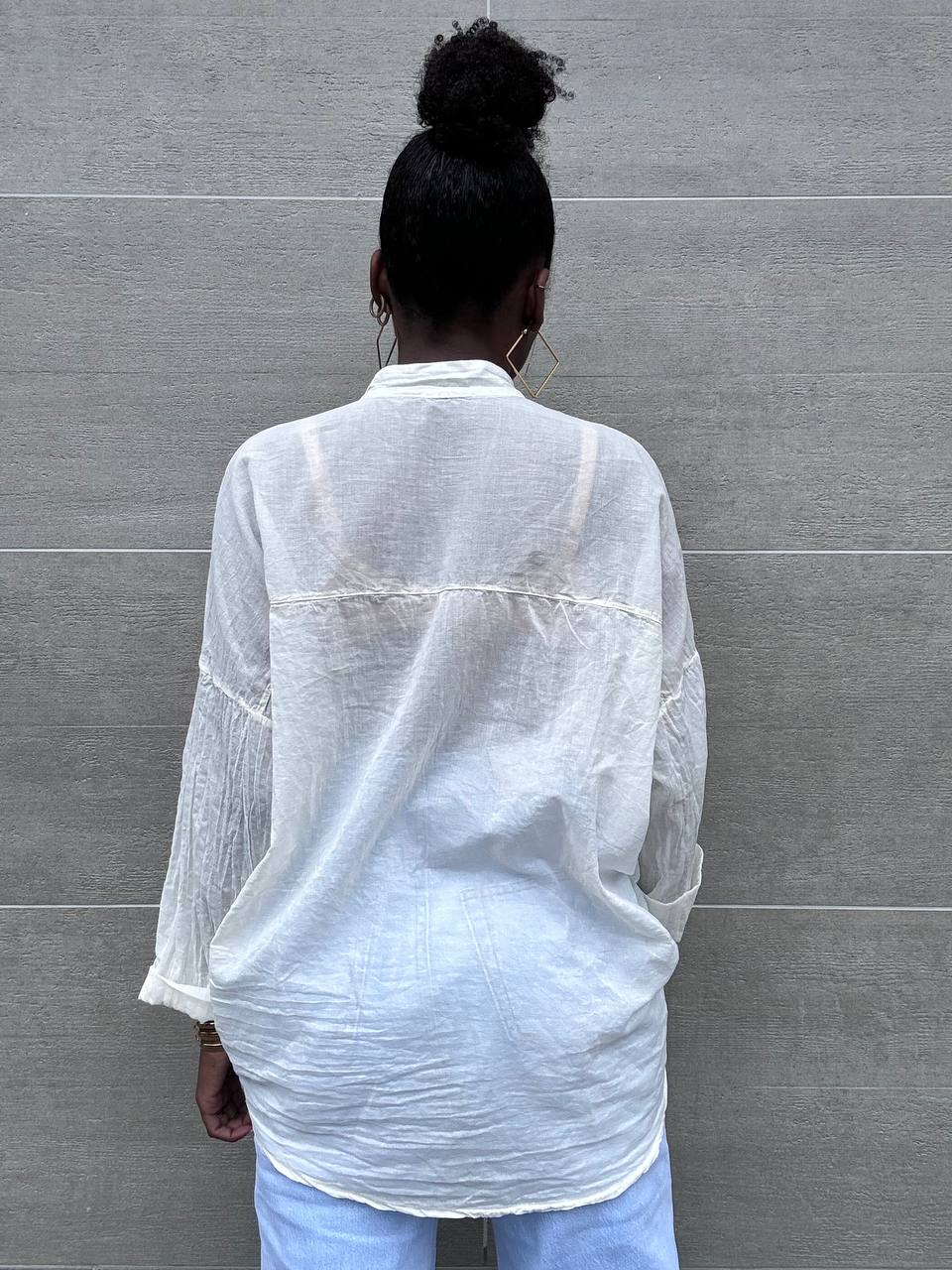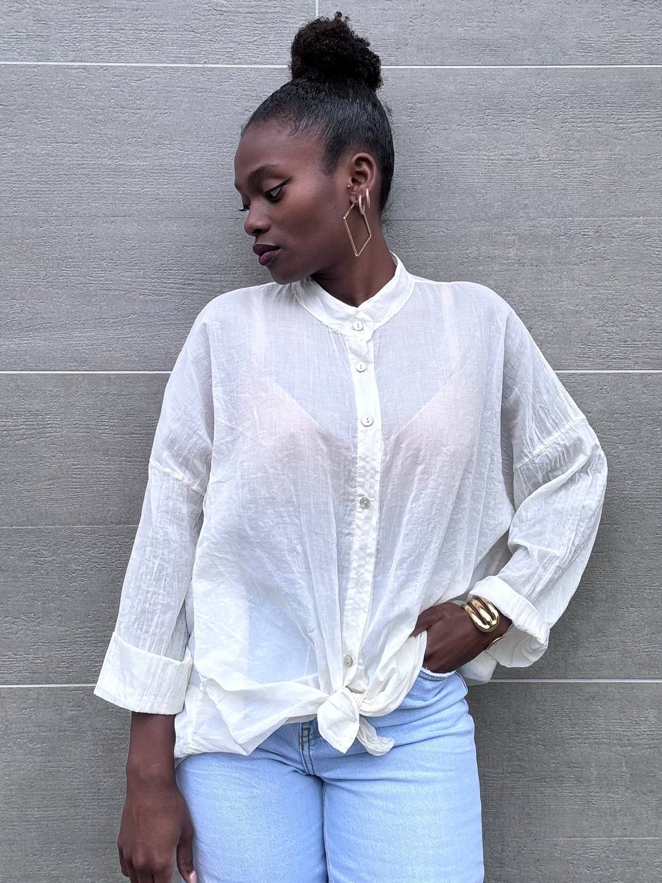 Camicia con collo alla coreana con dettaglio di bottoni di chiusura a tinta unita.