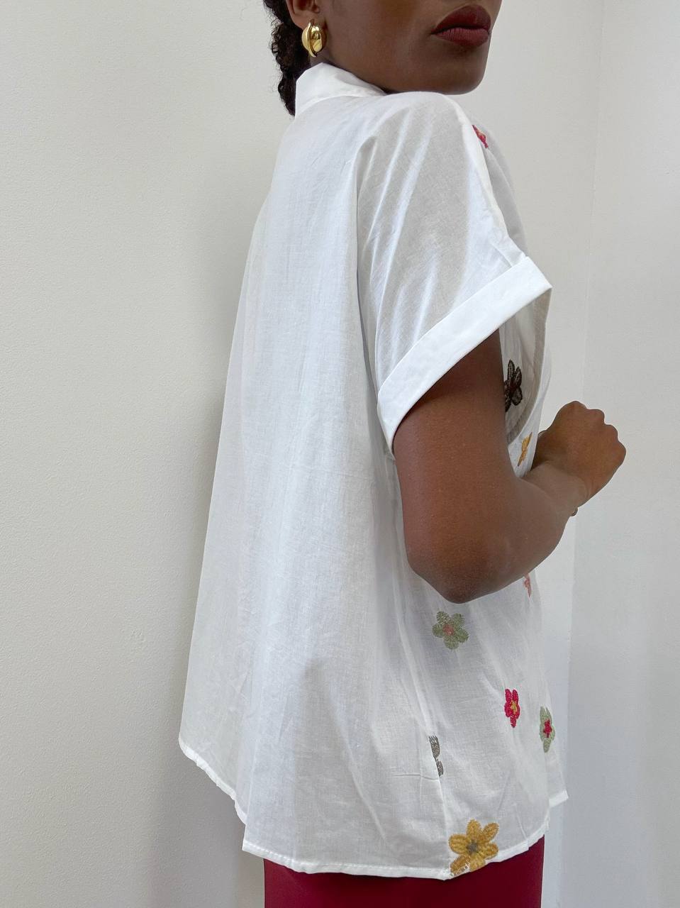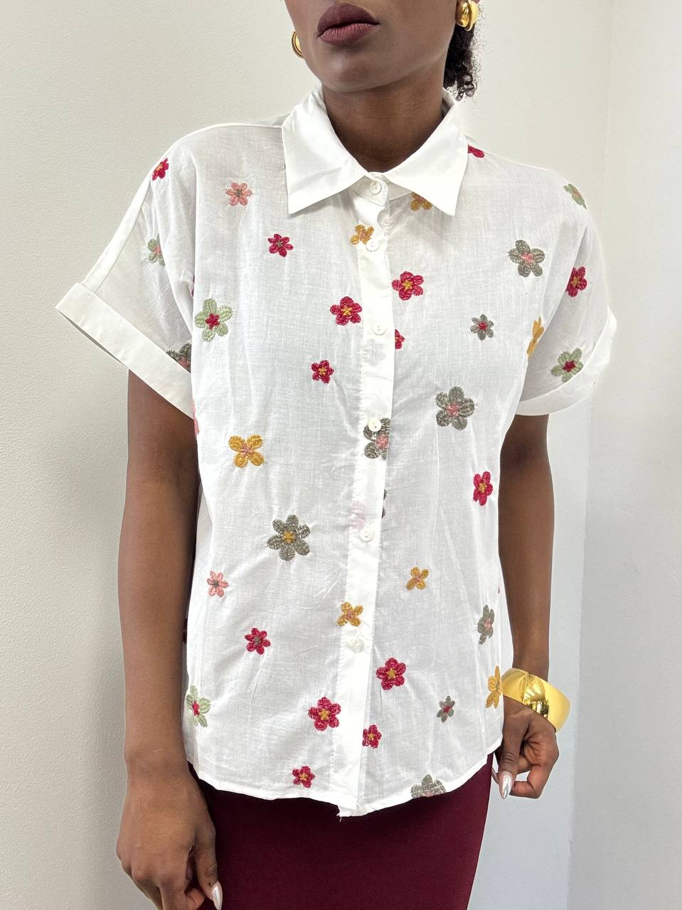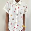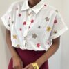 Una camicia raffinata e delicata, impreziosita da un ricamo floreale che si estende armoniosamente su tutta la lunghezza del capo. I fiori, realizzati con cura nei dettagli, creano un effetto elegante e tridimensionale, donando profondità e carattere al tessuto.
