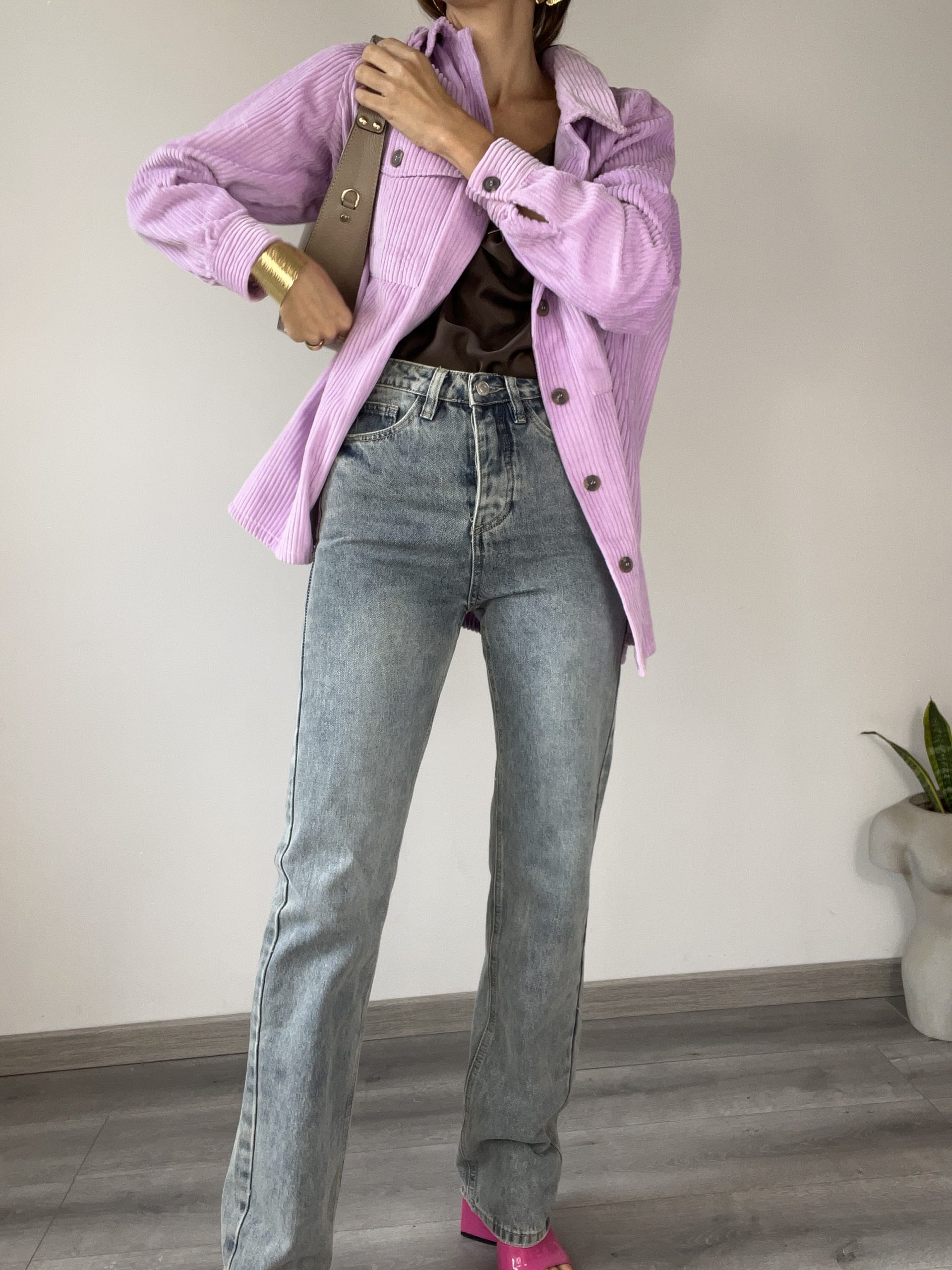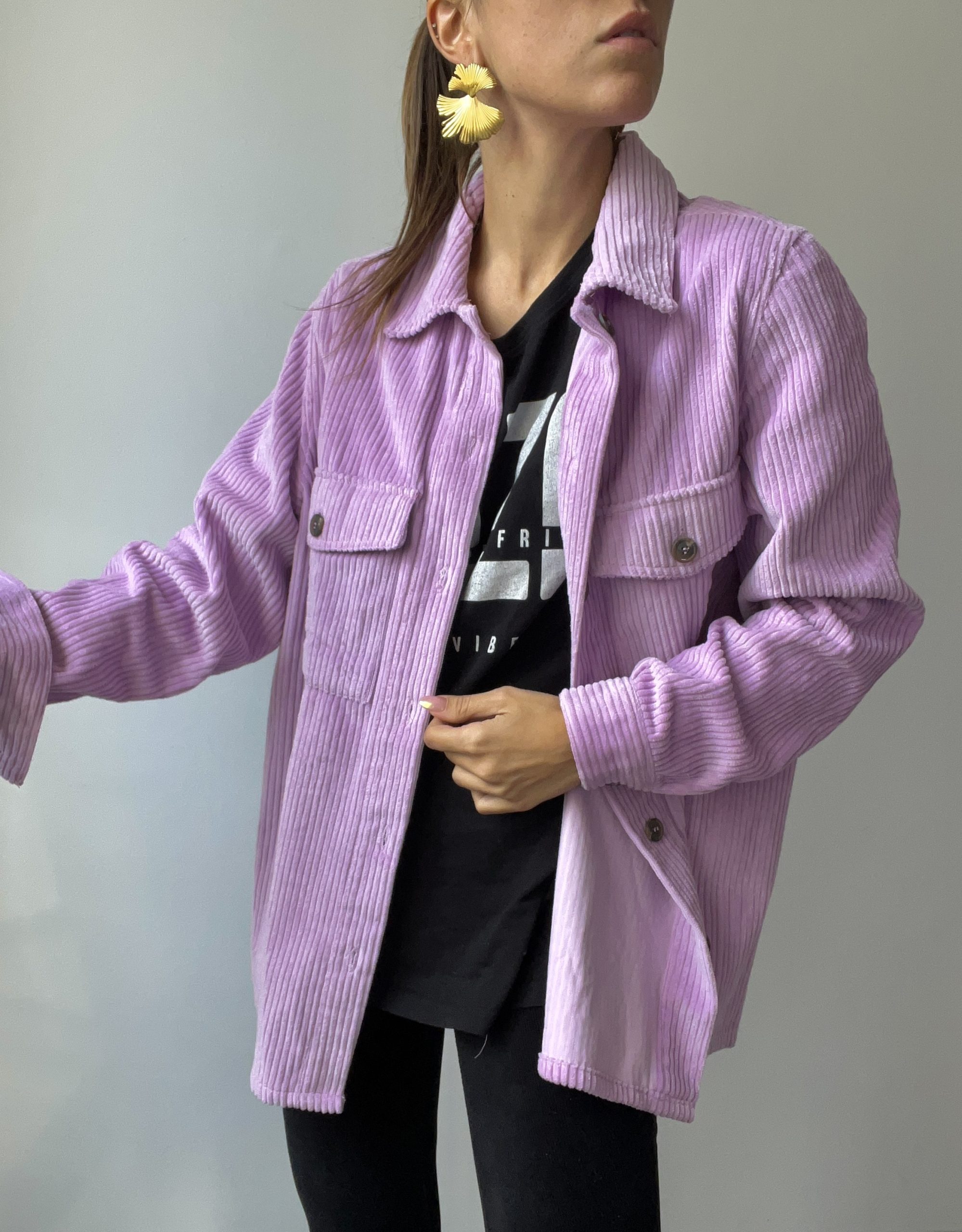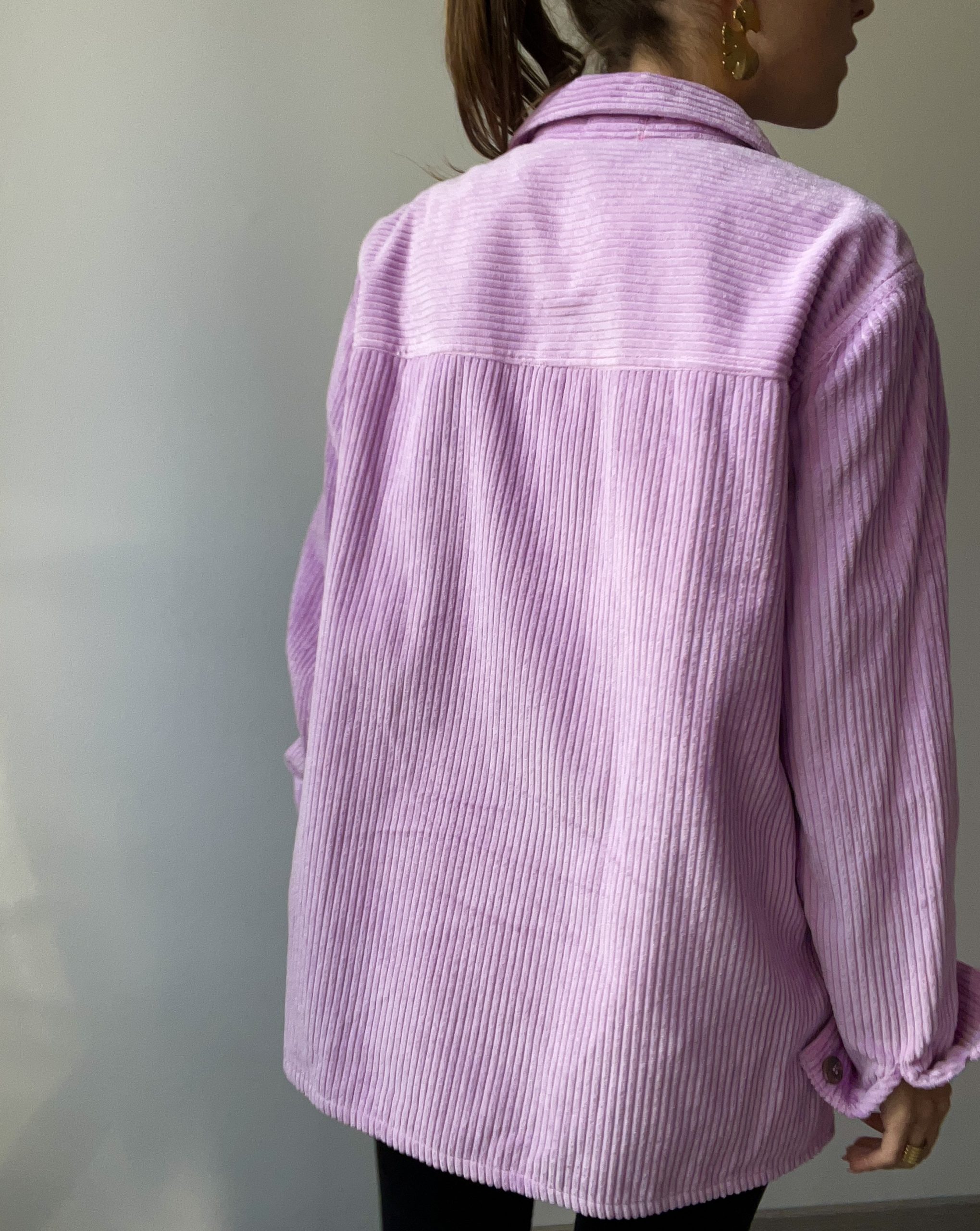 Camicia in velluto con apertura centrale di bottoni, dettaglio di tasche sulla parte superiore.