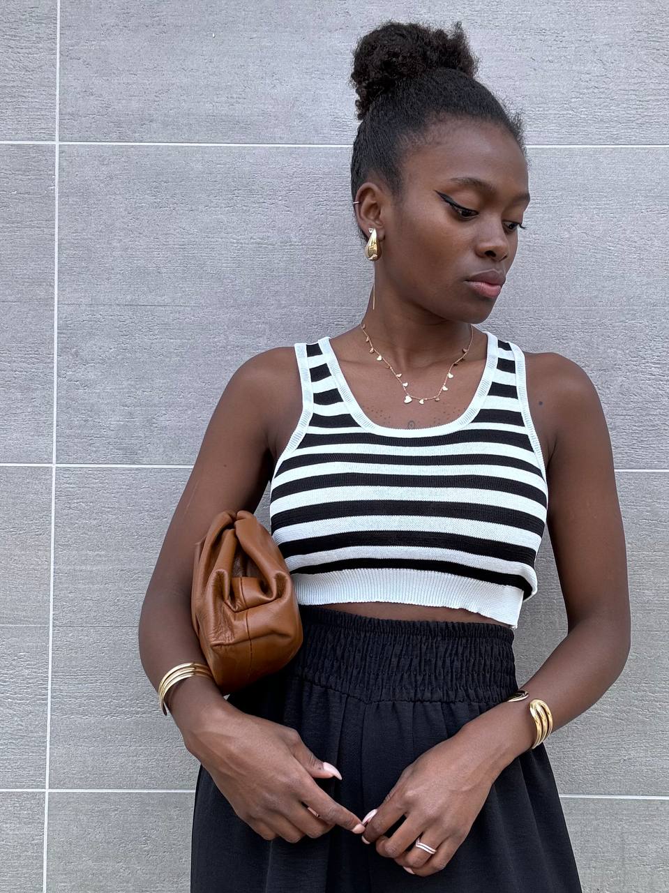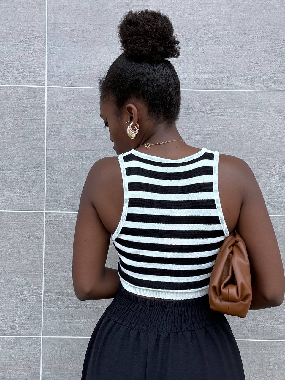 Canotta smanicata a righe bianca e nera con scollo rotondo.