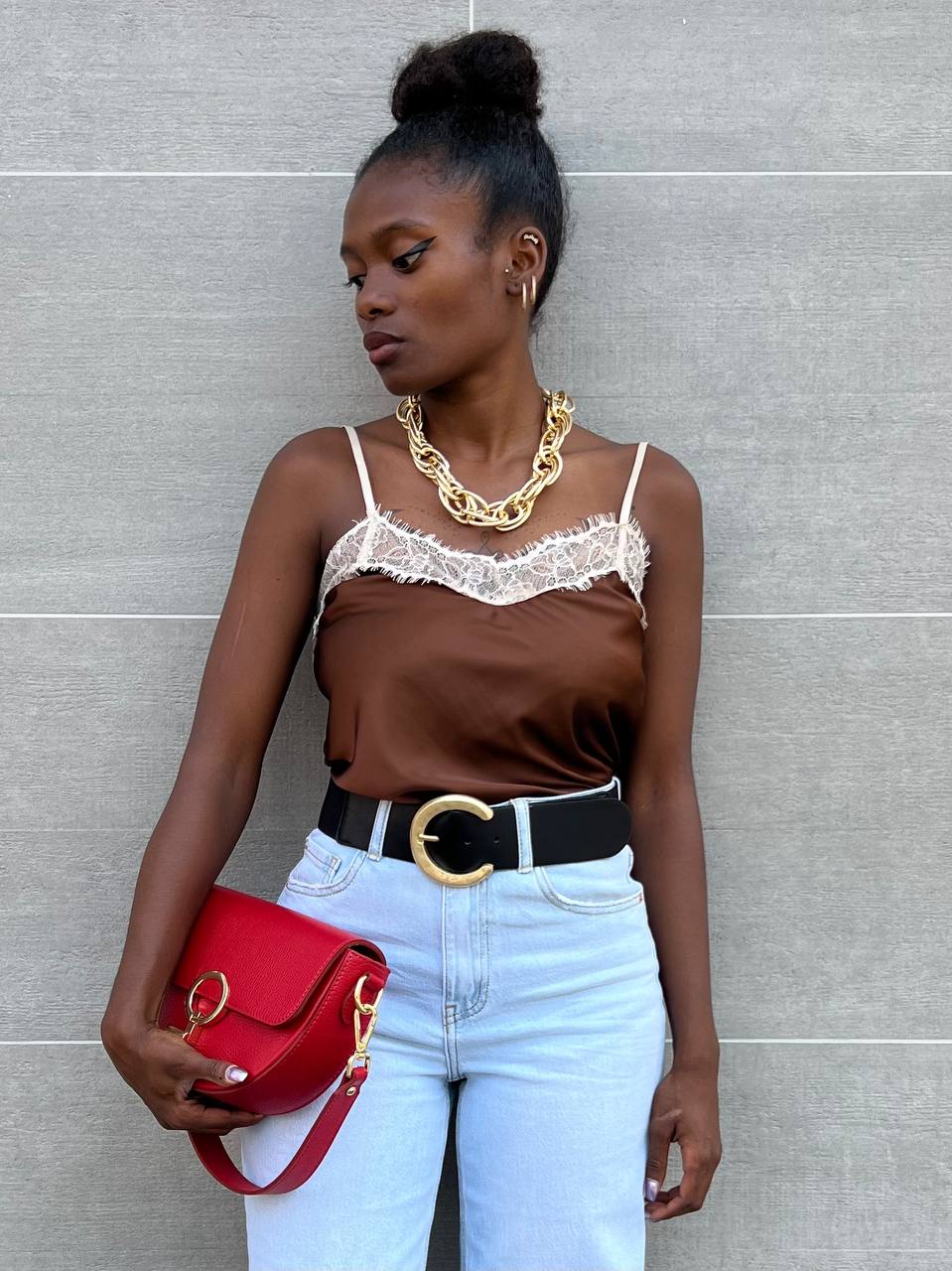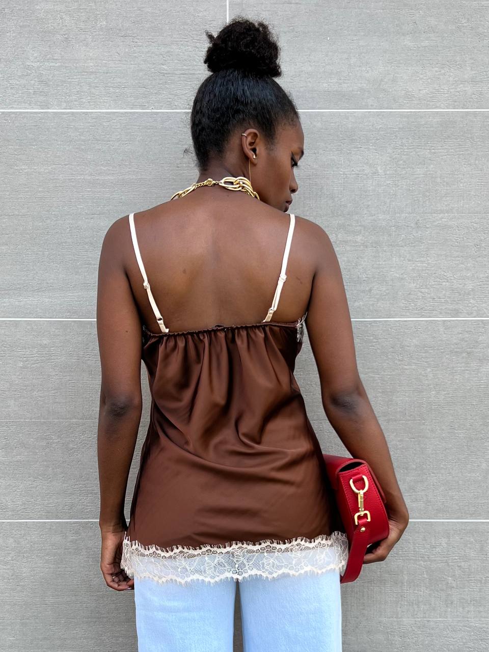 Canotta con spallina strette regolabile con dettaglio di pizzo a tinta unita.