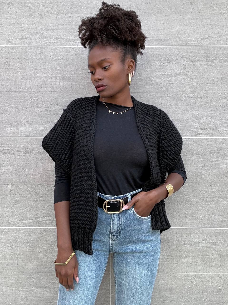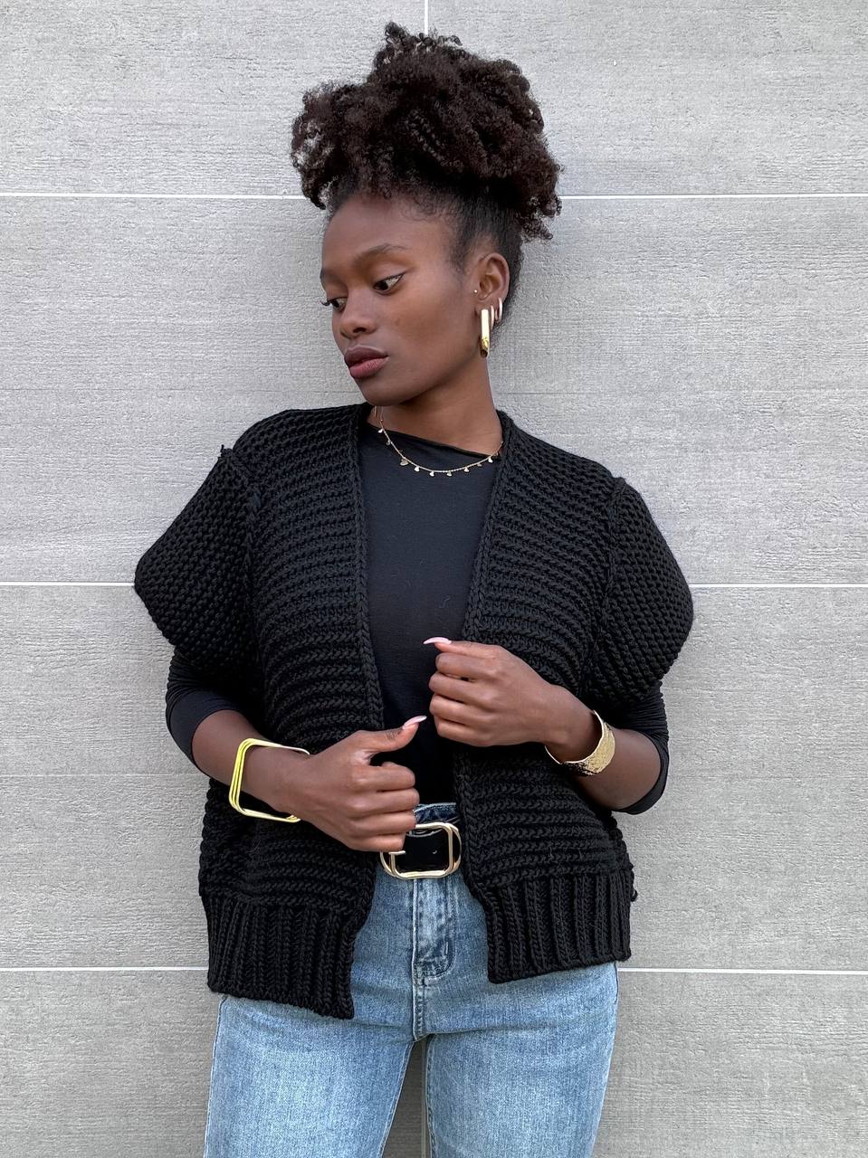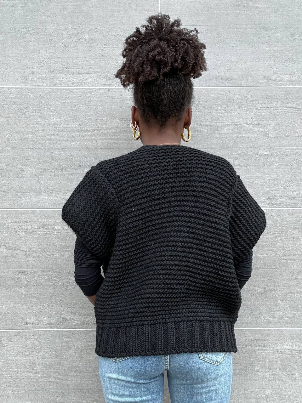 Cardigan smanicato a costine aperto elasticizzato a tinta unita.
