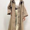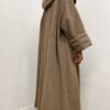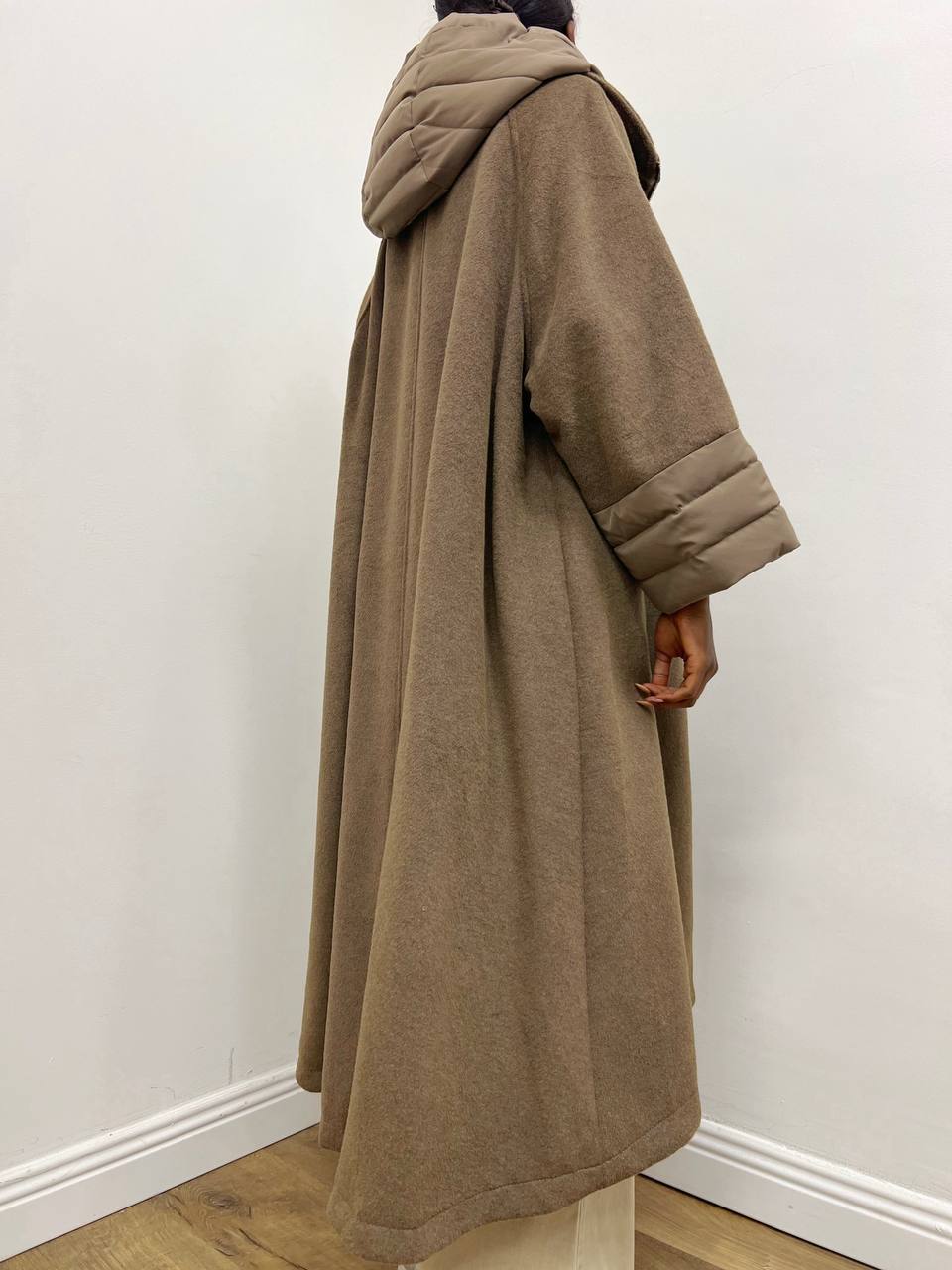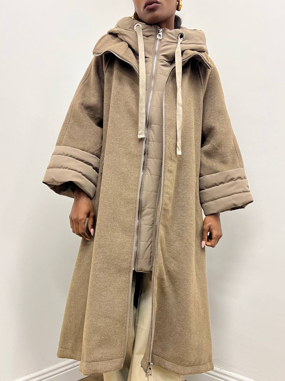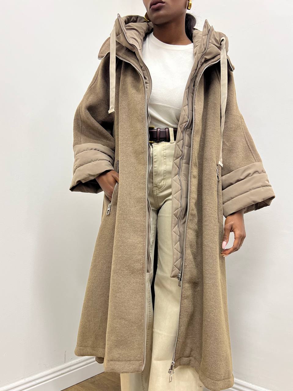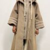 La chiusura frontale con zip argentata aggiunge un tocco moderno e funzionale, mentre il cappuccio, rivestito con lo stesso tessuto del cappotto, garantisce continuità estetica e protezione nelle giornate più fredde.