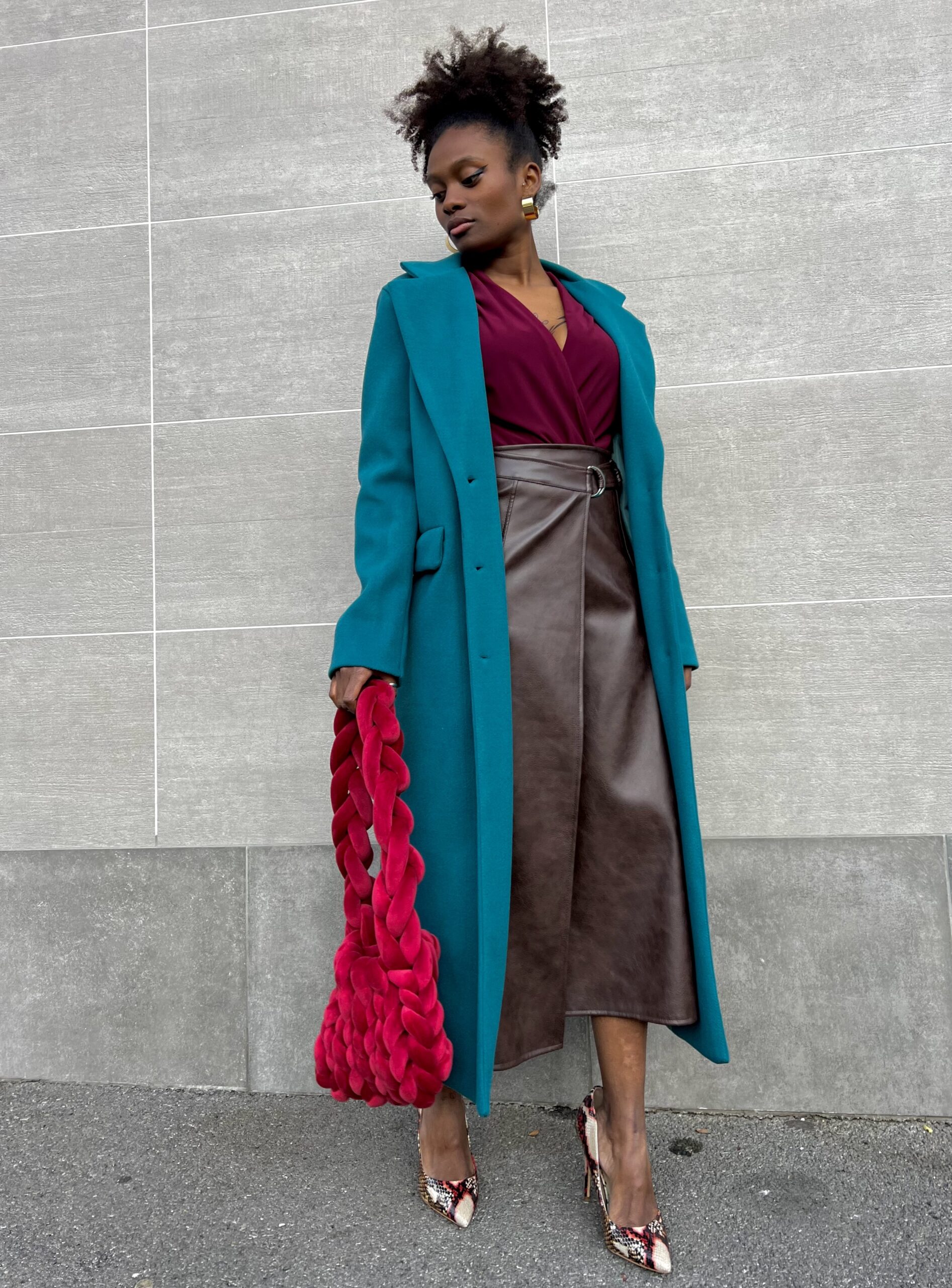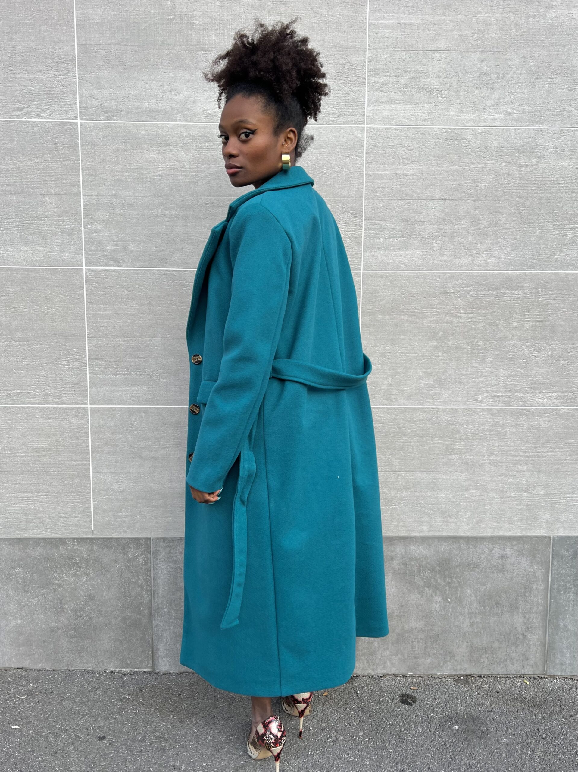 Cappotto lungo con dettaglio di bottoni su tutta la lunghezza e cinturino in vita tono su tono.
