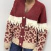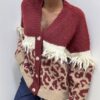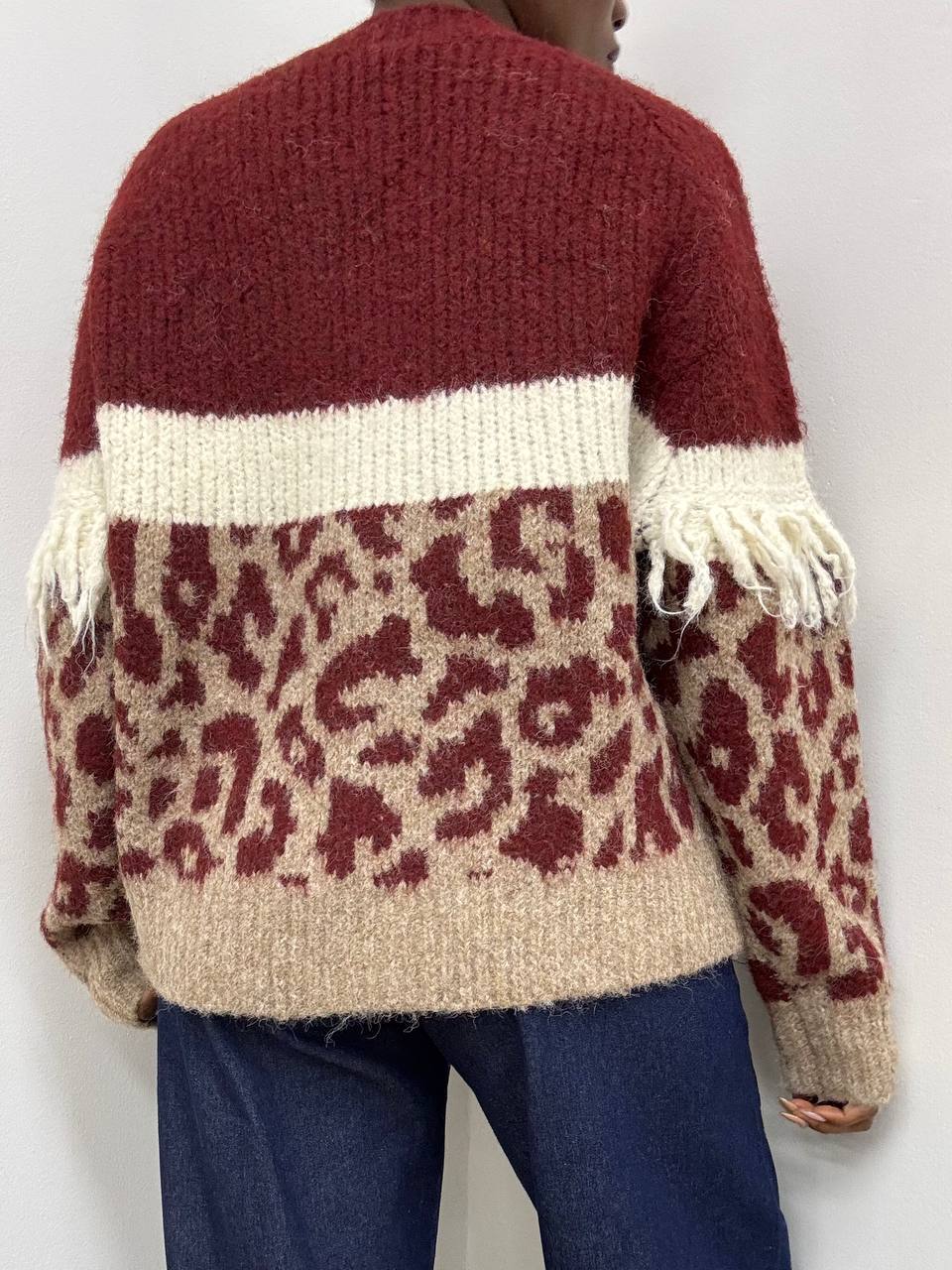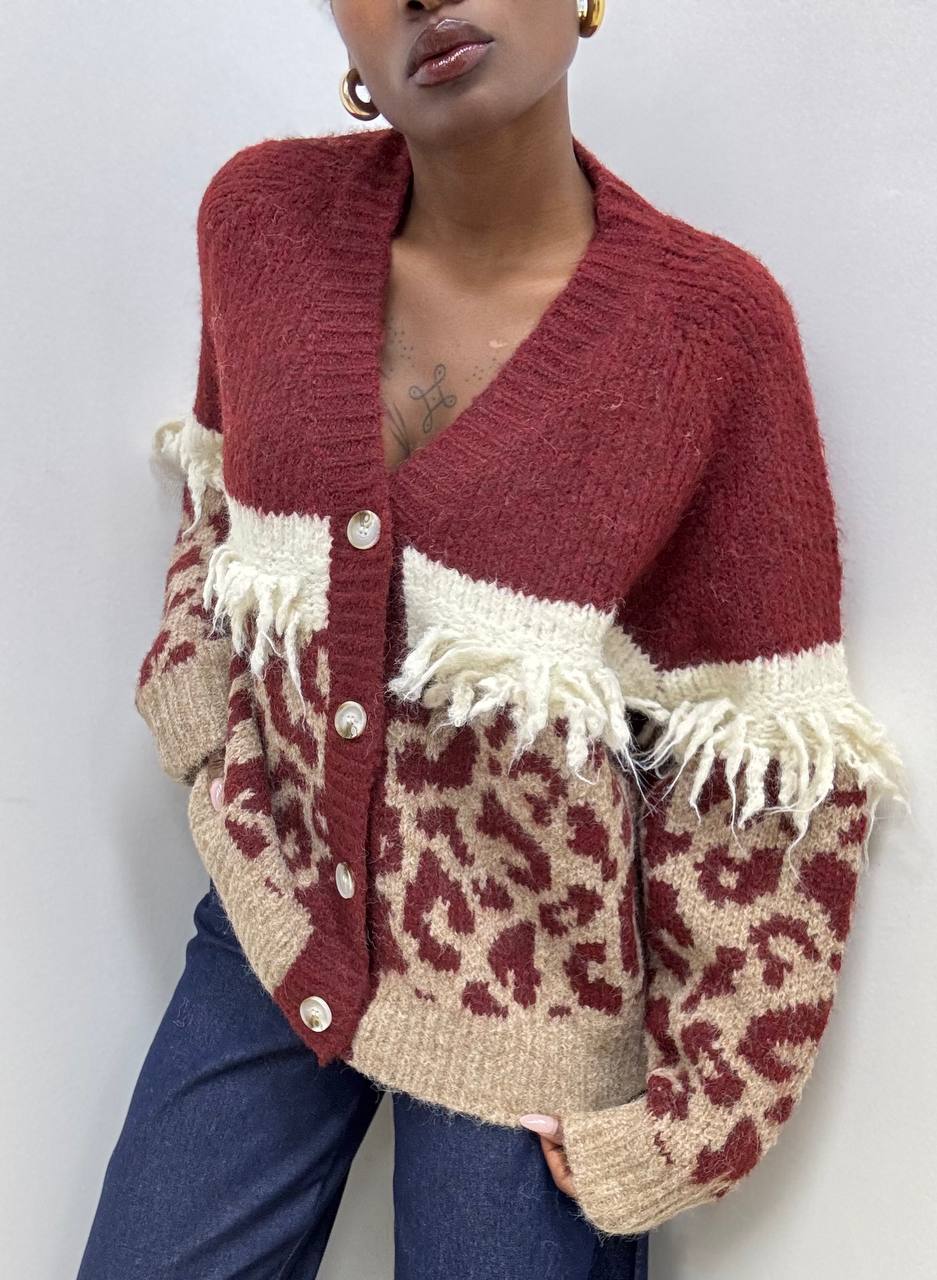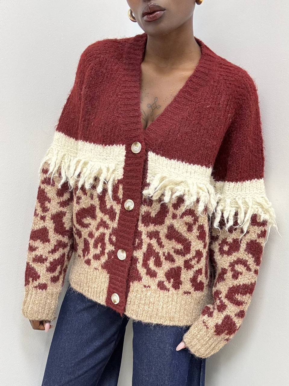 Avvolgente e dal carattere deciso, questo cardigan in maglia grossa combina comfort e stile con una palette cromatica calda e raffinata. La parte superiore in un intenso ruggine si apre su una fascia panna decorata da soffici frange, che aggiungono movimento e un tocco artigianale. Il corpo inferiore è animato da un motivo animalier jacquard nei toni del ruggine e beige, realizzato a maglia con cura per garantire definizione e durata nel tempo.
