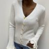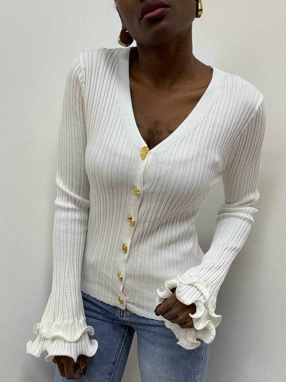 Cardigan elasticizzato a costine dal design contemporaneo, pensato per valorizzare la silhouette con una vestibilità confortevole e avvolgente. Il capo è caratterizzato da un’abbottonatura frontale impreziosita da forme geometriche, che donano un tocco moderno e distintivo al design. Le maniche terminano con un raffinato polsino a campana, elemento che aggiunge movimento e femminilità al capo. Un cardigan versatile e ricercato, ideale per completare look sia casual che più sofisticati con personalità e stile.