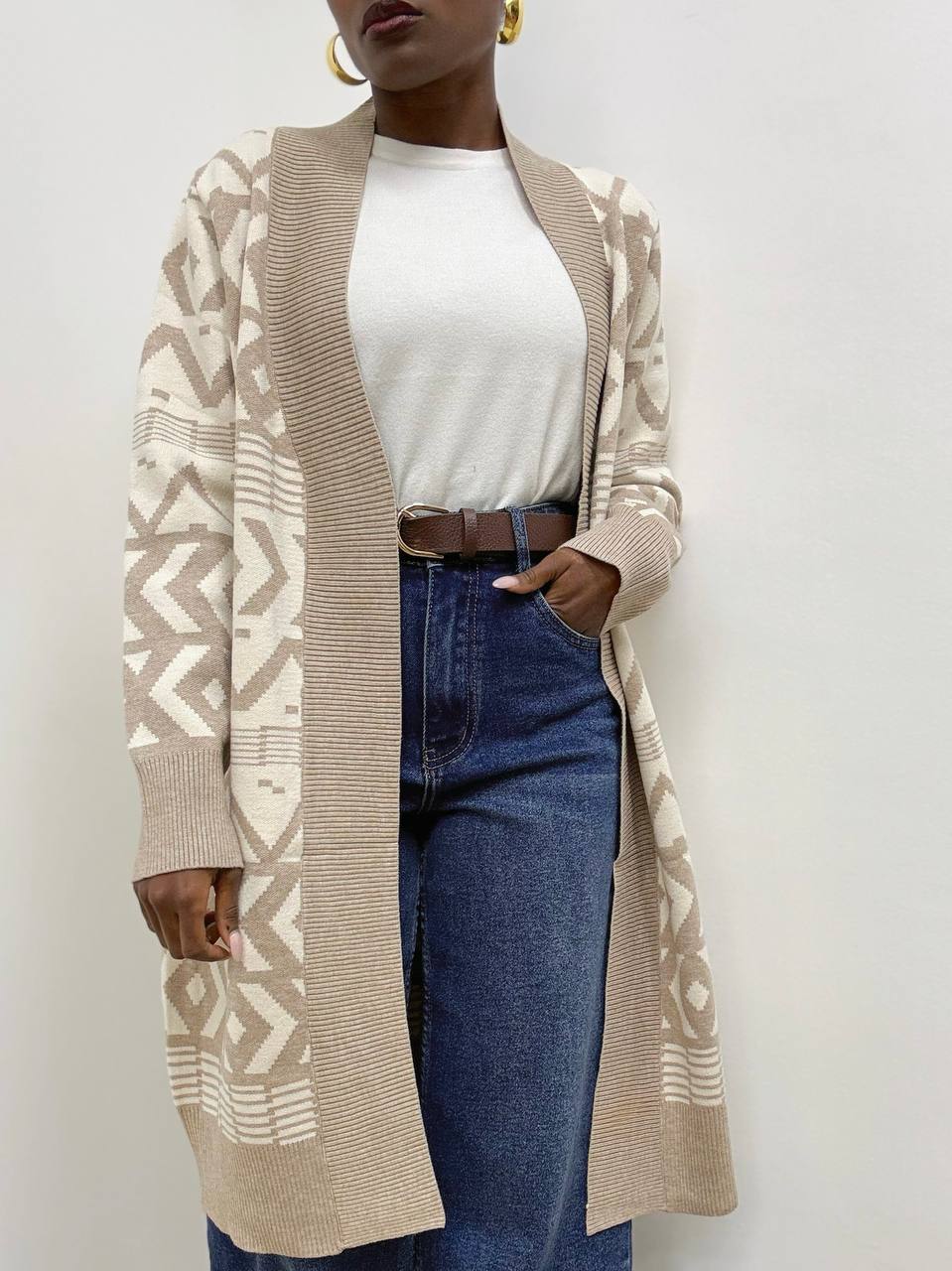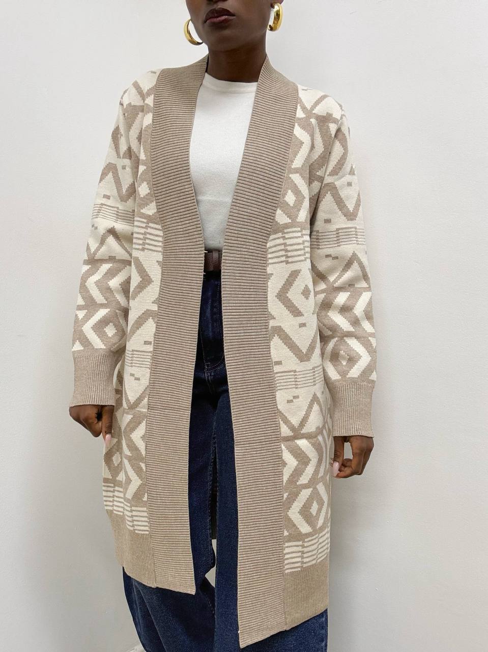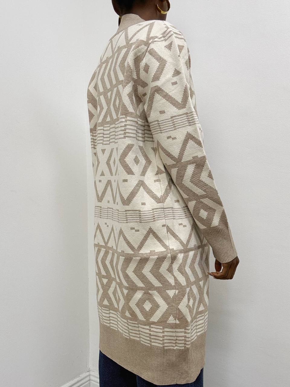 Cardigan in misto modal dal design contemporaneo e raffinato, caratterizzato da un motivo geometrico audace con blocchi di colore a contrasto. L’esterno delle maniche e i pannelli frontali presentano un elegante disegno angolare, che dona dinamismo e modernità alla silhouette. La parte interna e il colletto a coste sono realizzati in un marrone solido, offrendo equilibrio visivo e un tocco di calore al capo.