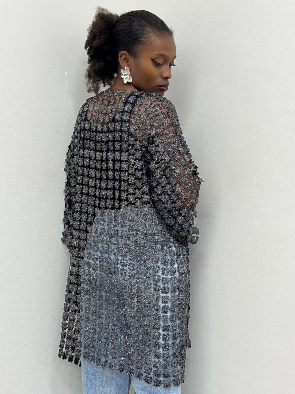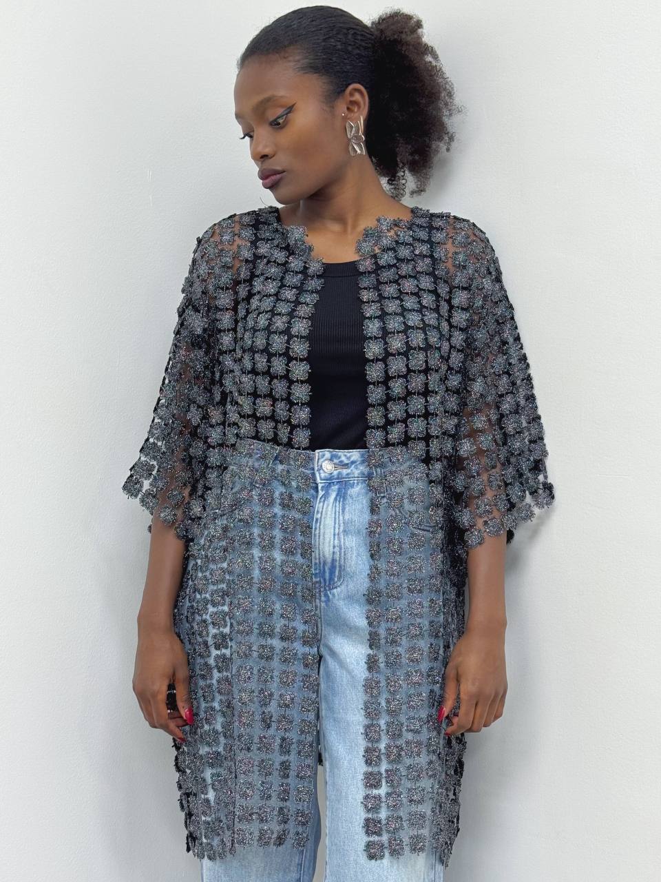 Cardigan traforato in lame’ aperto su tutta la lunghezza. Adatto per qualsiasi occasione. Elegante.