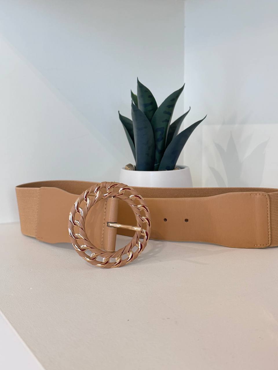 Cintura elasticizzata con fibbia circolare con dettaglio di lurex all’interno. Possibilità di fare i buchi