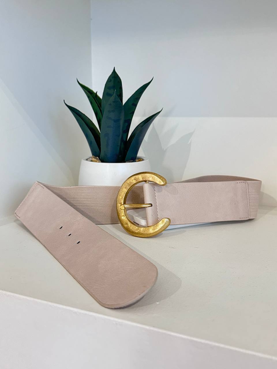 Cintura con fibbia circolare color oro elasticizzata.