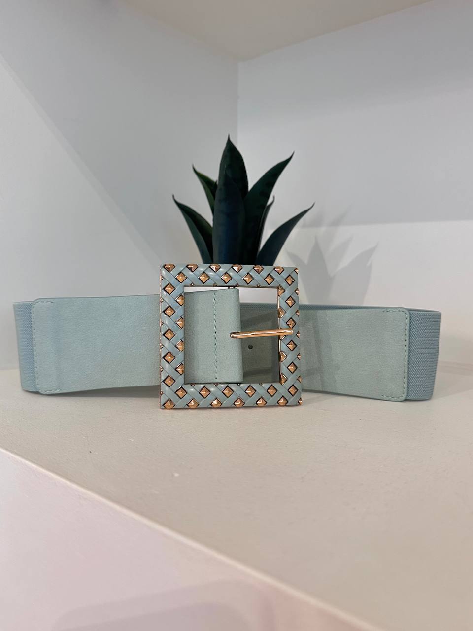 Cintura con fibbia quadrata con dettaglio di borchie su tutta la fibbia.