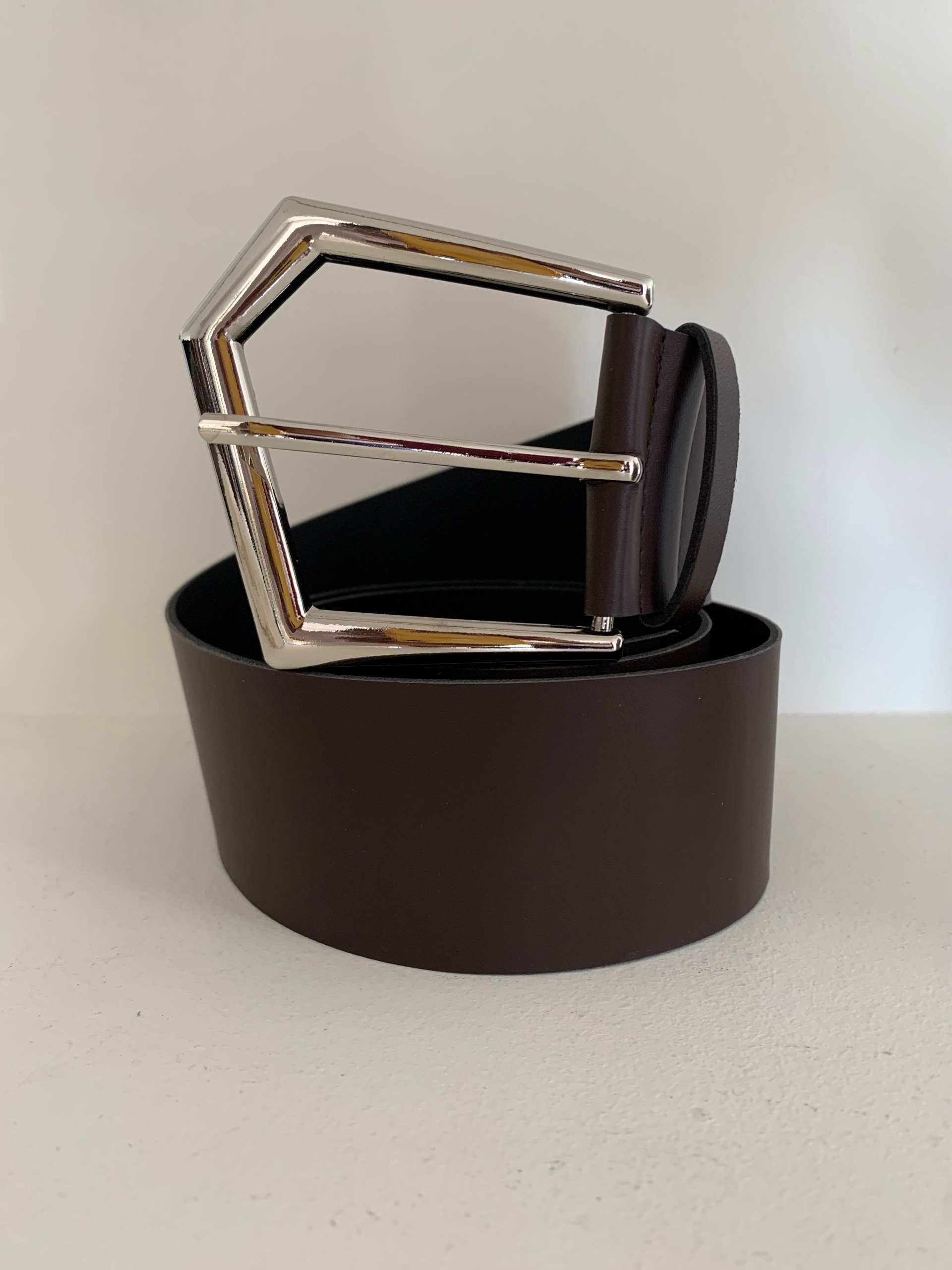 Scopri l’equilibrio perfetto tra geometria e stile con questa cintura unica nel suo genere, presenta una fibbia esagonale in finitura argento lucido, che dona un tocco moderno e deciso al design classico.