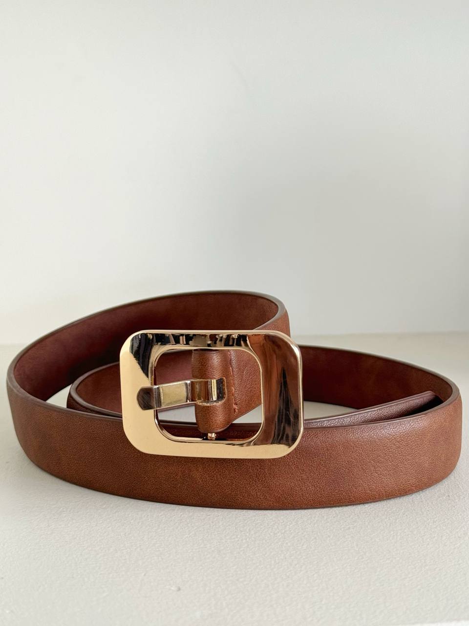 La fibbia rettangolare, in metallo color oro, aggiunge un tocco raffinato e luminoso al design. Lineare ma decisa, si distingue per la sua forma pulita e contemporanea, creando un piacevole contrasto con il tono caldo del marrone.