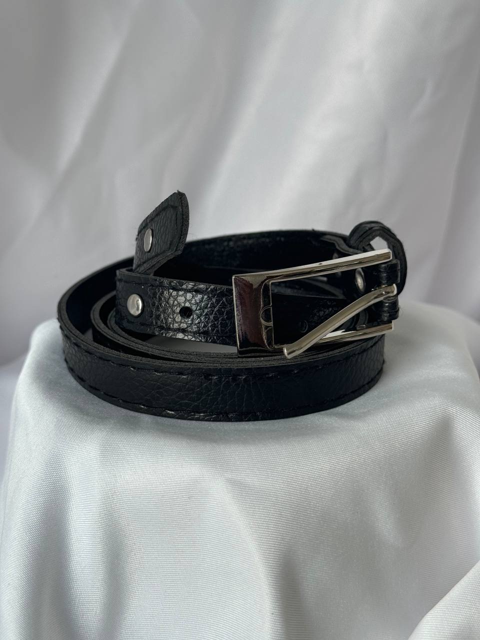 Cintura sottile con fibbia quadrata con dettaglio di borchie su tutta la lunghezza.
