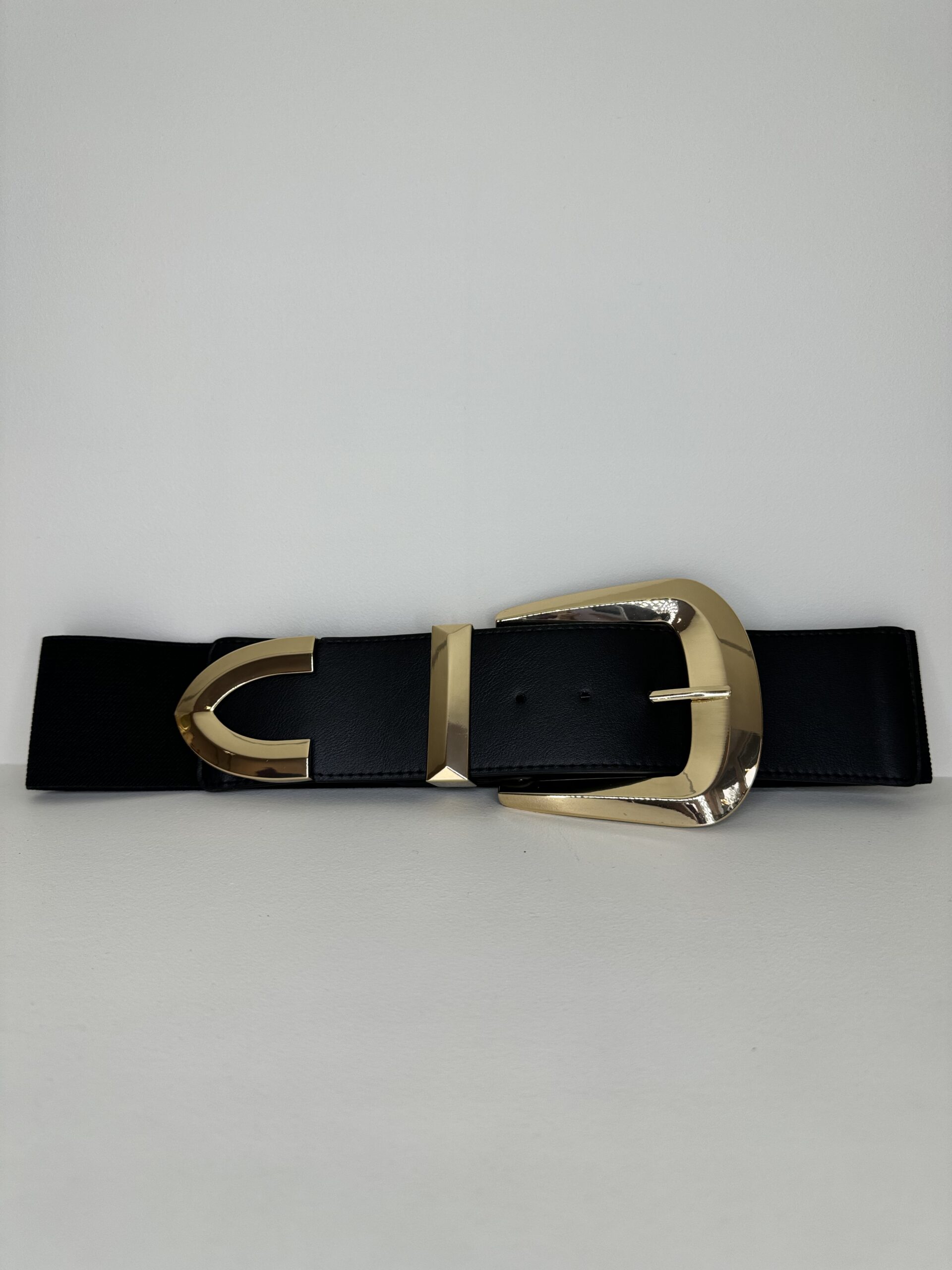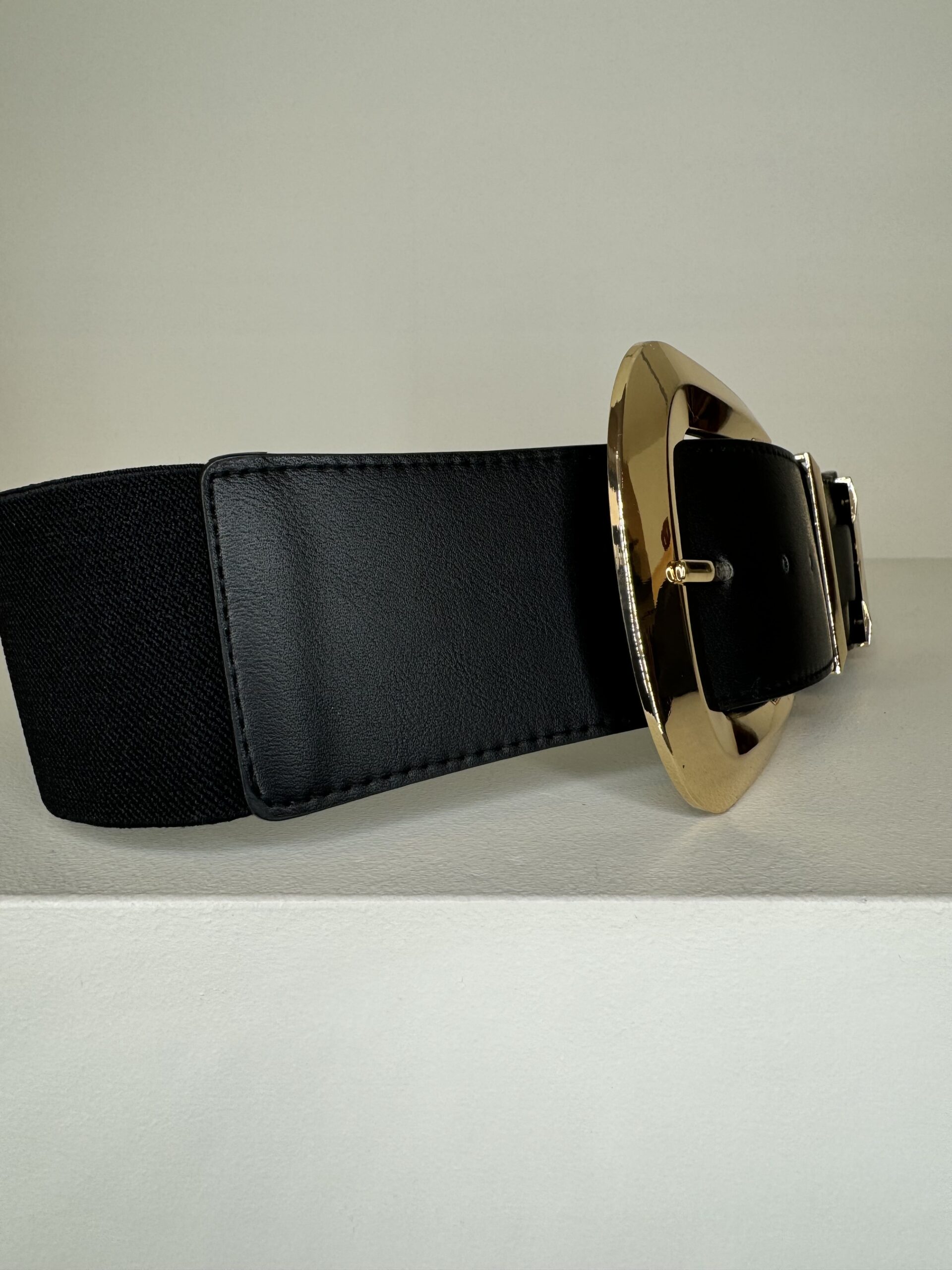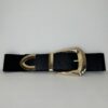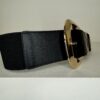 Cinturone con fibbia quadrata color oro elasticizzata a tinta unita con dettaglio di semi sfera sulla parte finale.