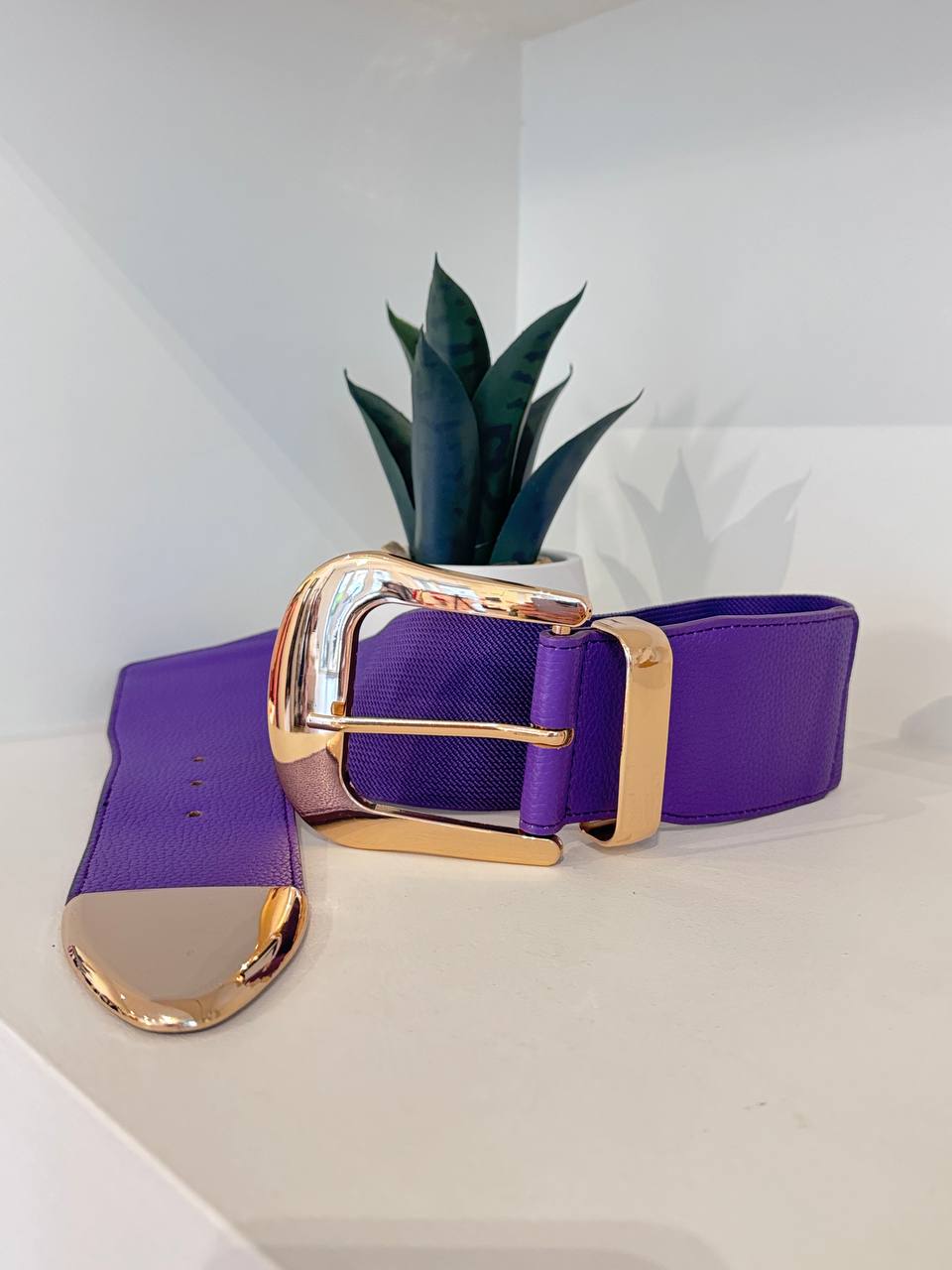 Cinturone con fibbia quadrata color oro elasticizzata a tinta unita con dettaglio di semi sfera sulla parte finale.