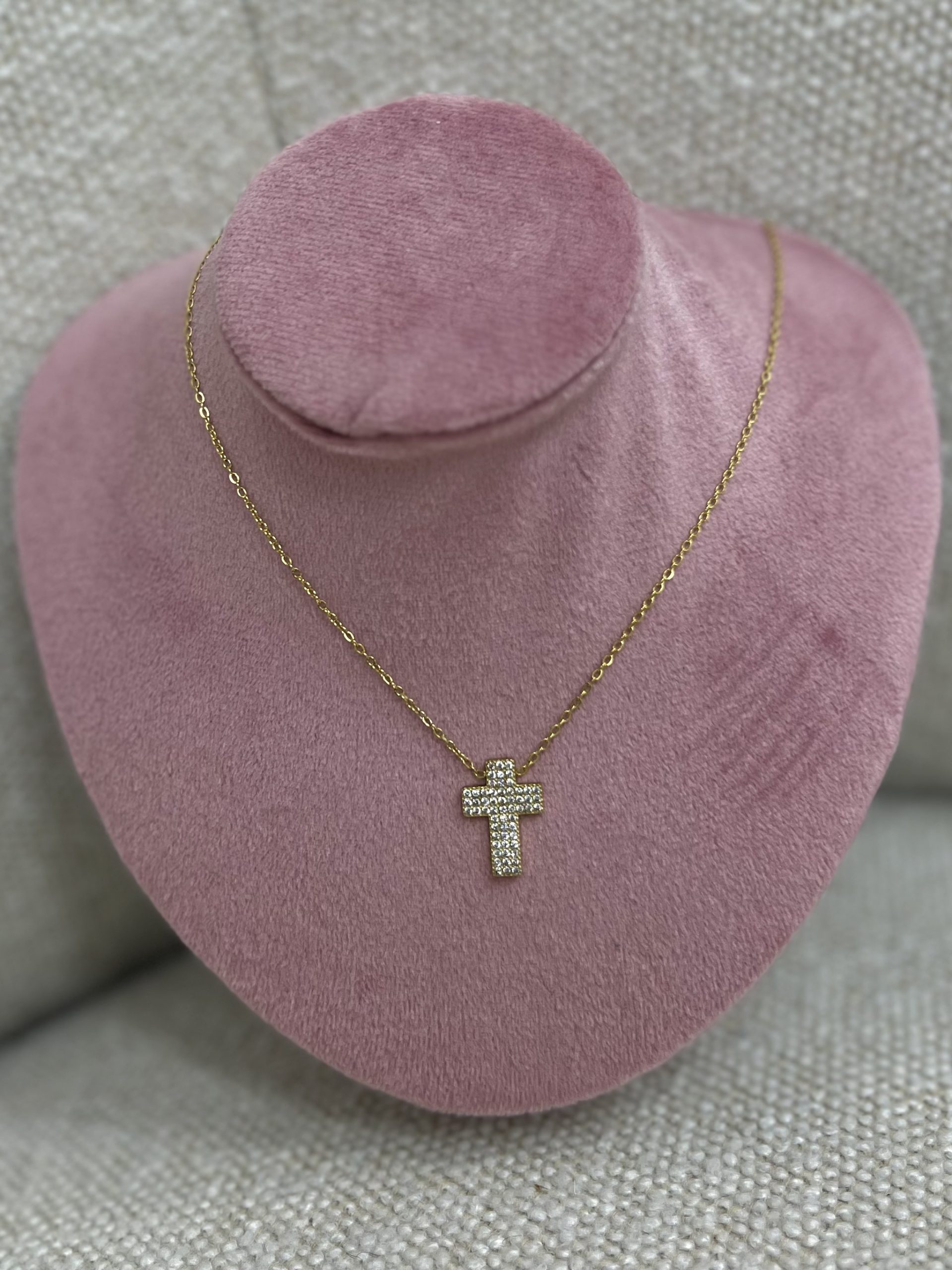 Collana oro con croce con dettaglio di brillantini incastonati.