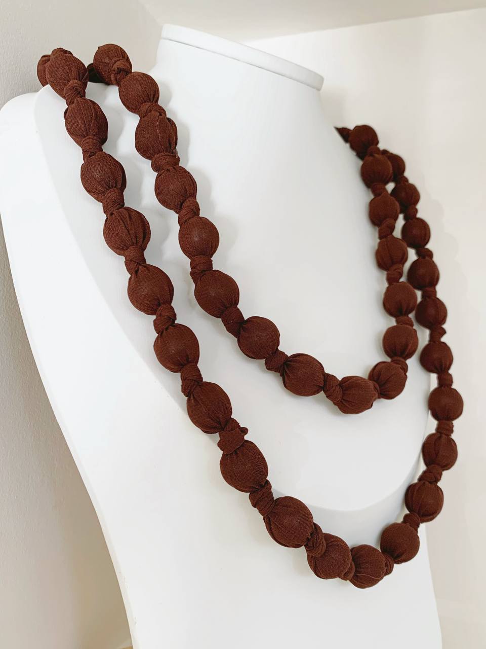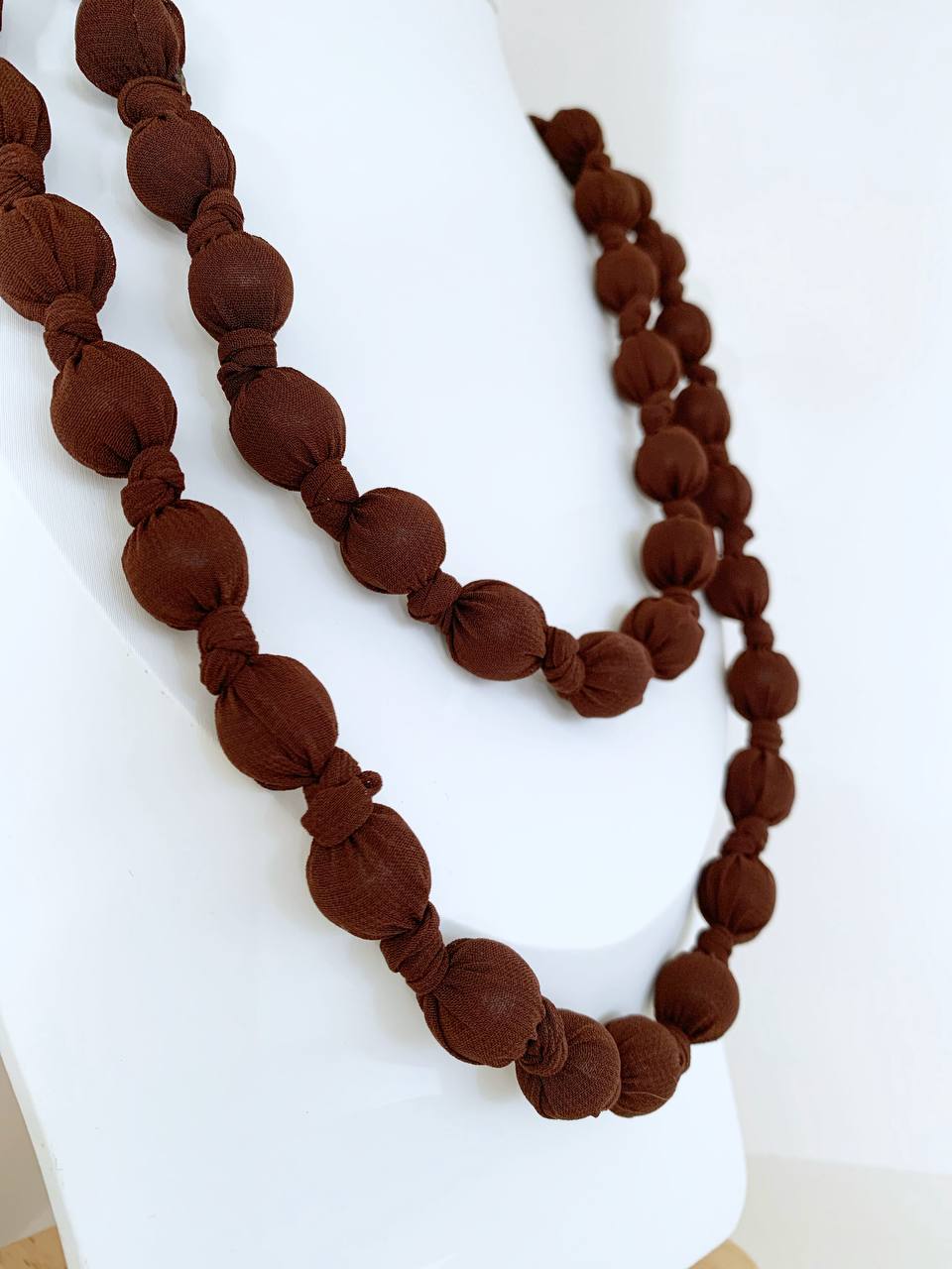 “Leggera e versatile, la collana Doan Nodi è composta da palline di legno leggerissimo ricoperte di morbido cotone, che le conferiscono un aspetto naturale e tattile, oltre a un comfort unico durante la giornata. Il design semplice ma raffinato permette di indossarla in diversi modi: può essere portata lunga, per un look più elegante e slanciato, oppure avvolta fino a tre giri, creando un effetto più dinamico e stratificato. Perfetta per chi ama accessori artigianali, versatili e dal fascino naturale, la collana Doan Nodi aggiunge un tocco di stile discreto ma originale a ogni outfit.