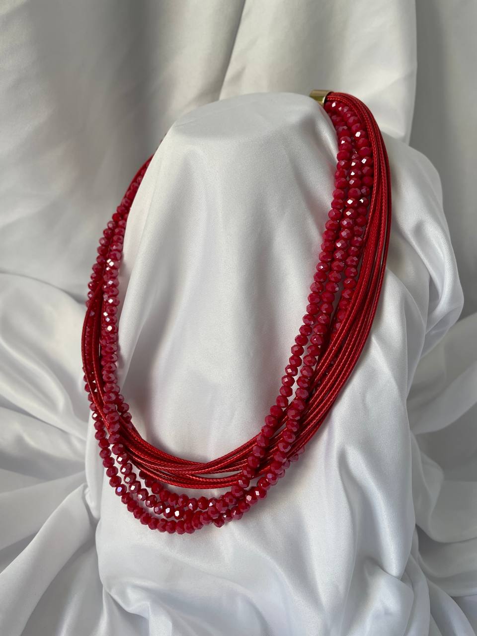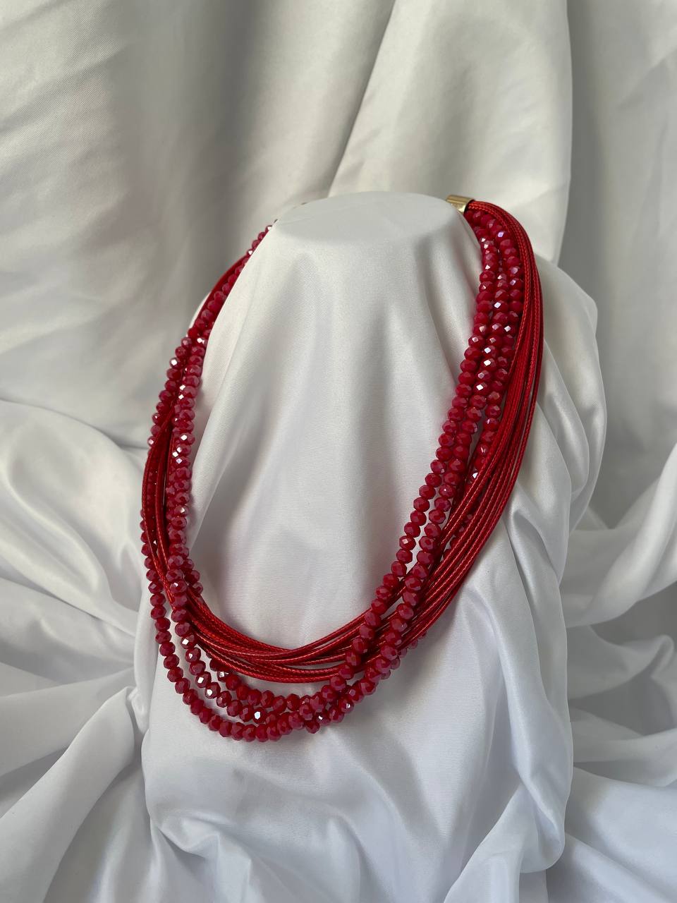 Collana a cascata con leggeri filamenti a tinta unita con piccole perline. Regolabile.