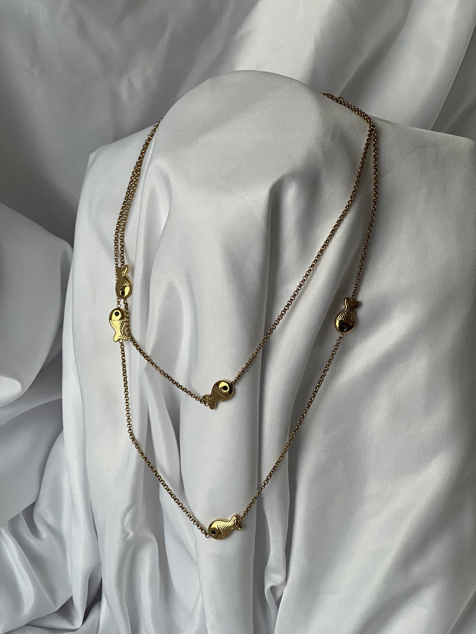 Collana con dettaglio di pesci su tutta la lunghezza. Regolabile.