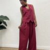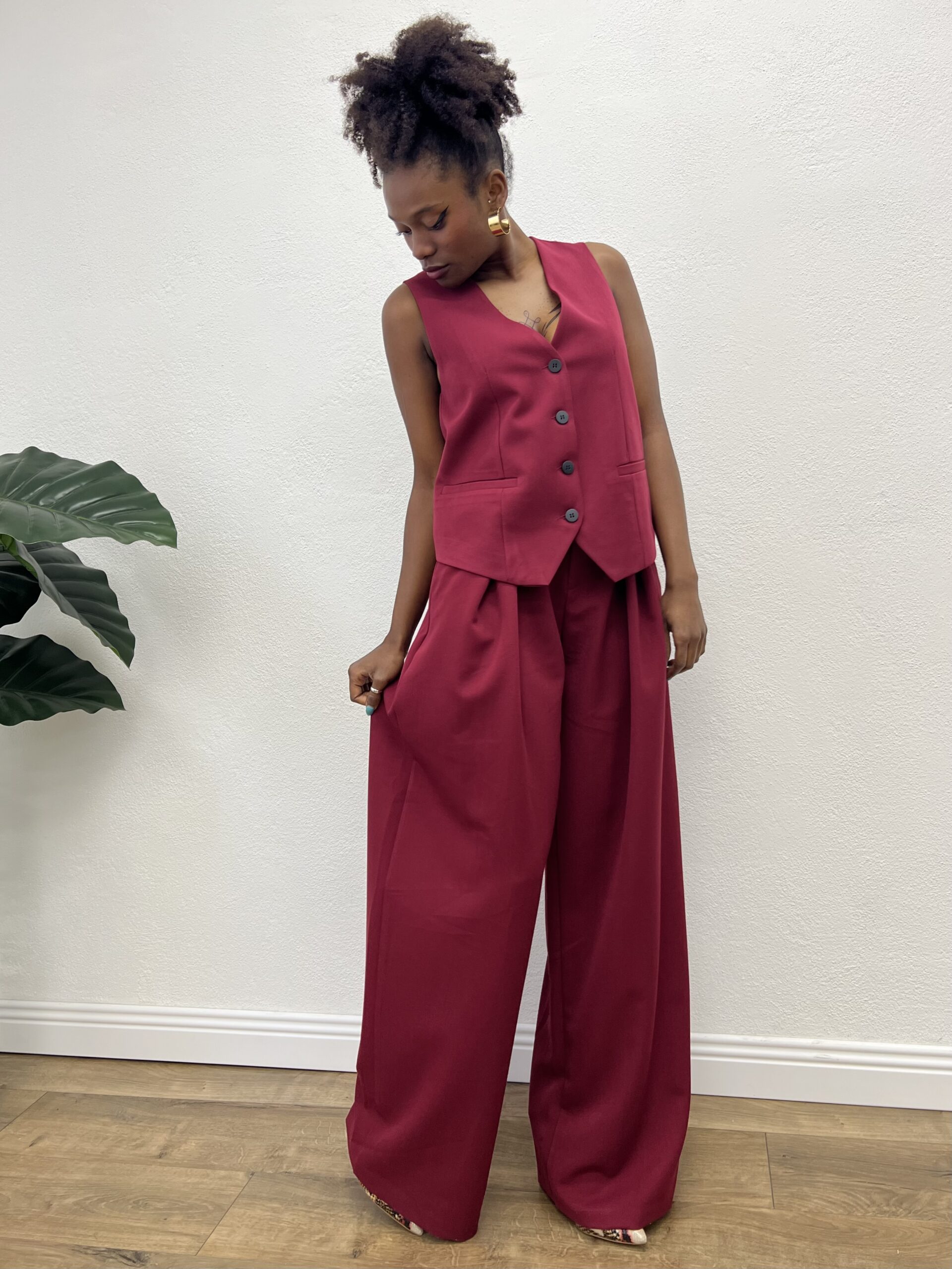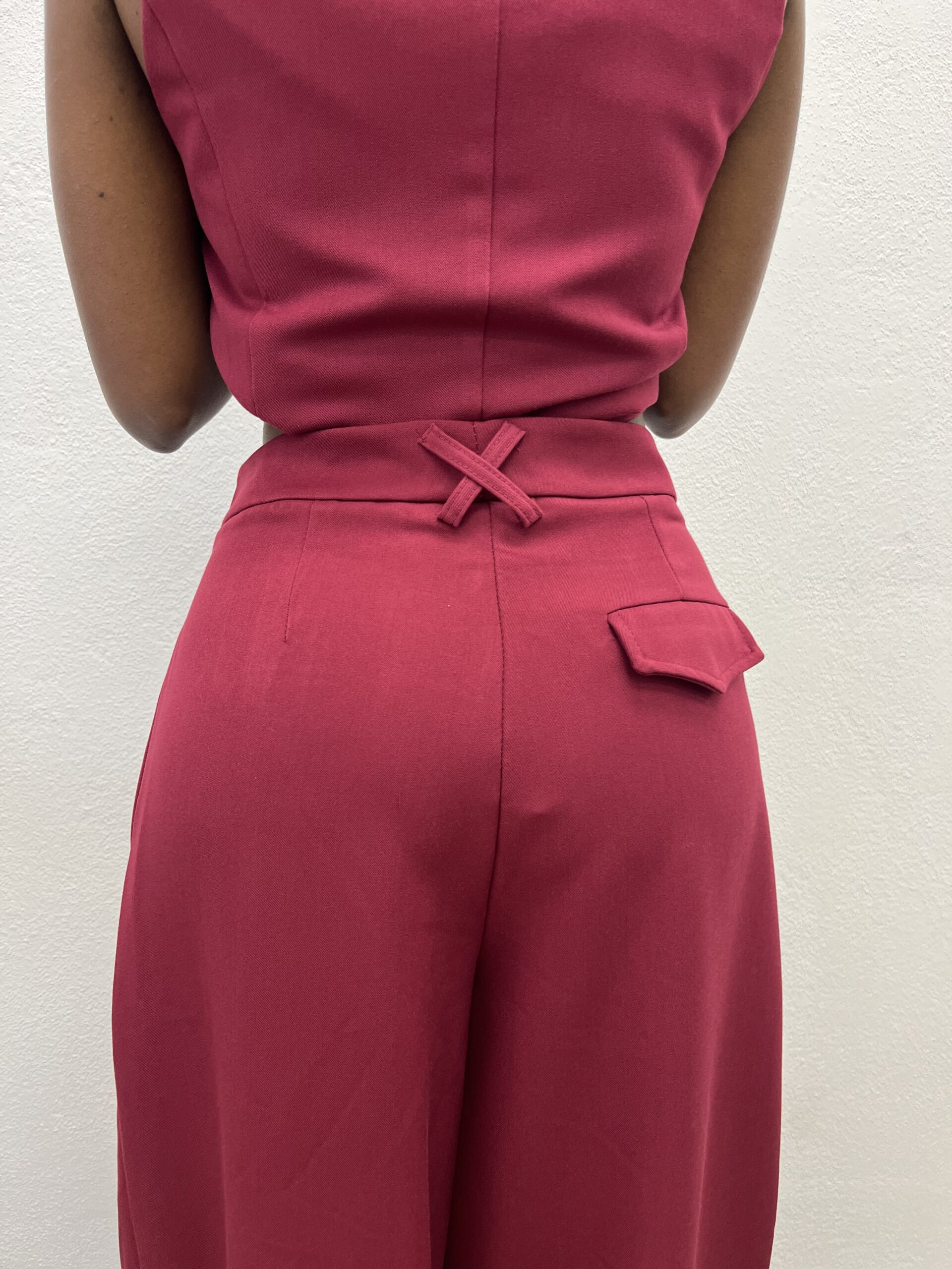 Pantalone a palazzo con bottone e zip con taschine laterale.
