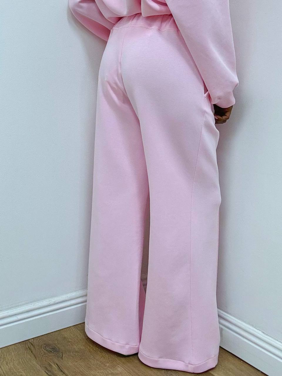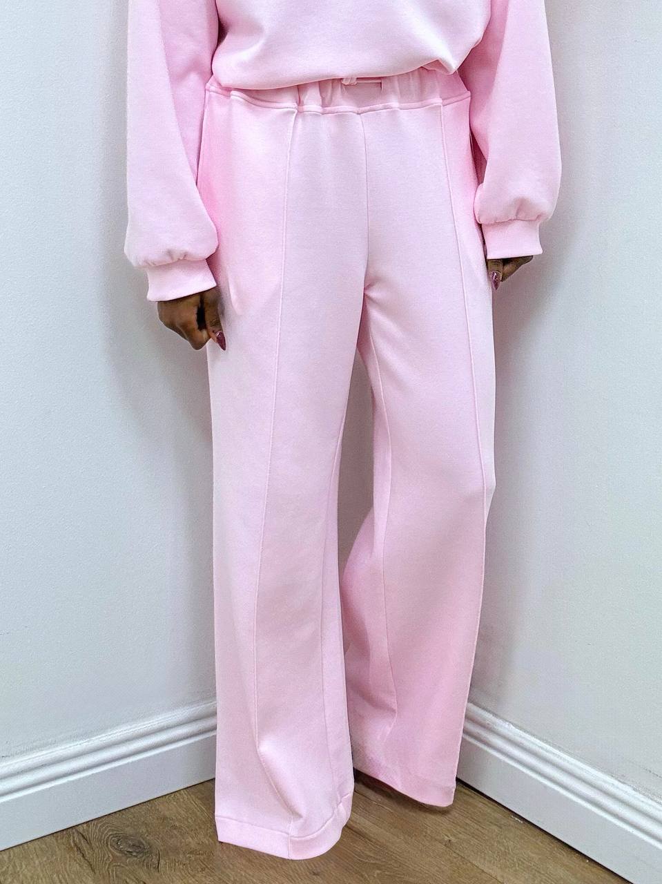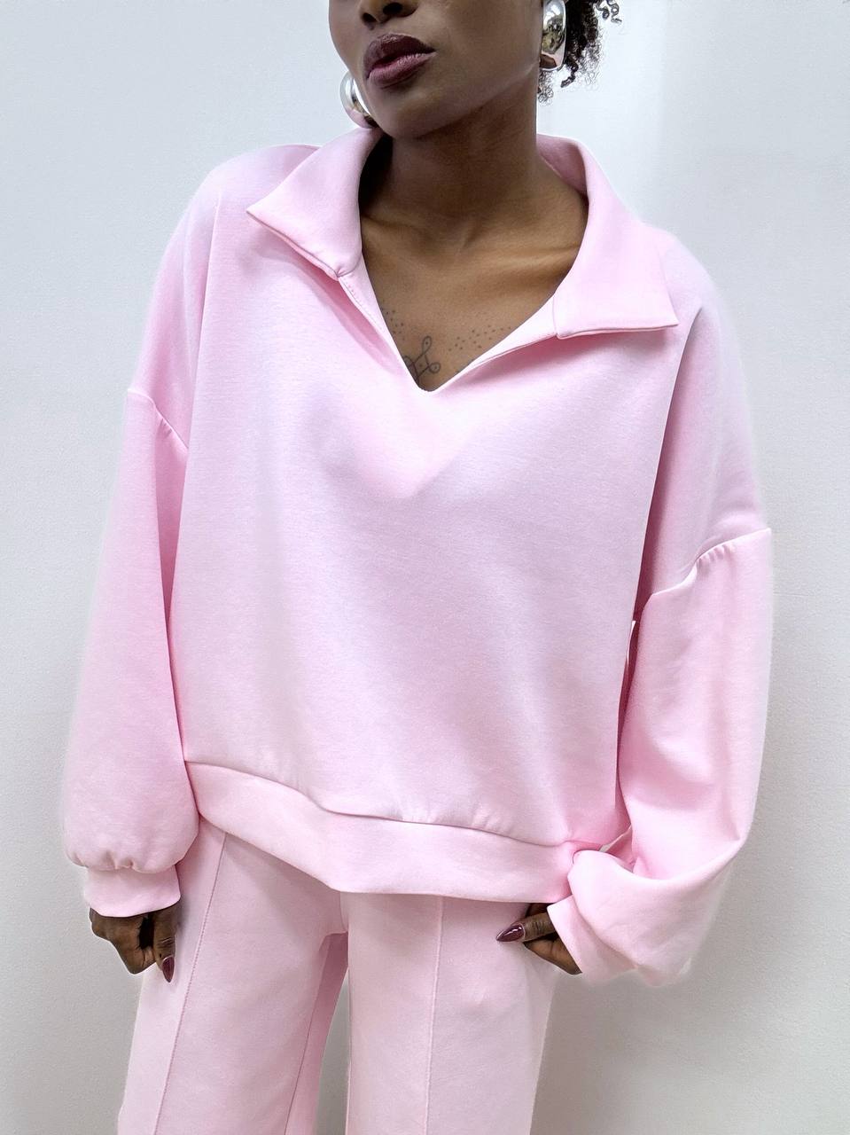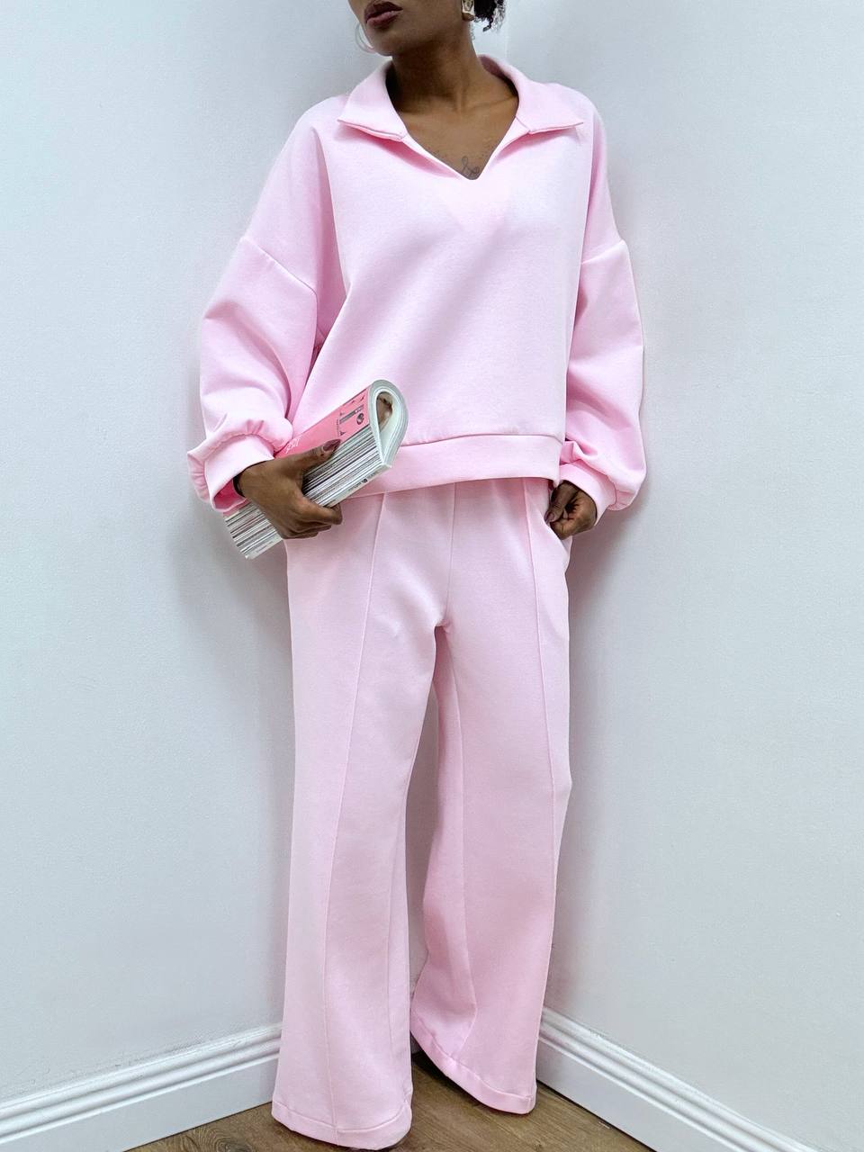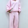 Completo in misto cotone composto da una maglia leggera con scollo a V e maniche morbide e dal  pantalone a gamba larga con elastico posteriore, coulisse e taschine. Il mix perfetto di comfort e stile senza sforzo. Pancino compatibile.