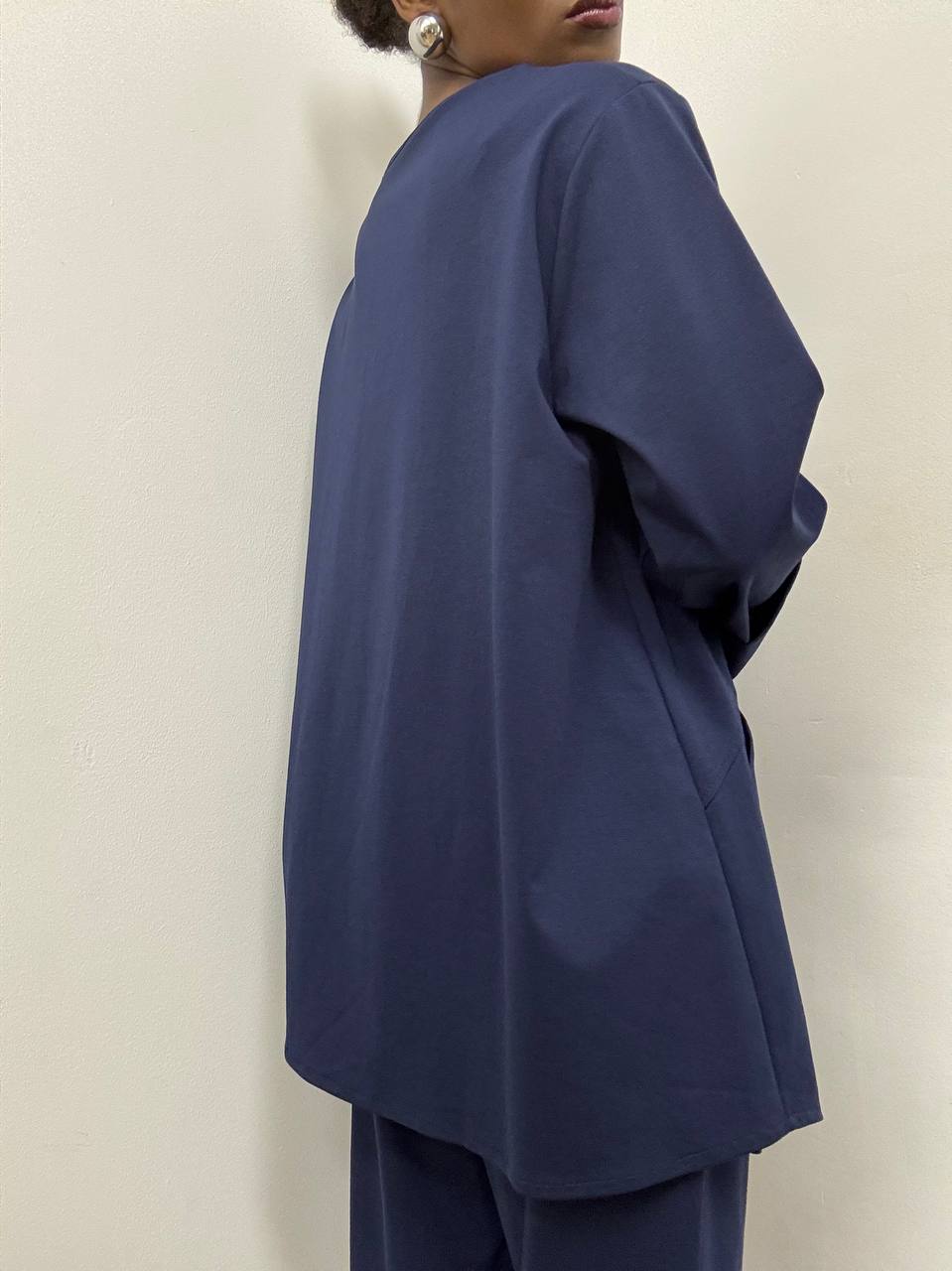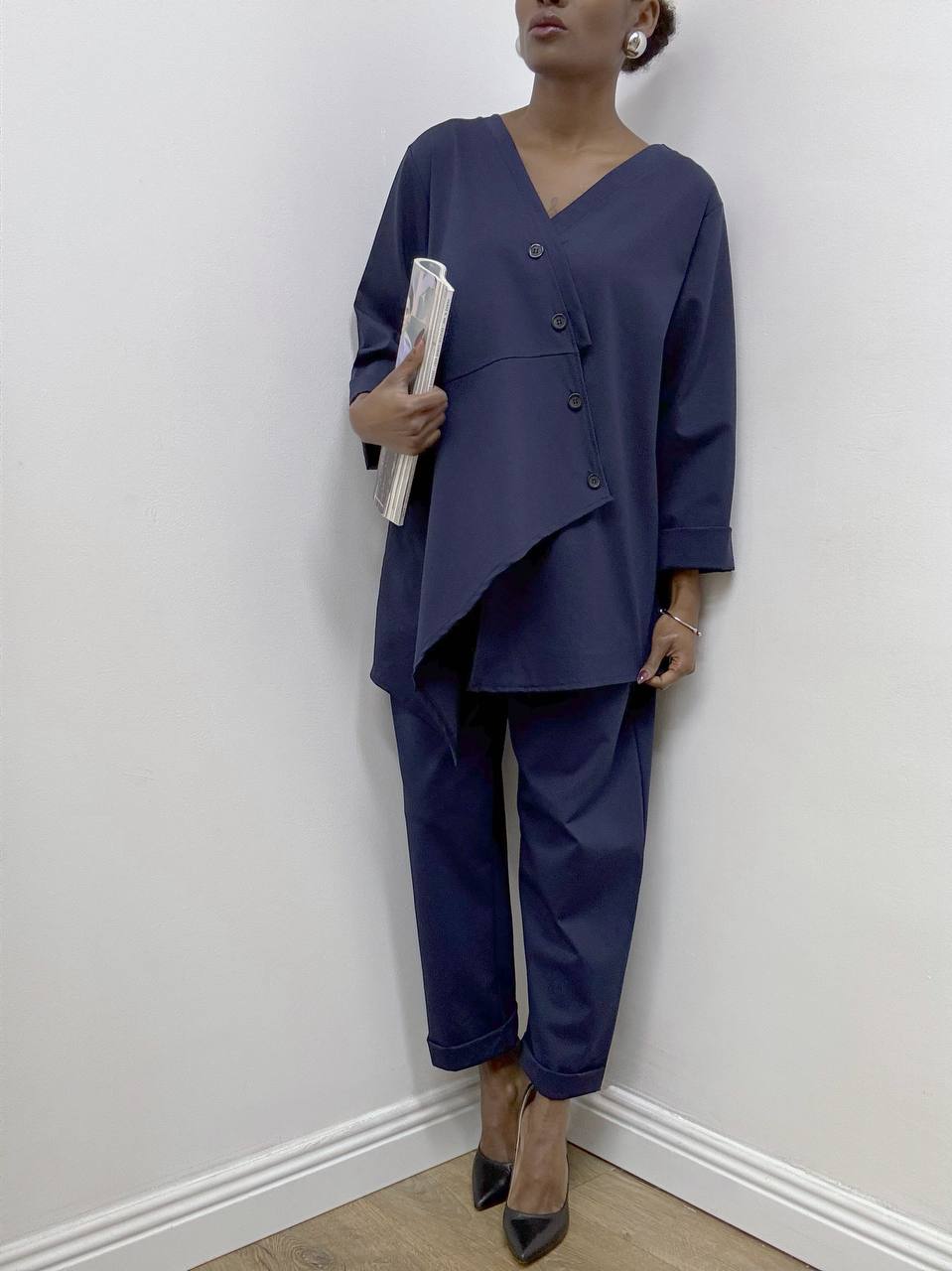 Completo raffinato dal design contemporaneo, composto da blusa e pantalone coordinati.