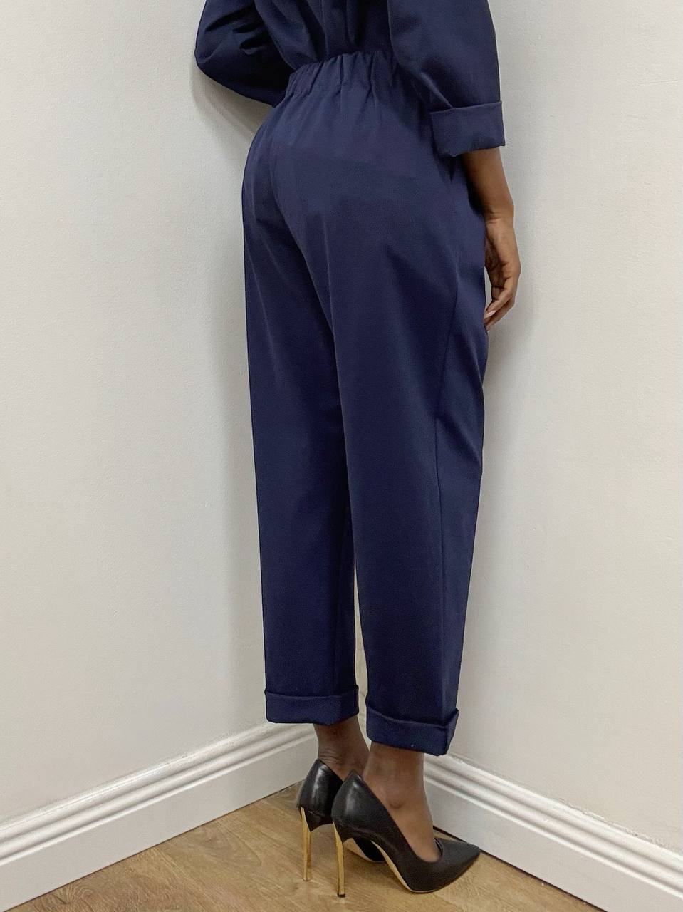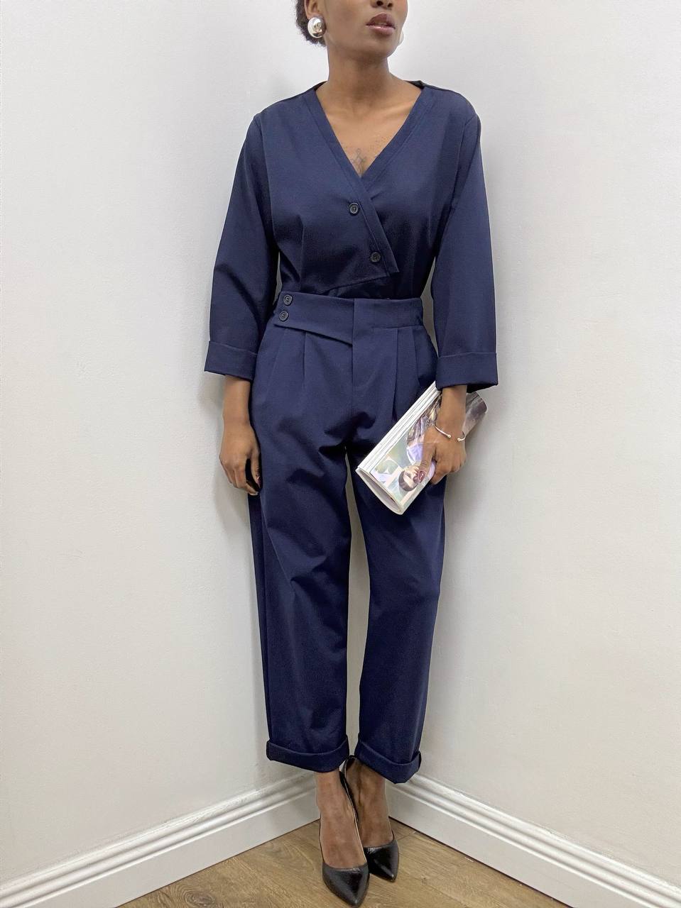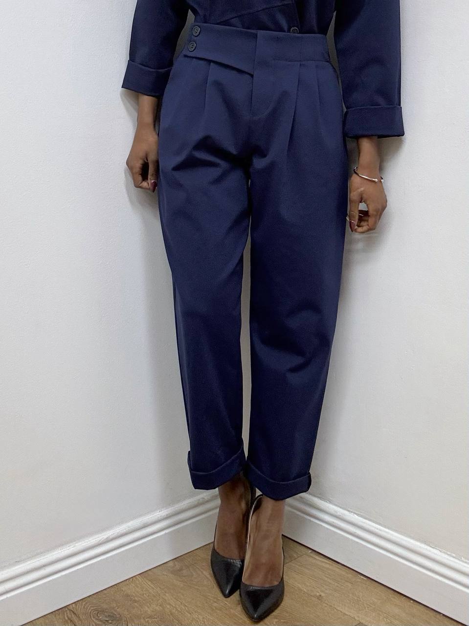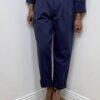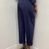 Il pantalone, dal taglio carrot, si distingue per la linea morbida sui fianchi che si restringe verso il fondo, creando una silhouette slanciata e attuale. La chiusura con bottoni laterali enfatizza l’estetica minimale e ricercata, mentre le pinces frontali strutturano il capo donando volume controllato e comfort.