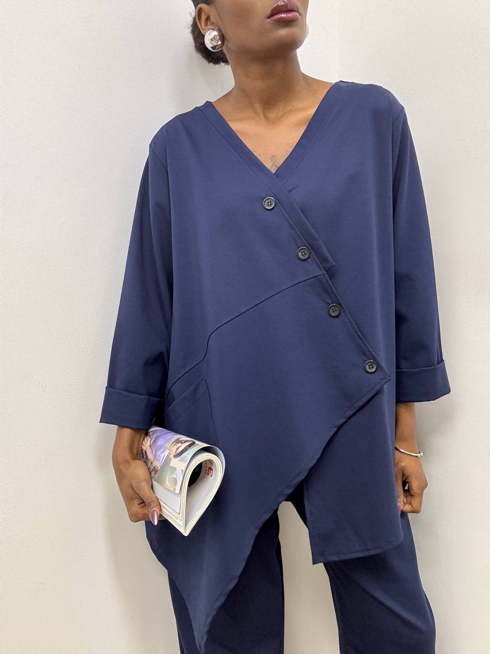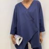 La blusa presenta un taglio morbido che accarezza delicatamente la silhouette, con scollo a V e chiusura incrociata asimmetrica che dona movimento e carattere al capo. Le linee pulite ed essenziali valorizzano l’equilibrio delle proporzioni, mentre le maniche lunghe regolabili permettono di adattare lo stile alle diverse esigenze. Completa il design una tasca applicata frontale, dettaglio funzionale che aggiunge un tocco moderno e disinvolto.