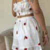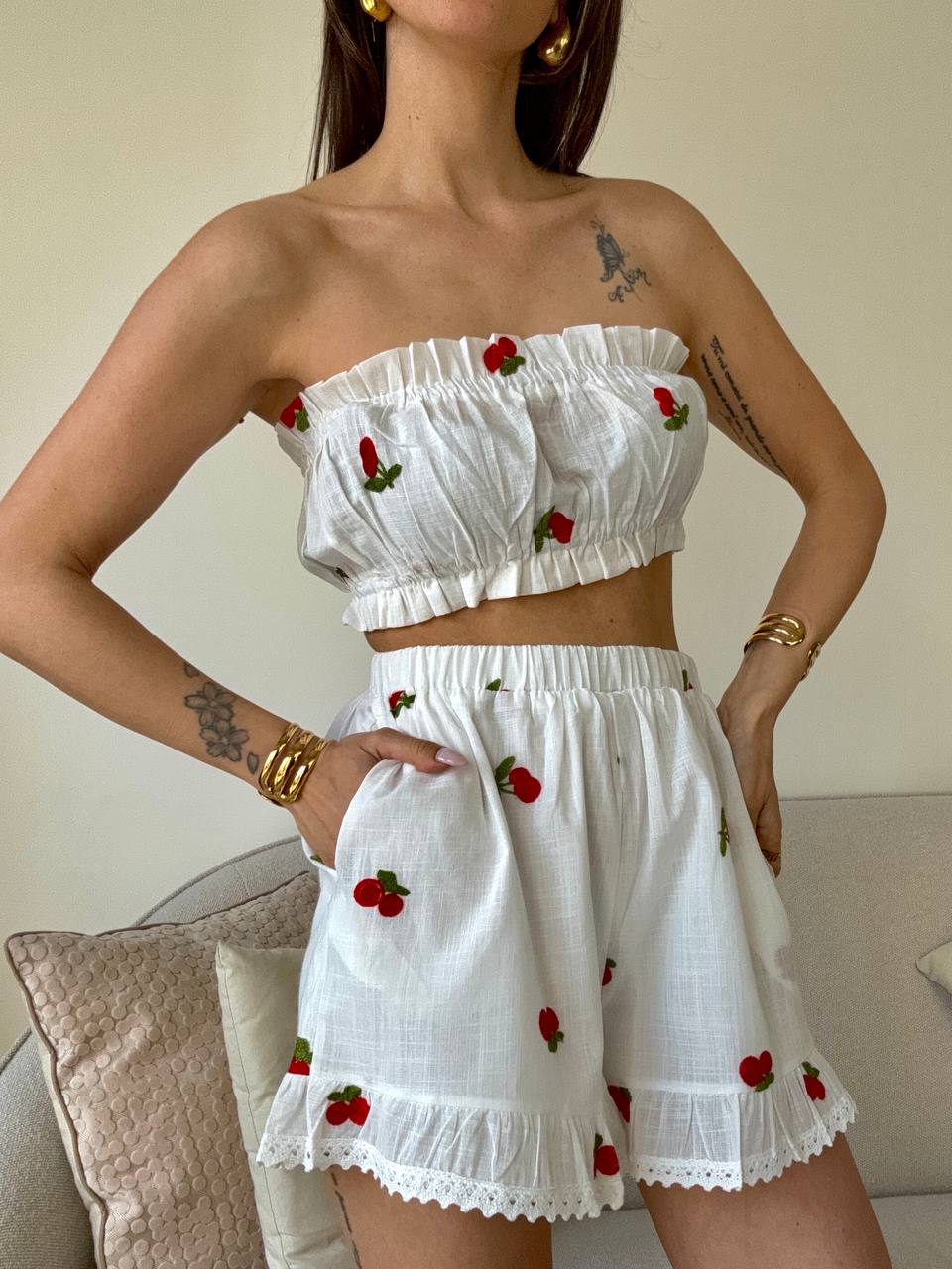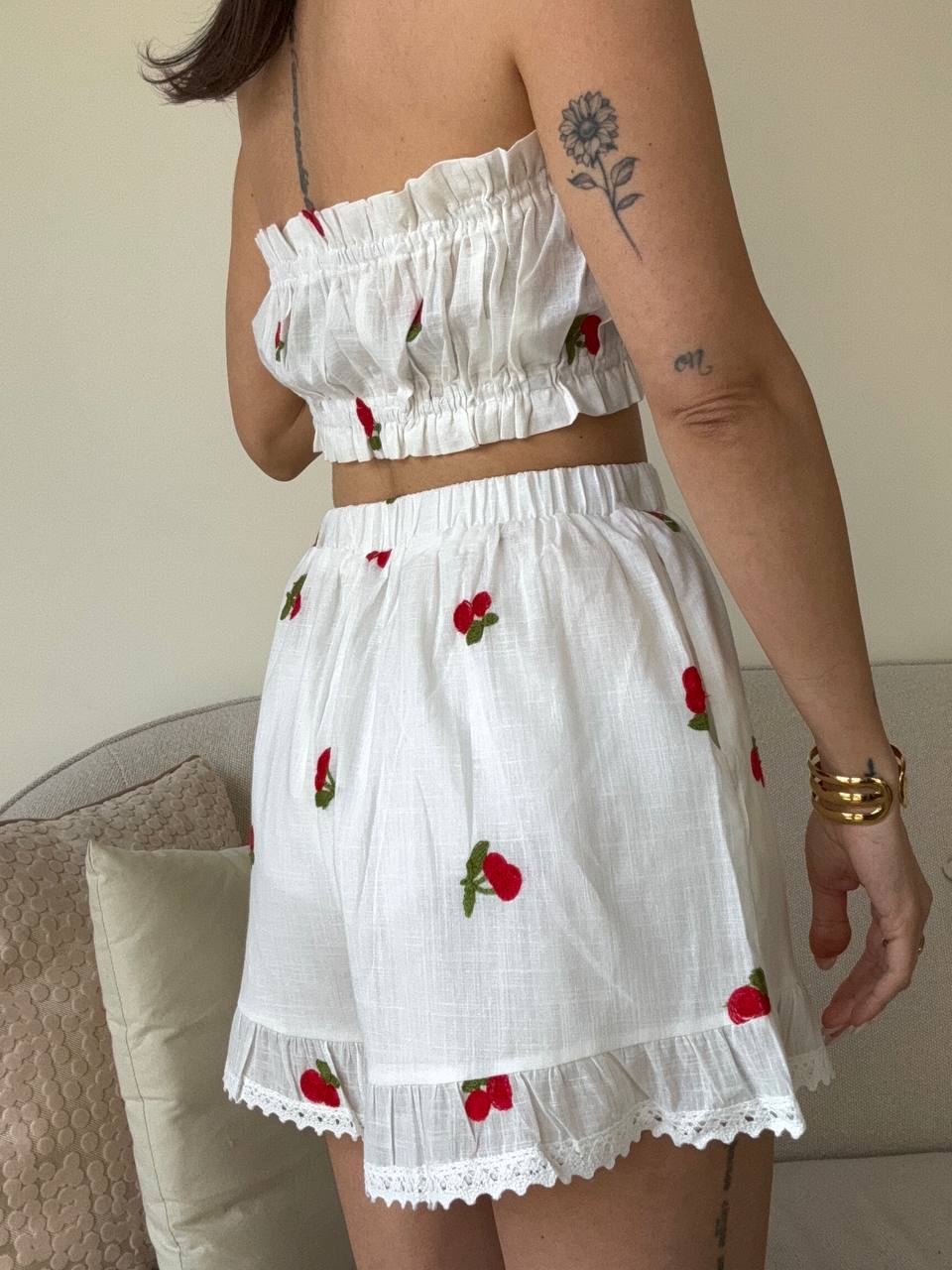 Shorts elasticizzato con ciliegia con dettaglio di pizzo sul bordo del pantalone.