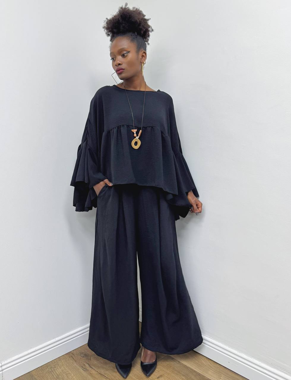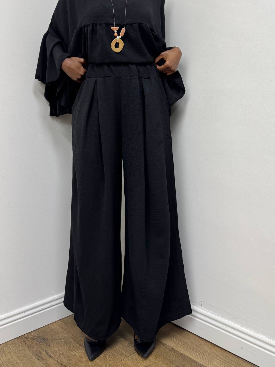 Pantalone a gamba larga elasticizzato sul punto vita a tinta unita. Taschine laterali. Dotato di passanti per cintura. Consistenza morbida e leggera.