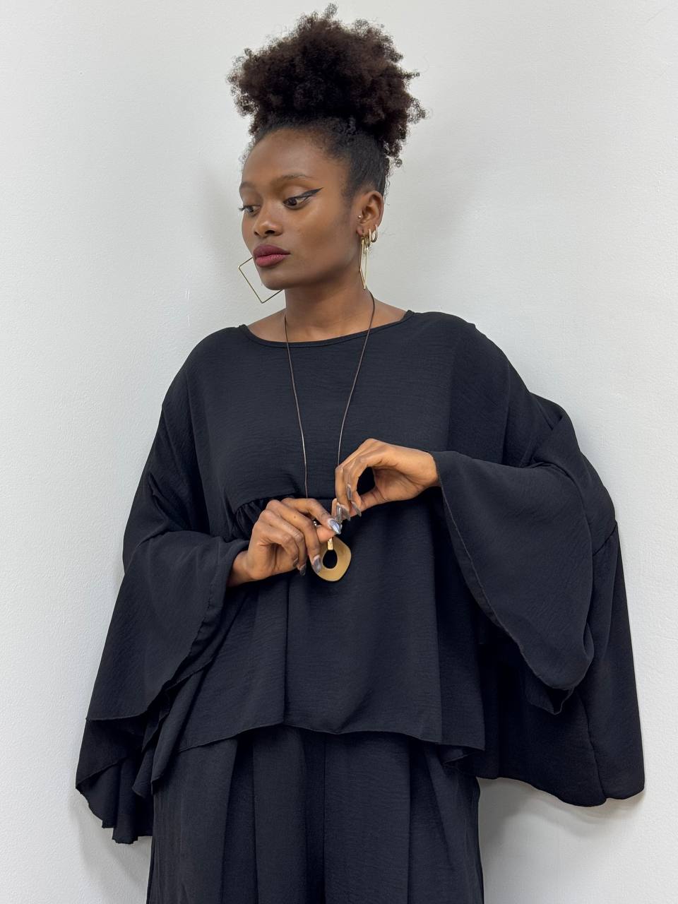Maglia a girocollo a tinta unita con manica larga. Dettaglio di ciondolo allegato all’acquisto del completo.