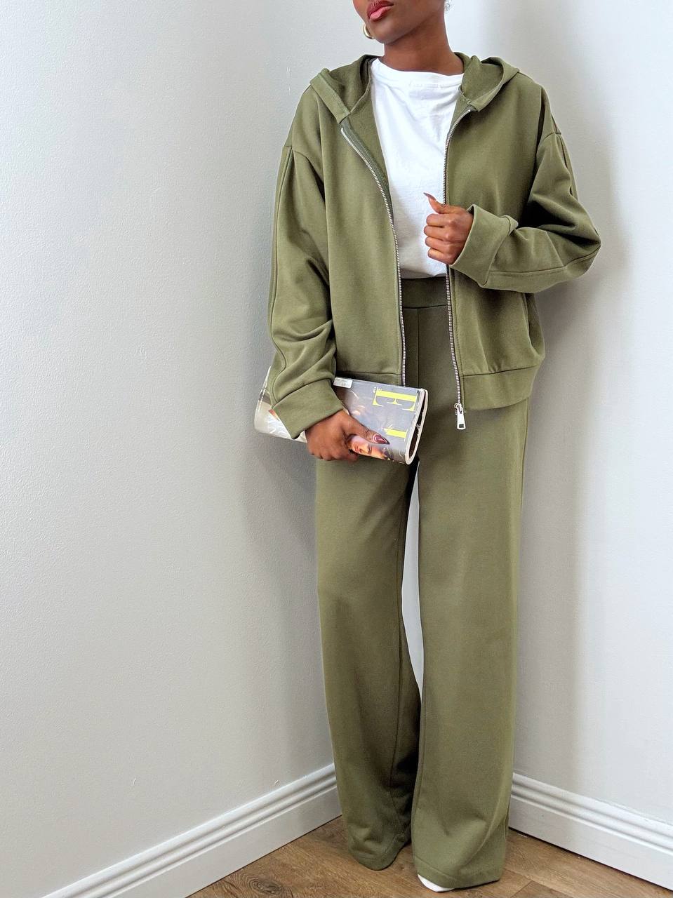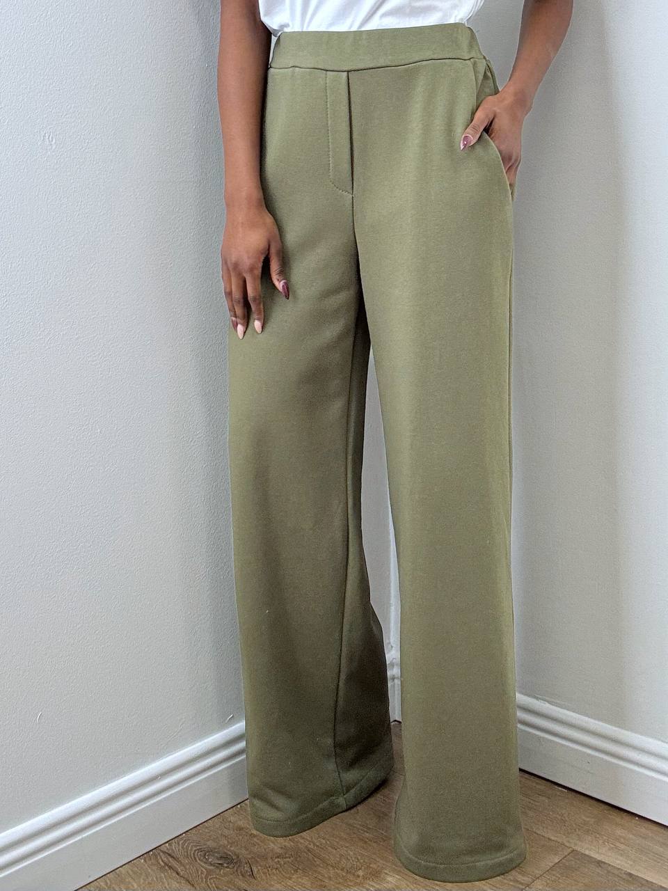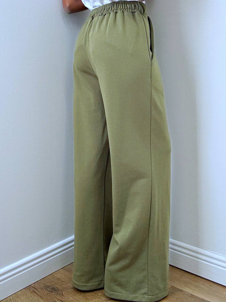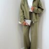 Il pantalone a palazzo completa il set con una linea ampia e fluida che valorizza la silhouette. Il punto vita è elasticizzato nella parte posteriore per garantire una vestibilità confortevole e adattabile, mentre le taschine laterali aggiungono funzionalità senza rinunciare allo stile.