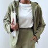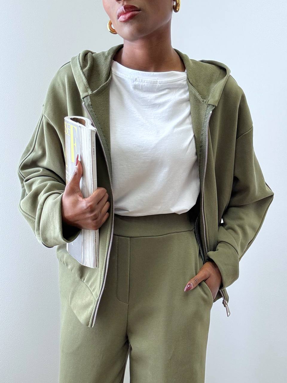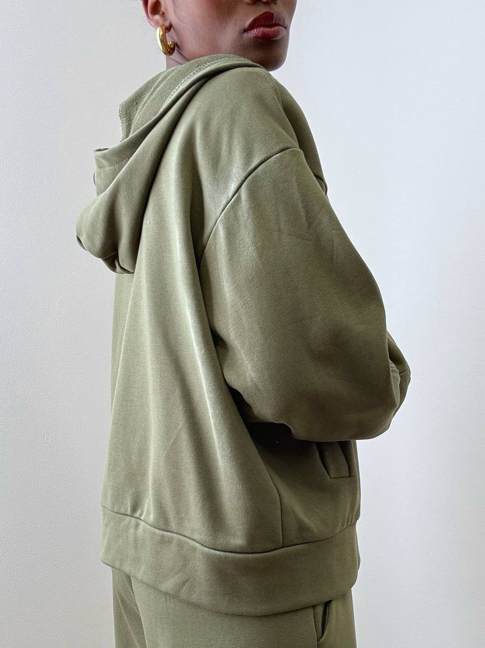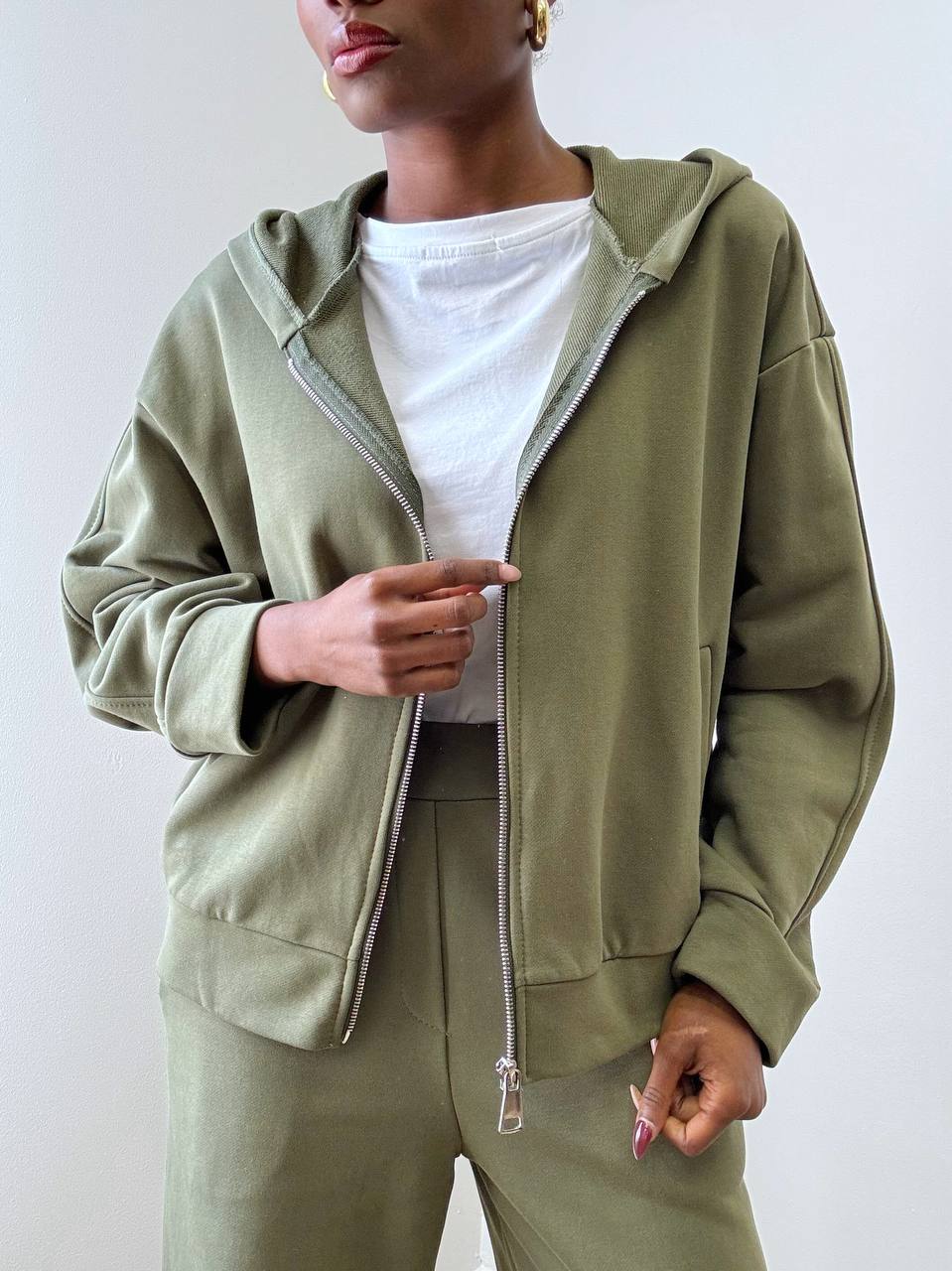 La felpa è caratterizzata da zip centrale con metalleria argentata che illumina il design e dona un tocco moderno. Presenta pratiche taschine frontali e cappuccio, dettaglio che aggiunge un’allure sportiva e contemporanea, ideale per un look dinamico e versatile.