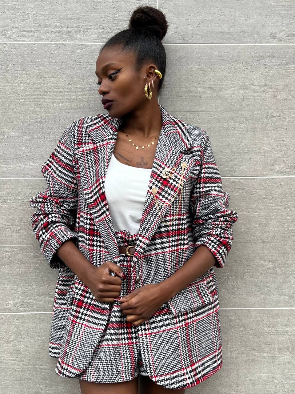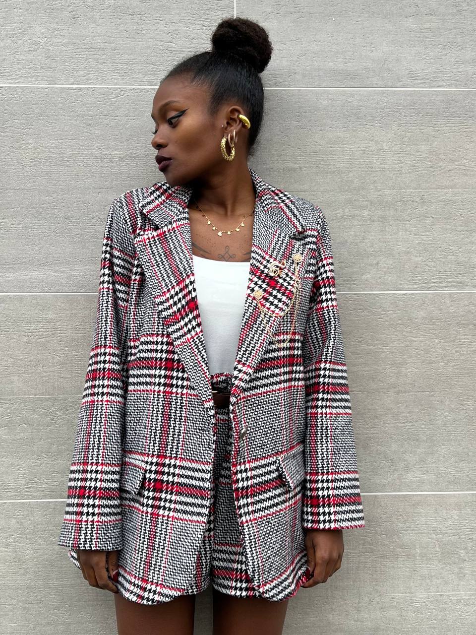 Giacca a tinta unita con stampa check con dettaglio spilla gioiello, con finte tasche sui lati a monopetto con bottone con scollo a V.